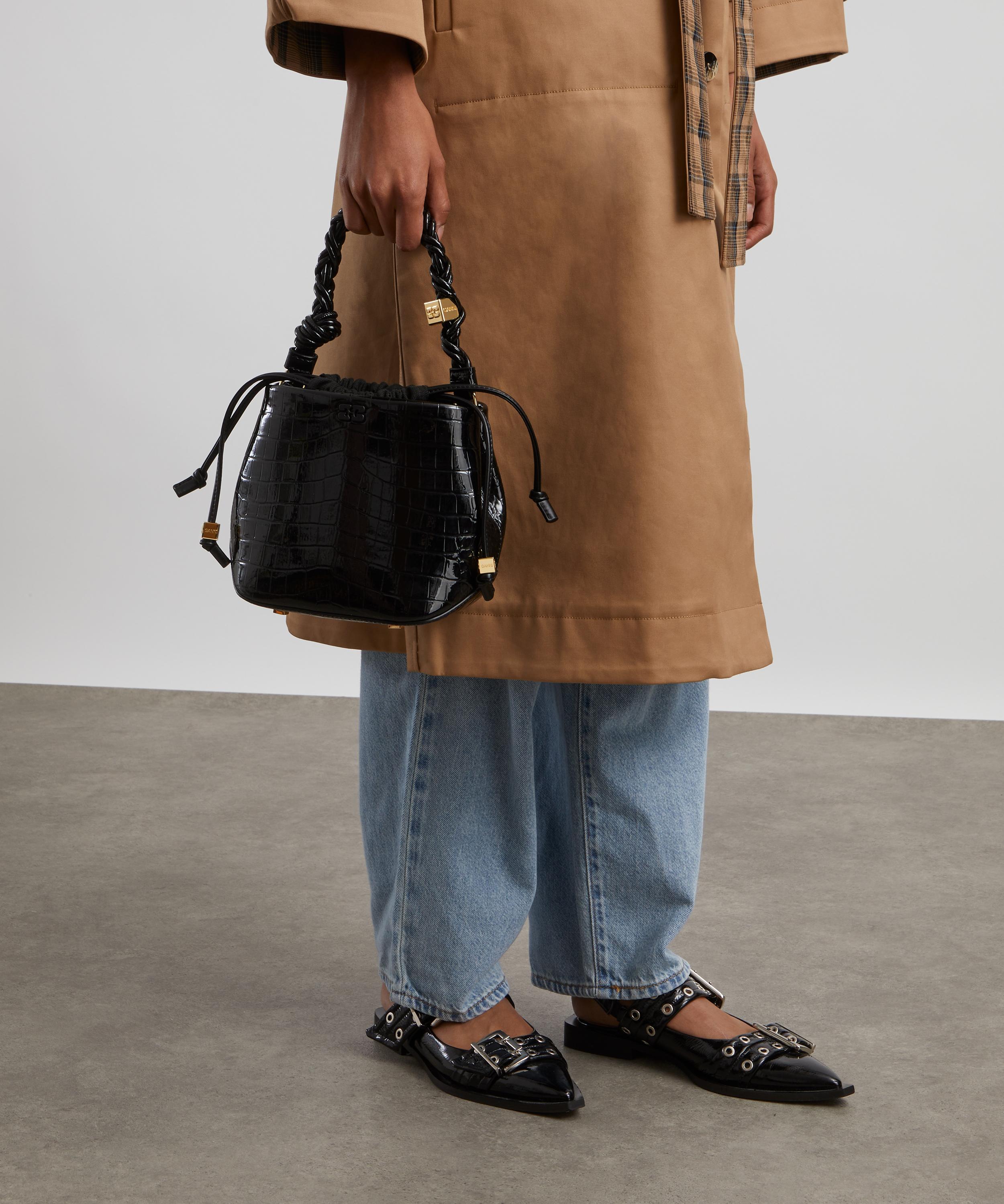 Danish label Ganni showcases its' its playful approach to Scandi-cool design with this sleek leather bucket bag - a practical and fun addition to your everyday line-up, you won't want to swap it out. Crafted from a croco patent leather, this slouchy bag boasts a bucket silhouette and is fitted with a braided top handle, tonal butterfly branding on the front, and a detachable long strap for versatile styling.