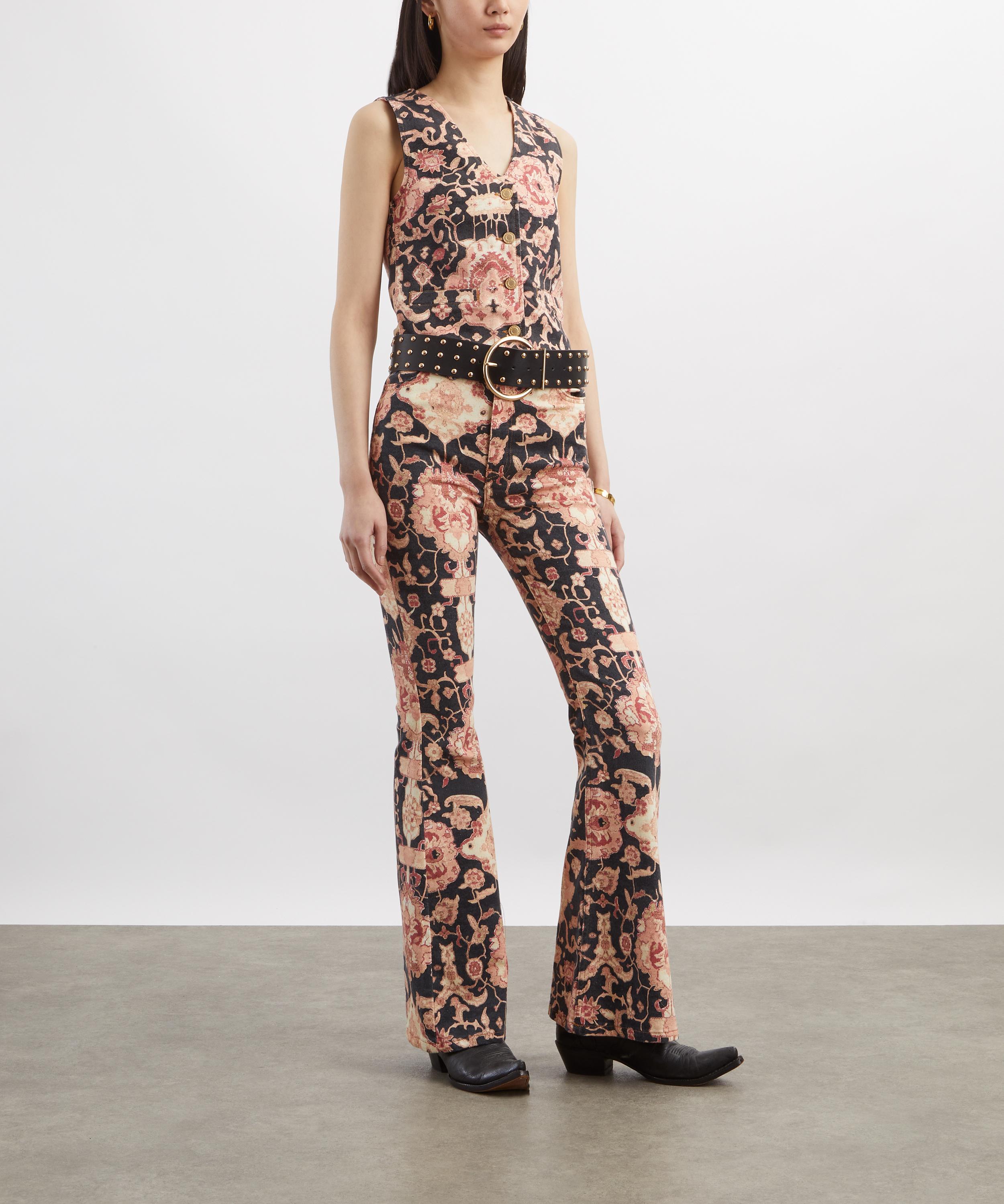 Adorned with a tapestry-style pattern inspired by antique textiles and vintage carpets, this waistcoat is crafted from washed cotton and features a V-neckline, gold-button placket, and mock pockets. Pair it with the matching flares for a head-turning two-piece.