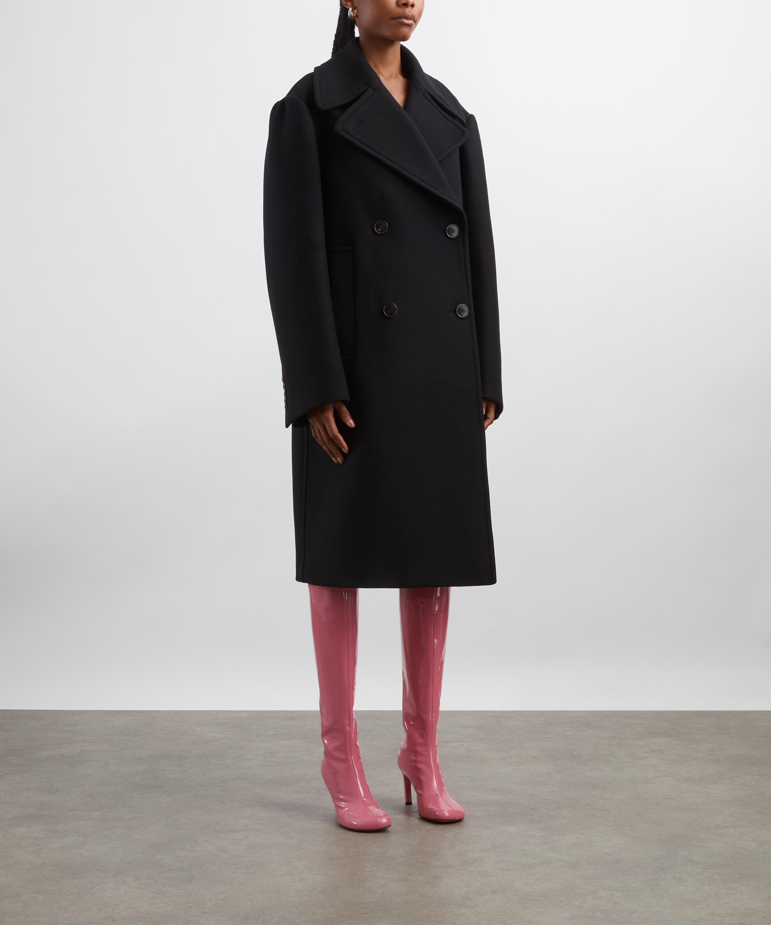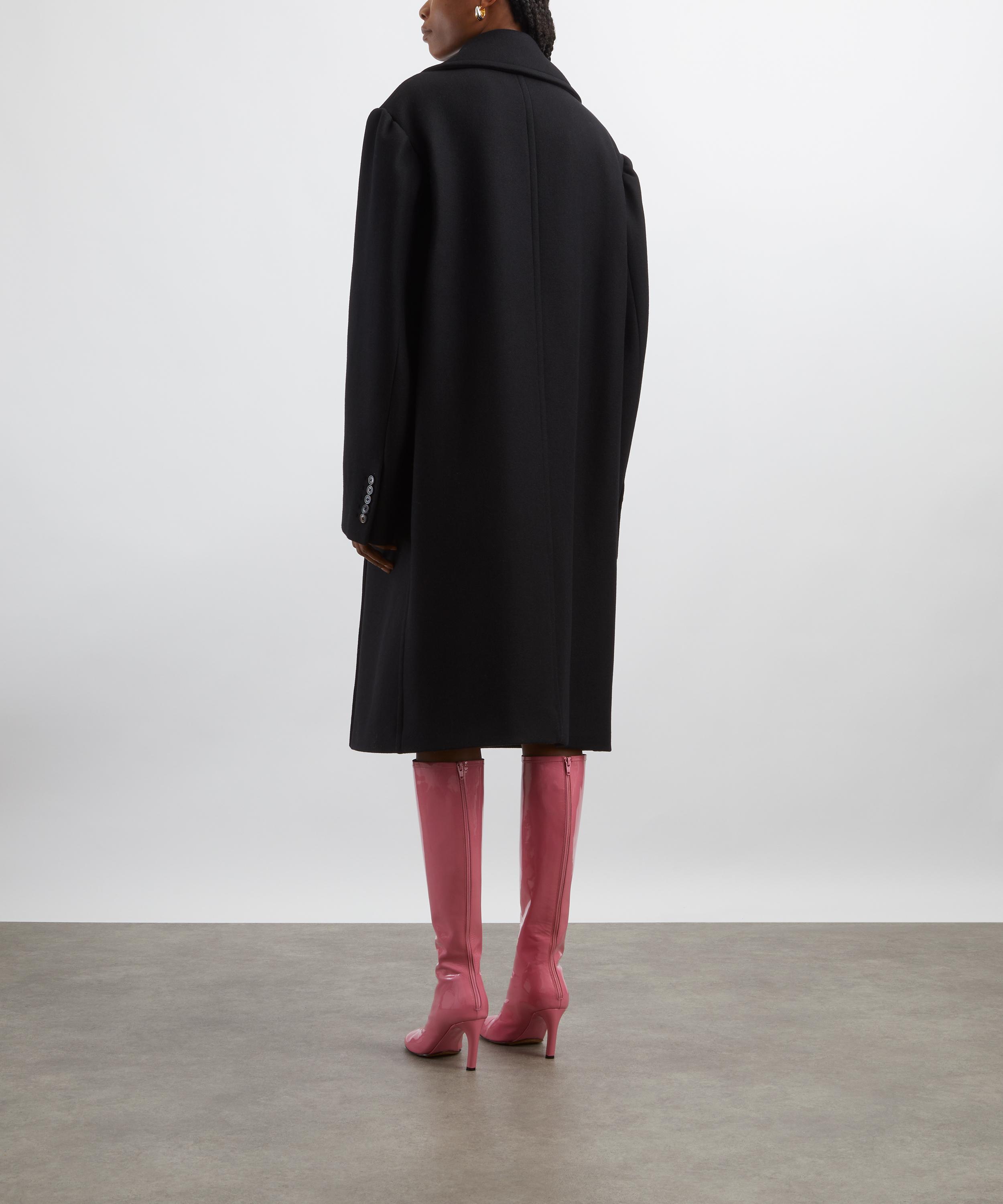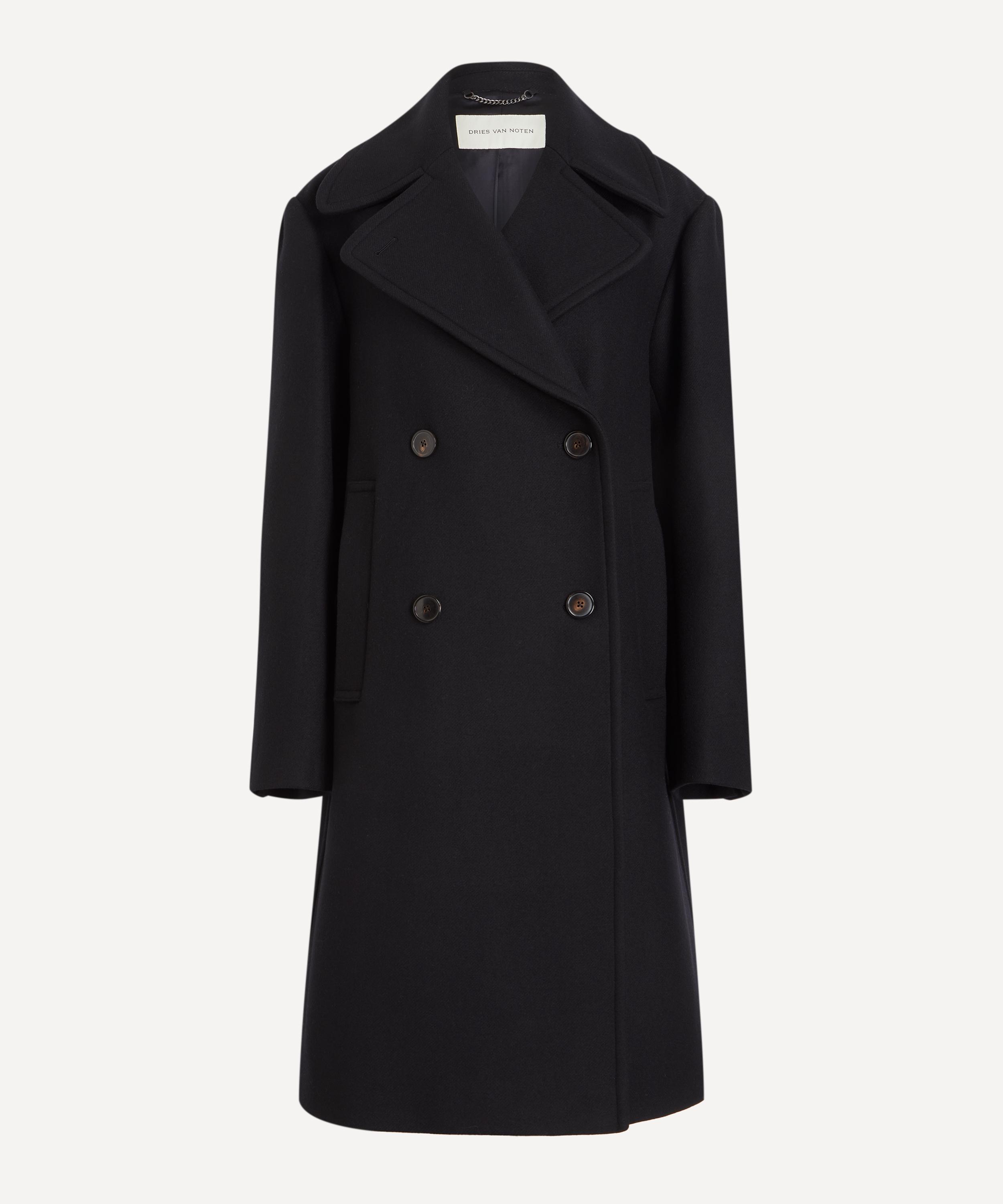 This Black Double-Breasted Wool-Blend Coat from Dries Van Noten exemplifies the Belgian label’s avant-garde approach to contemporary fashion.
