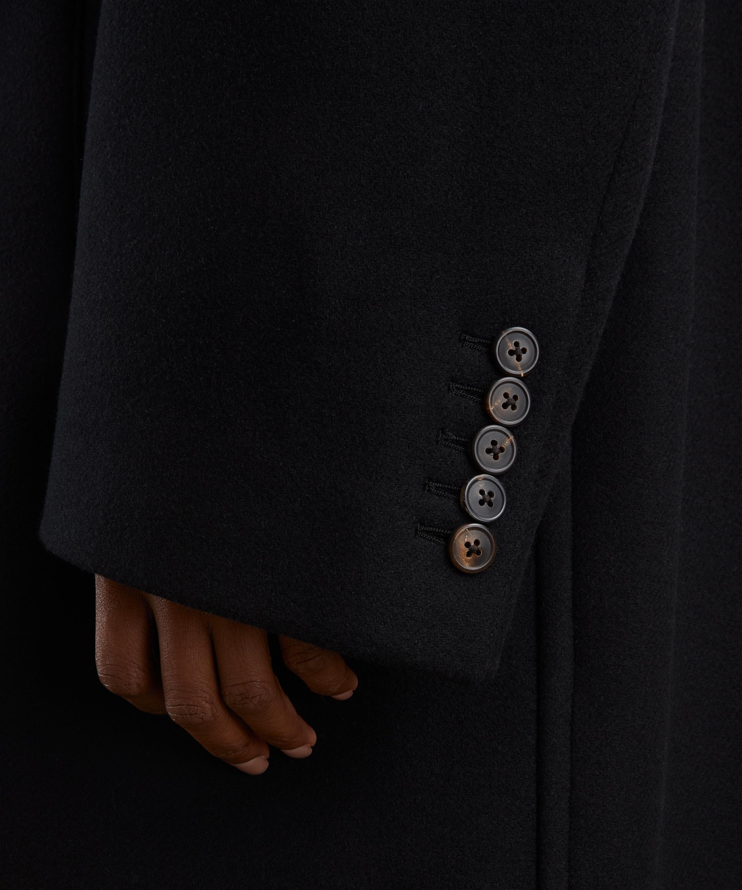Tailored from a premium wool blend, this double-breasted coat features an oversized lapel collar, button fastening, and front hand-warmer pockets - offering timeless structure with a modern edge.