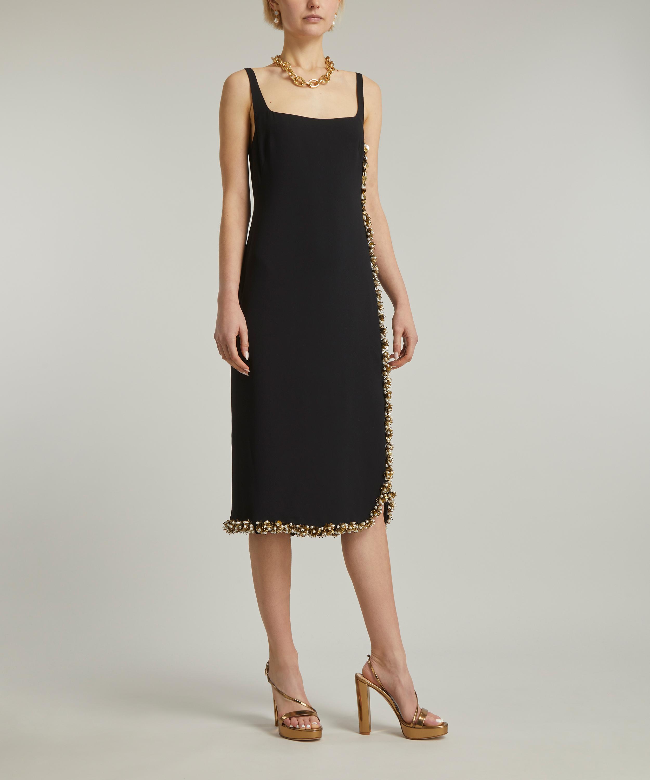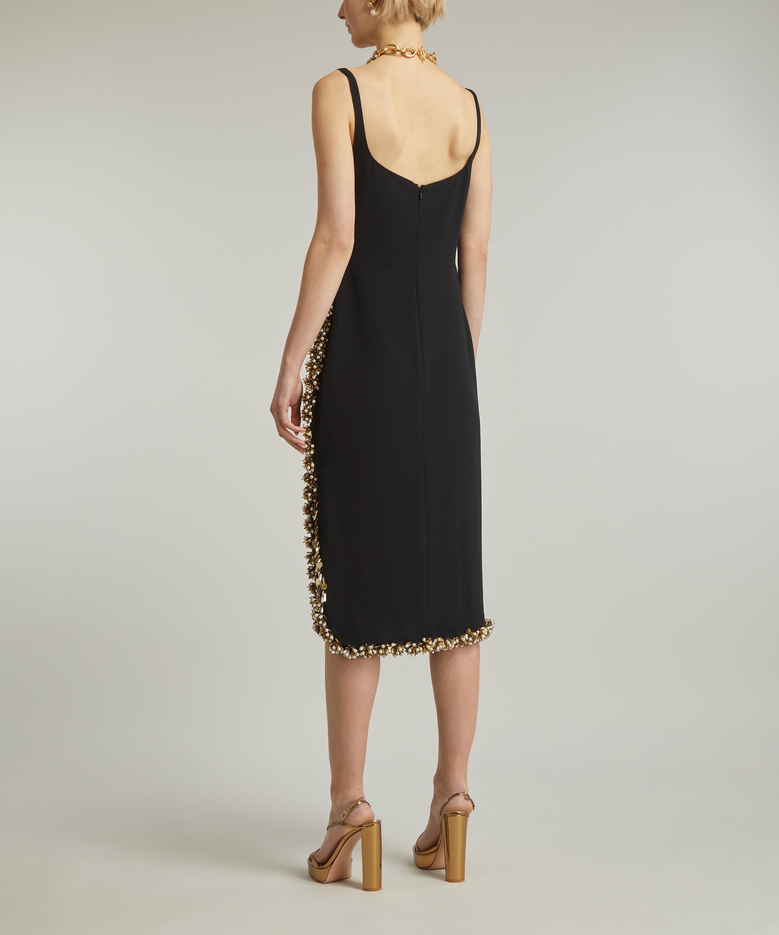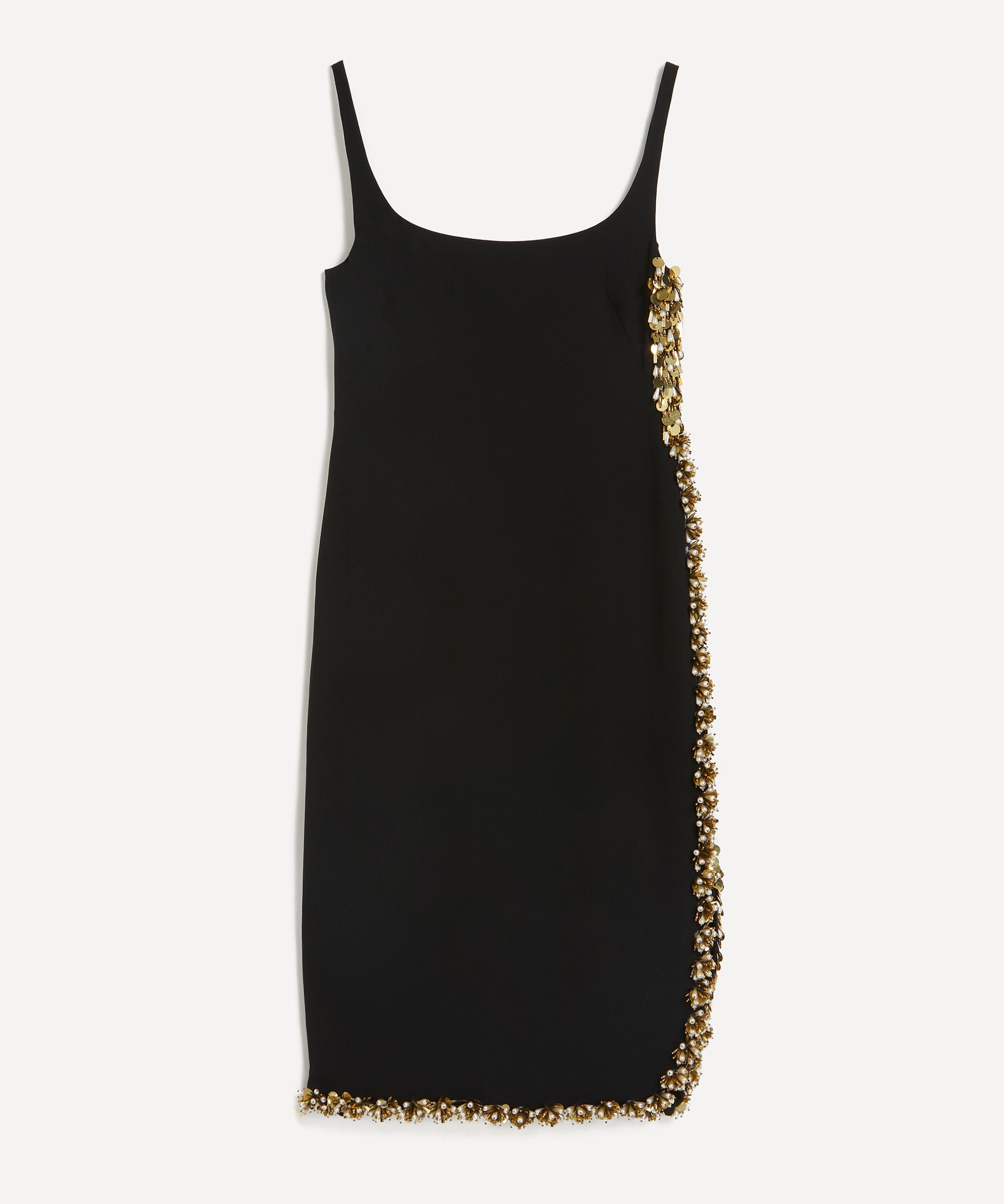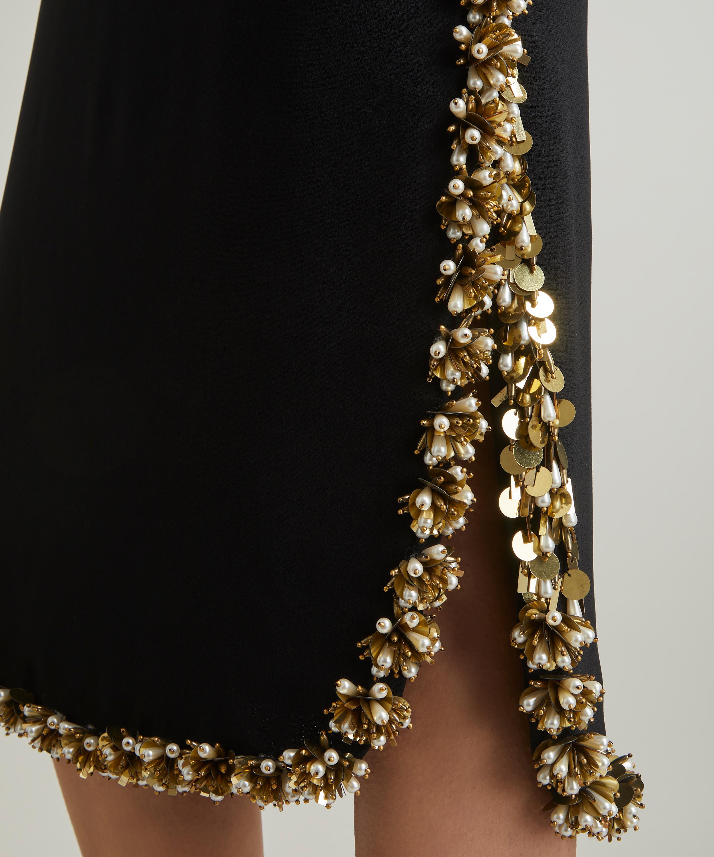 Effortlessly refined, this little black dress exudes elegance with its flattering slim fit and scoop neckline. Crafted from crepe, it’s intricately detailed with beaded gold and pearl embellished trims.