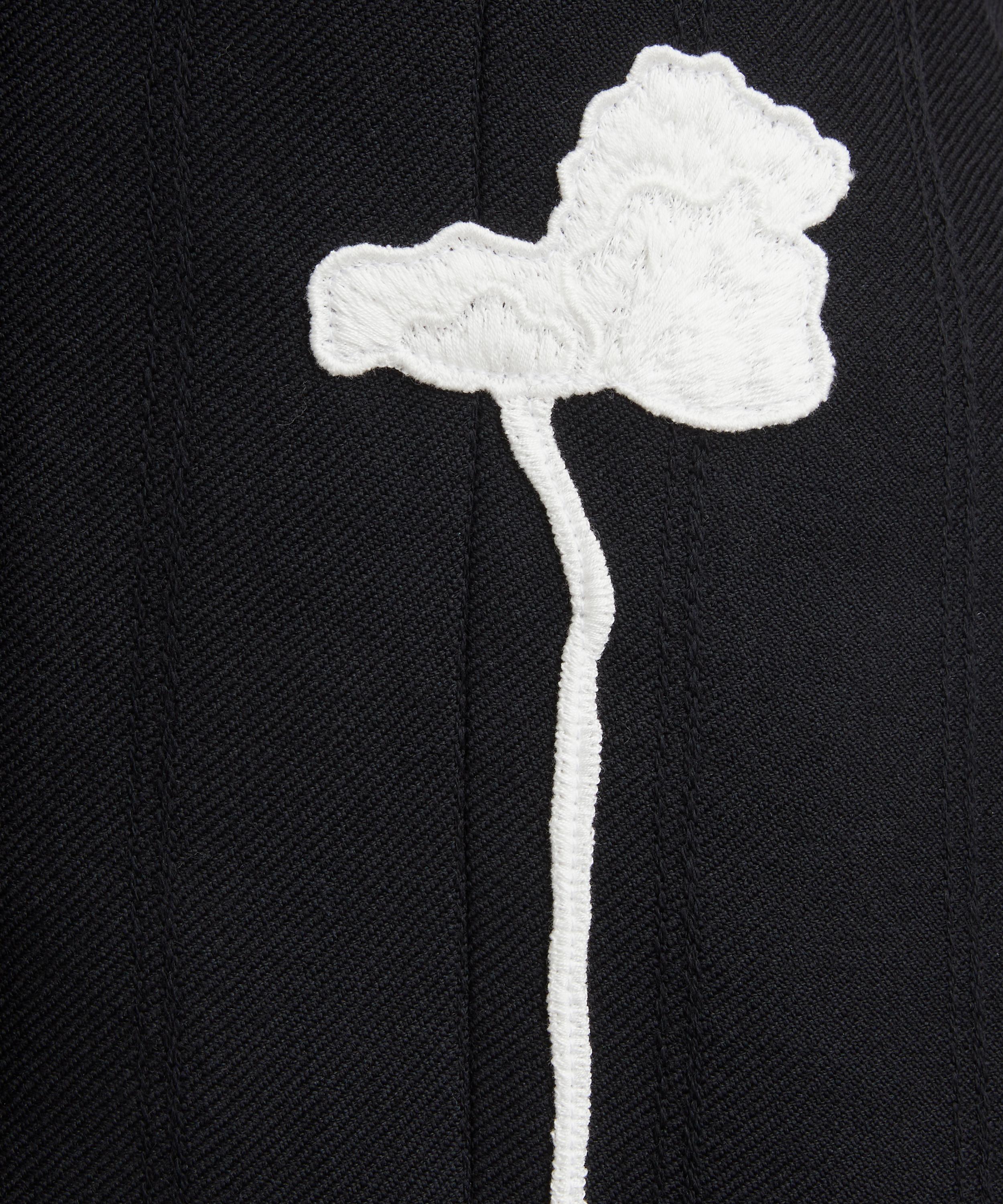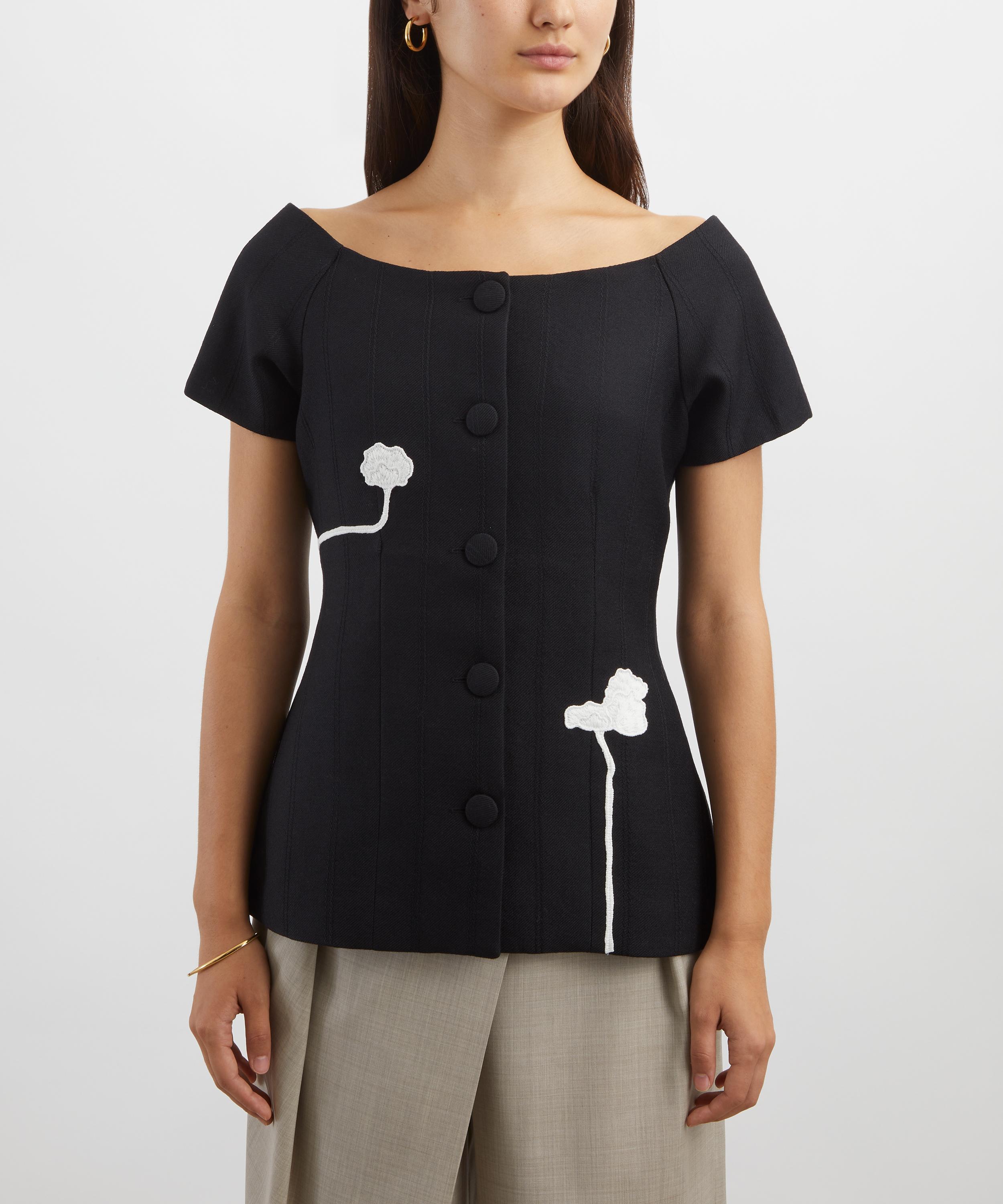 Crafted from virgin wool, the Hishiro top exudes effortless elegance with its structured silhouette, defined by an exaggerated boat neckline, short sleeves, and delicate floral embroidery on either side of its button placket.