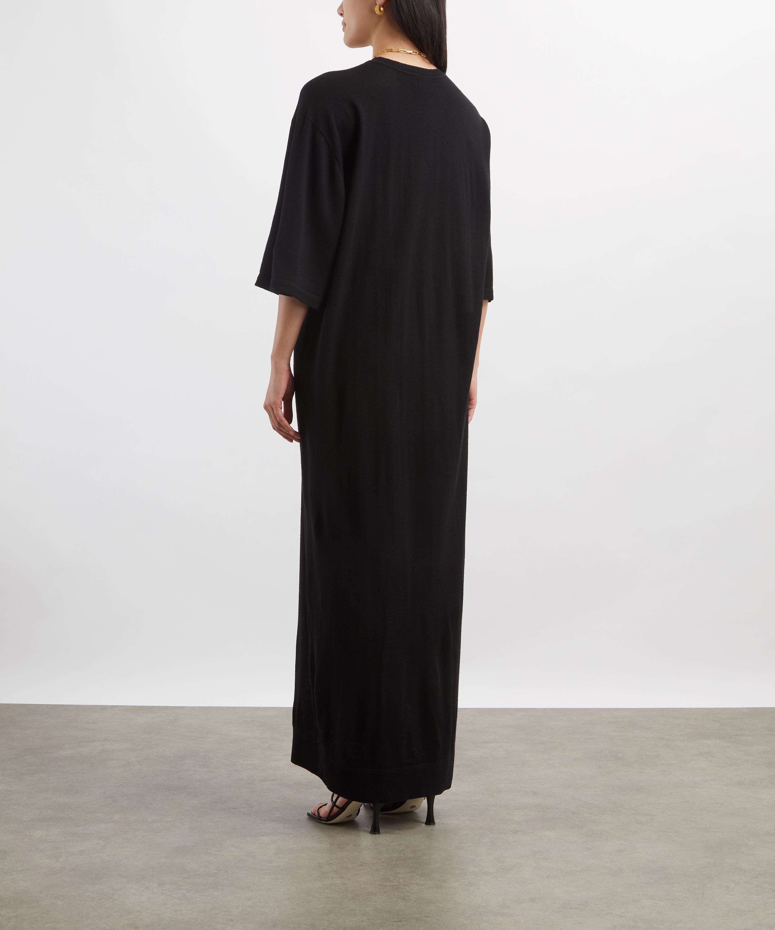 Effortlessly refined, this maxi dress blurs the line between an oversized tee and a fine Merino wool knit. Designed with a ribbed crew neckline, dropped shoulders, and wide sleeves, it transitions seamlessly into evening when styled with a clutch and mules.