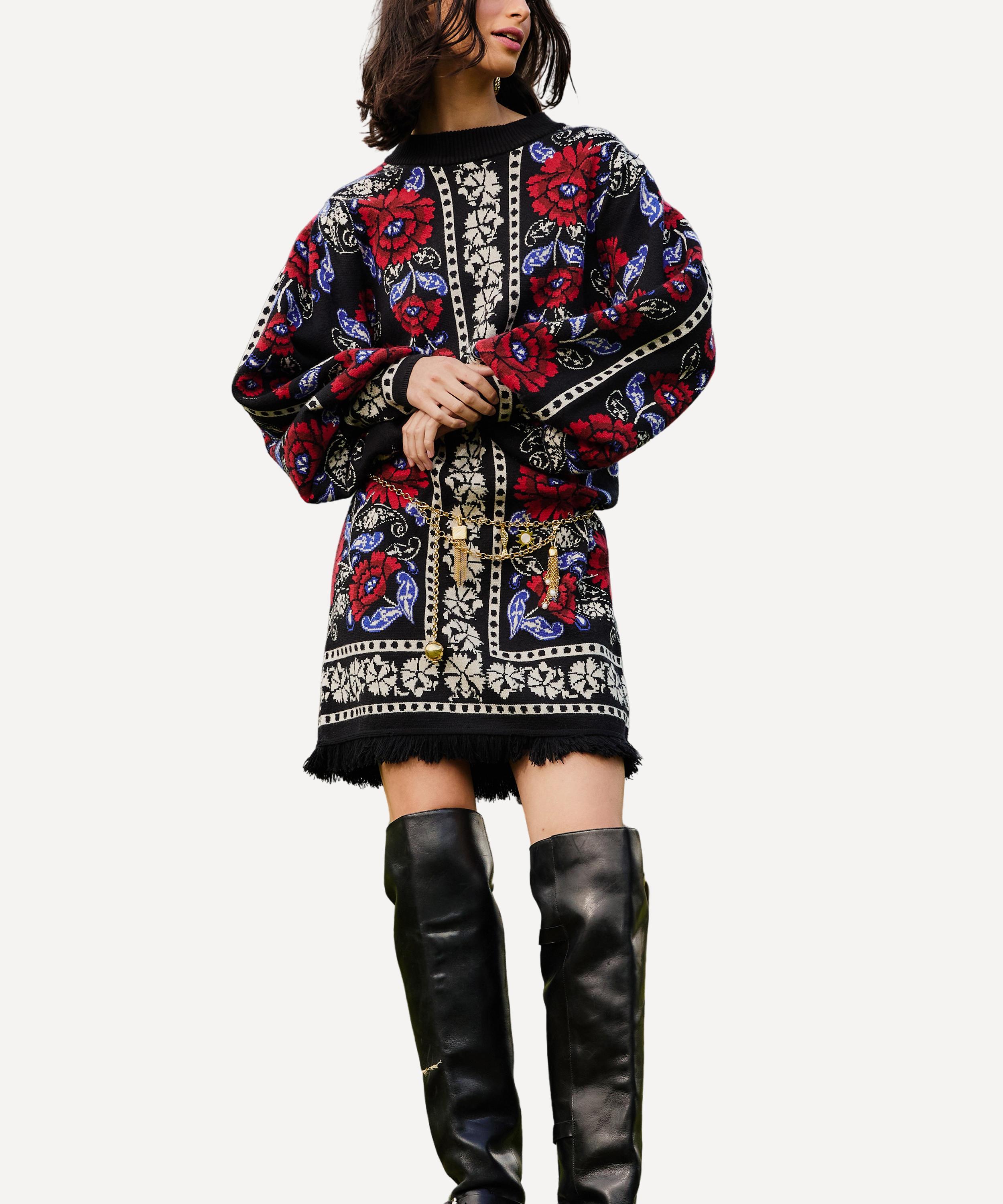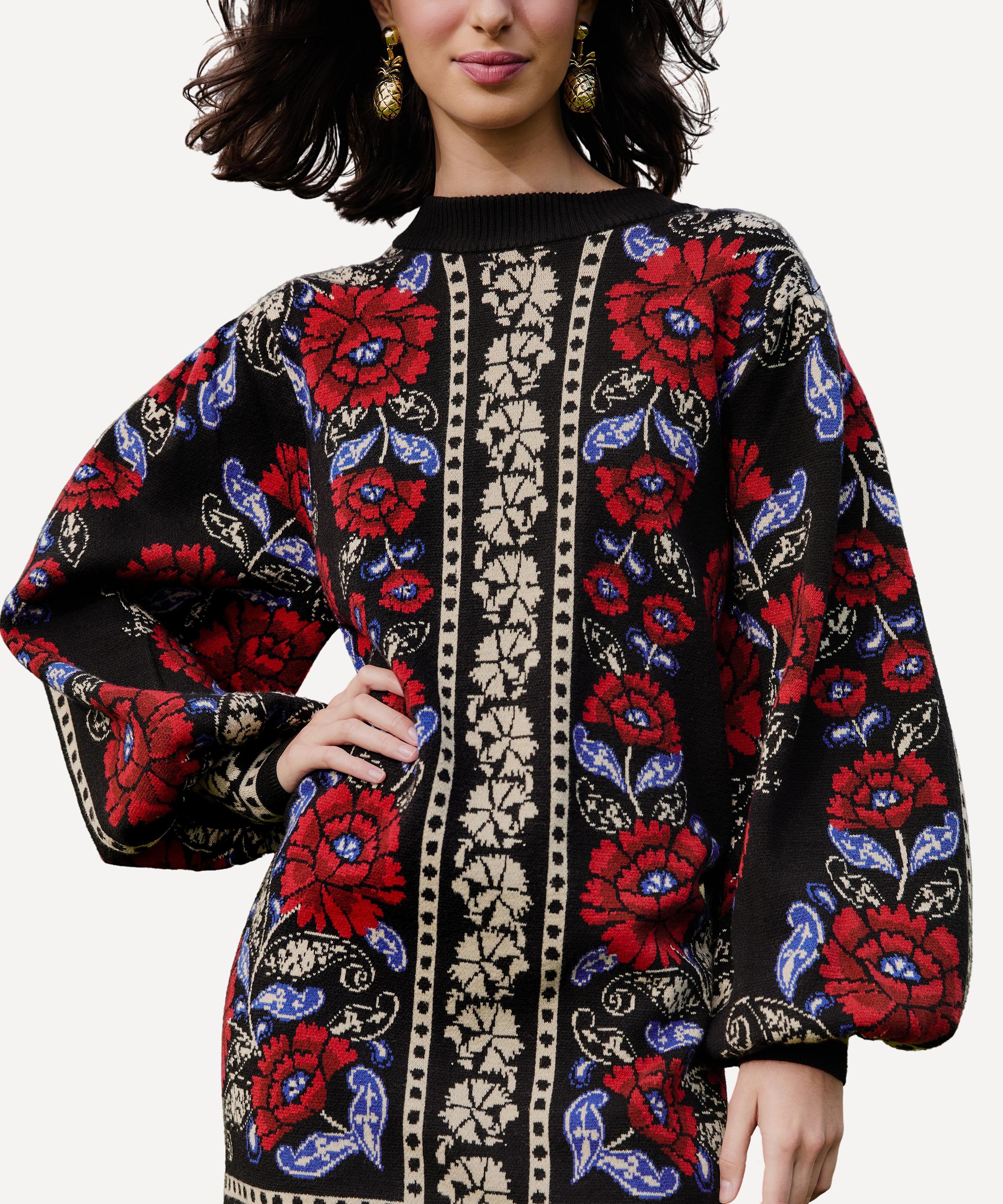 Cozy elegance meets vibrant charm in the Black Valentina Puff Sleeve Knit Dress by FARM Rio. With a high neckline, voluminous puff sleeves, and bold red and blue florals on a black backdrop, this knit dress exudes warmth and artistry. A fringed hem adds a boho touch for effortlessly bold sophistication.