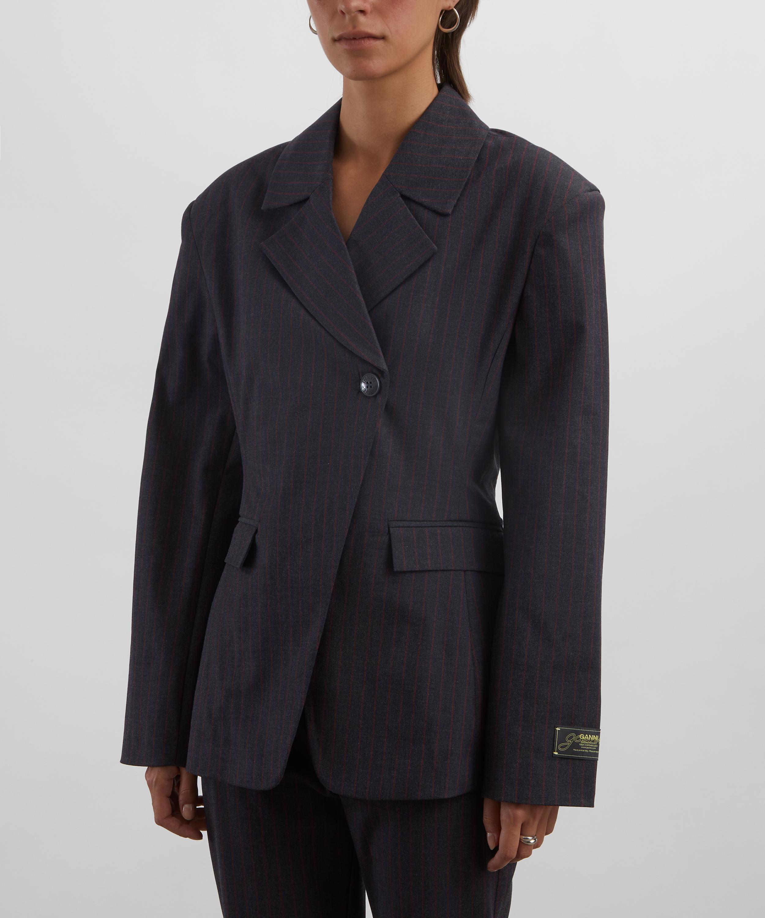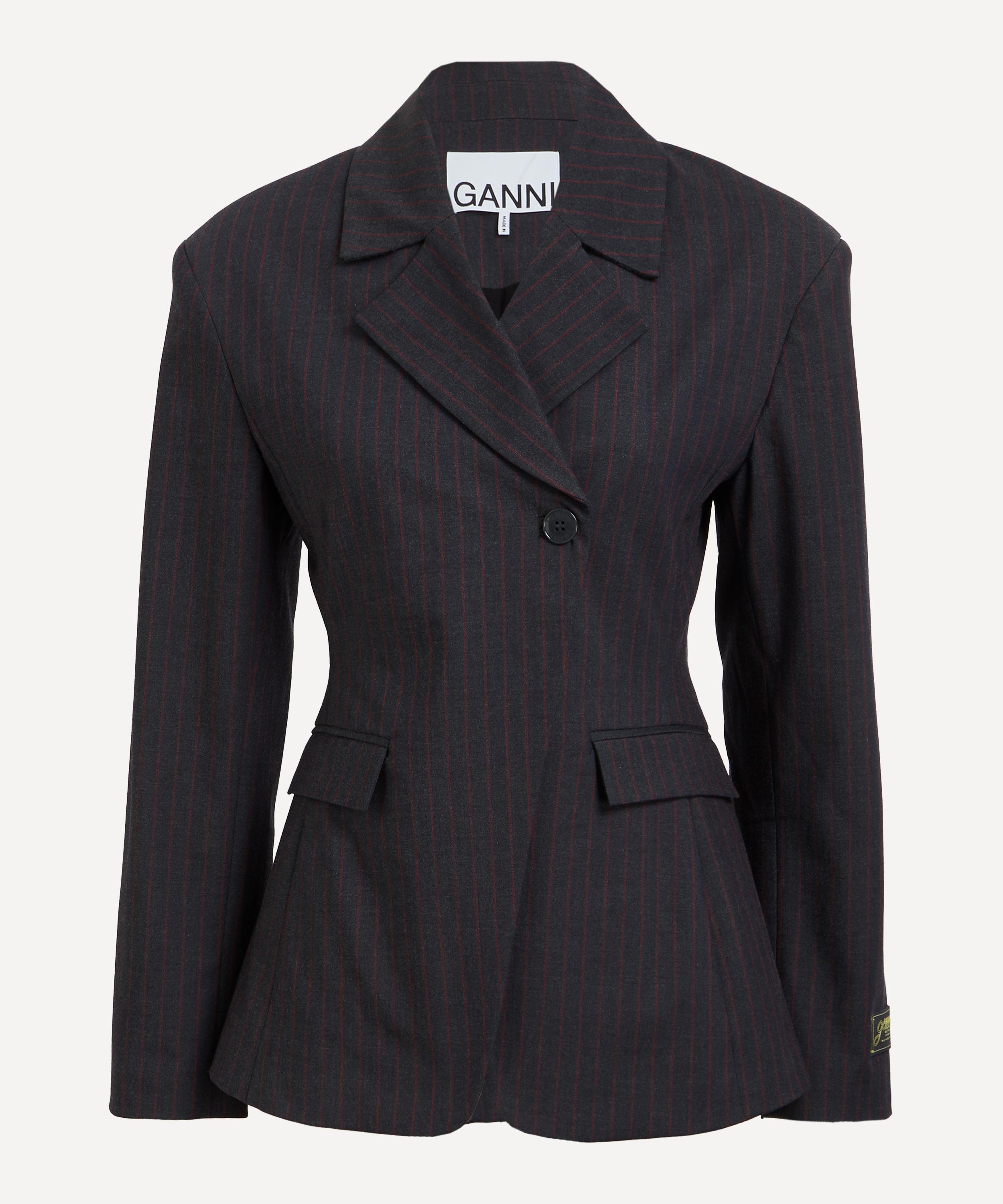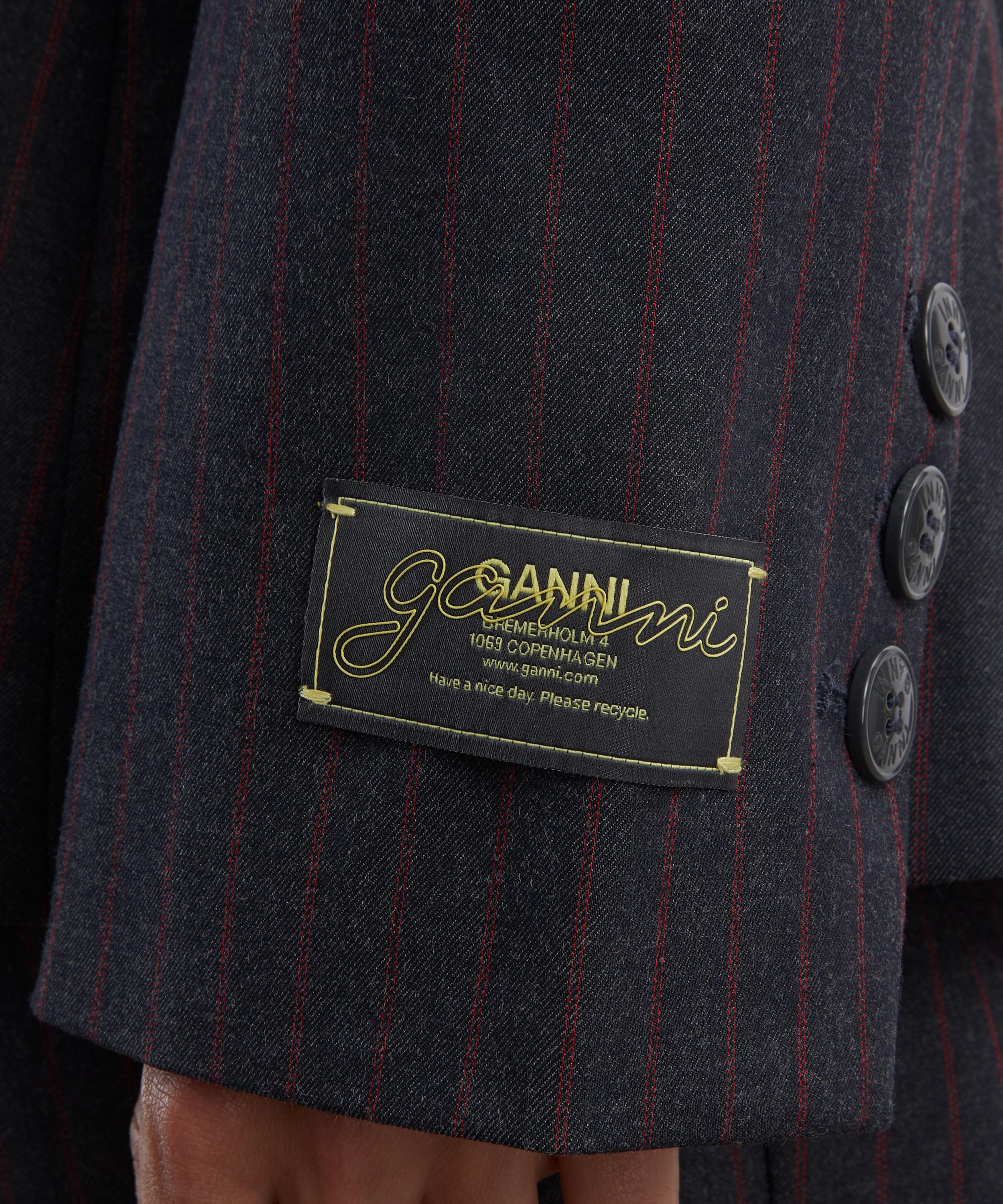 Adorned with fine red pinstripes, this double-breasted blazer nods to classic menswear tailoring with its notched lapels, flap pockets, and single-button closure. A subtle GANNI logo patch on the sleeve adds a signature finish.