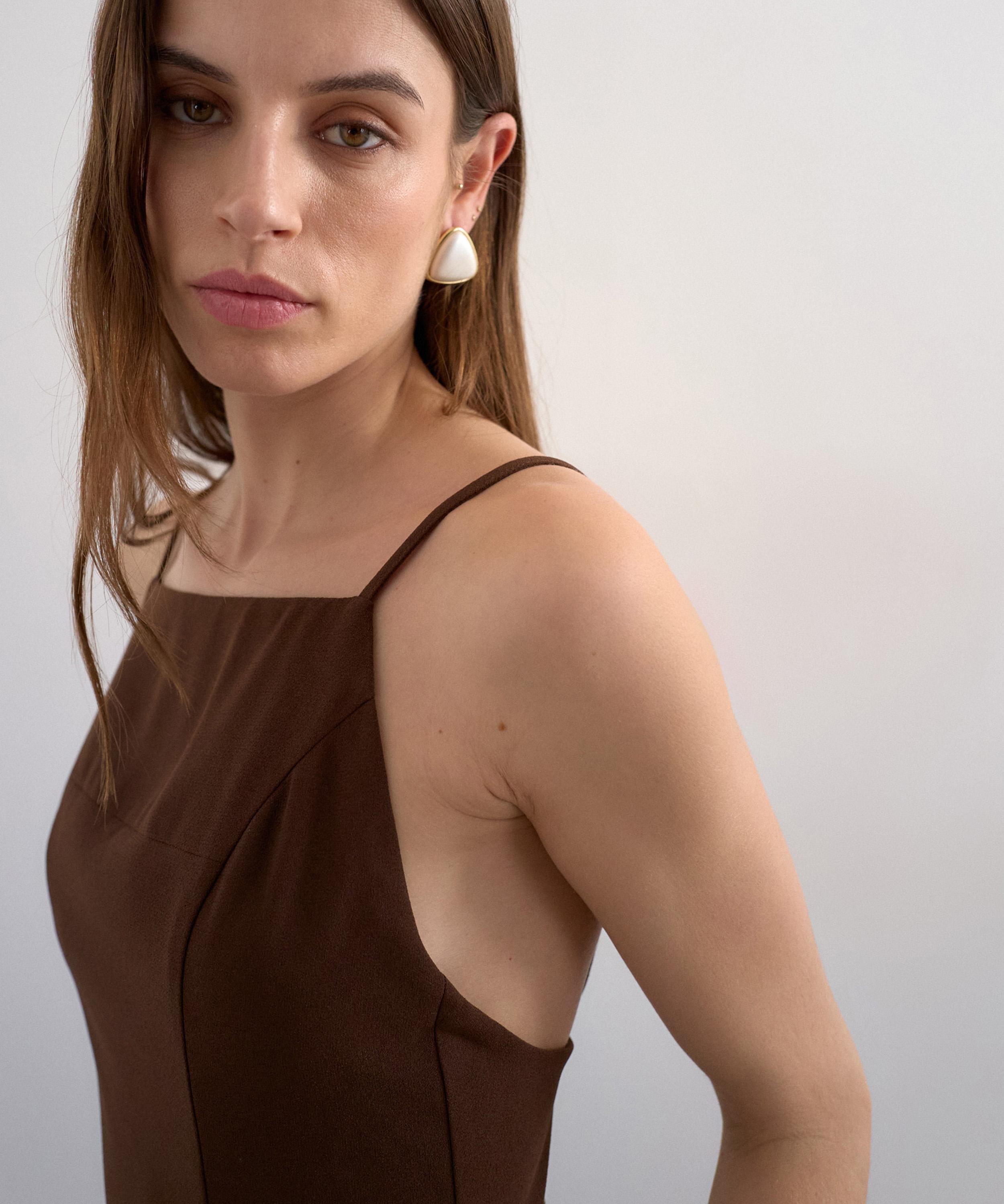 Crafted from lightweight chiffon, this elegant maxi dress features a clean square neckline and adjustable spaghetti straps. A dropped waist is accented with pleated godets, creating a softly flowing, flattering silhouette with graceful movement.
