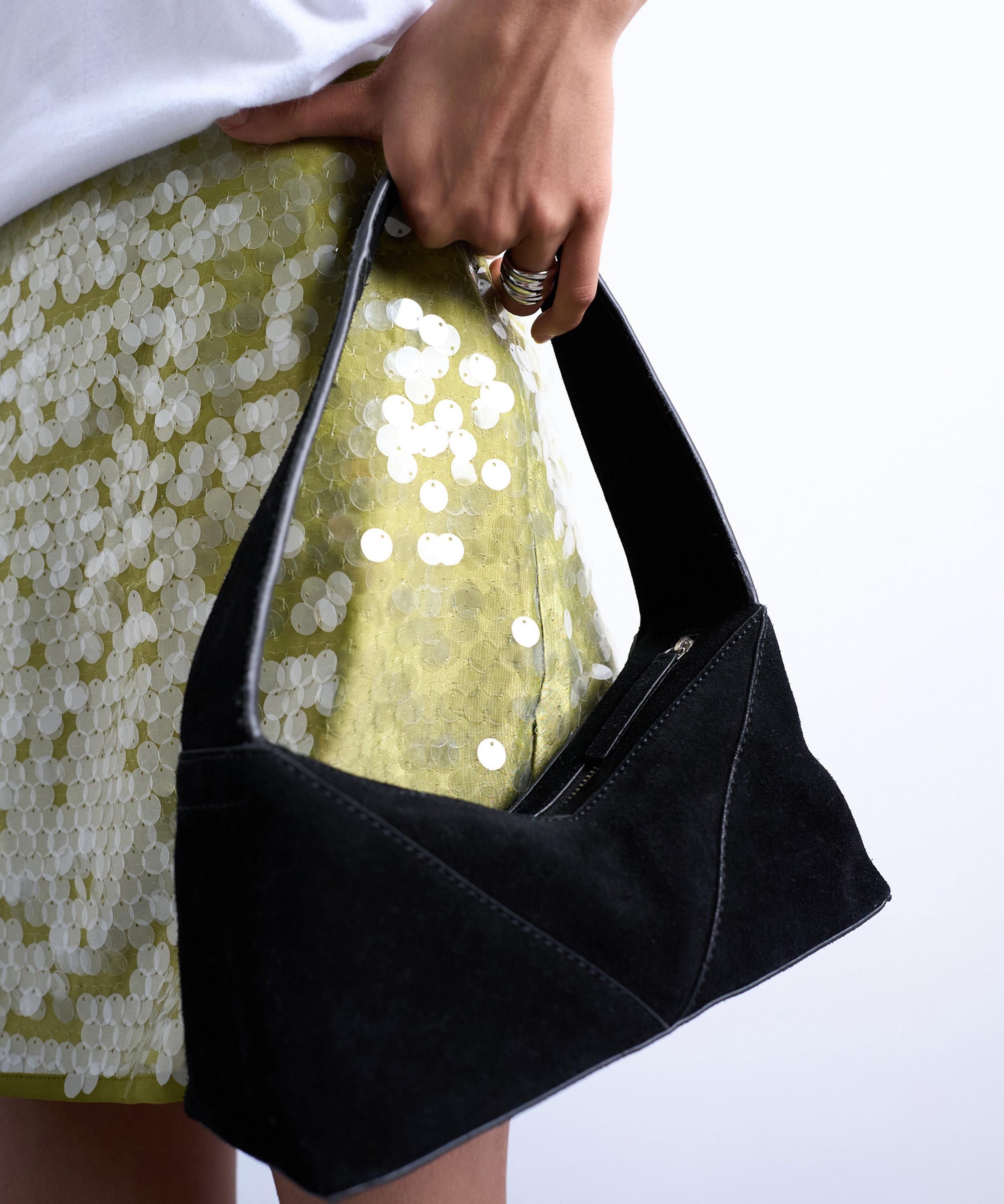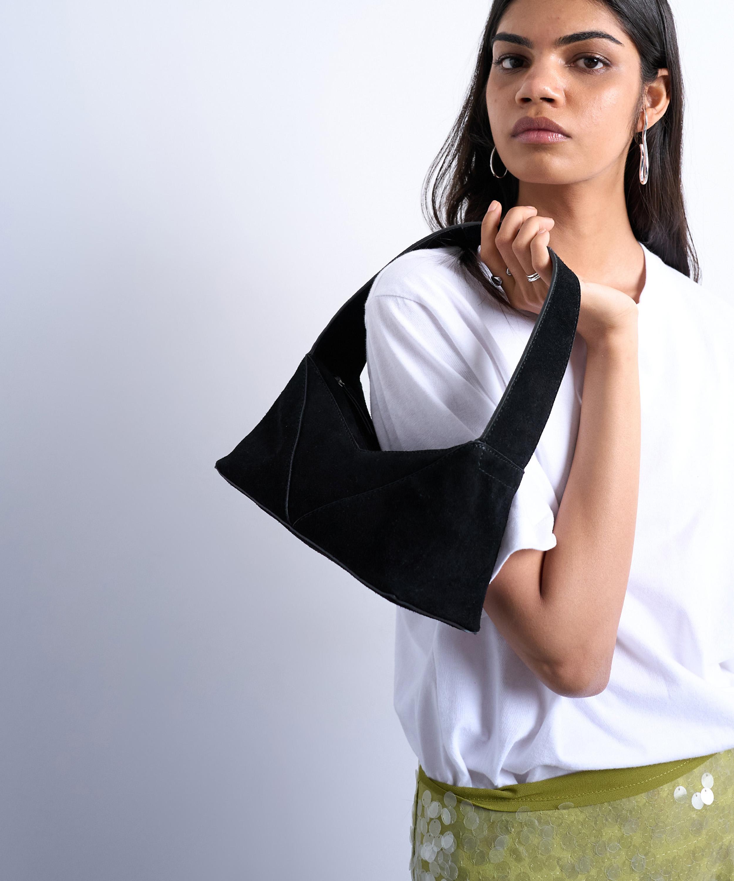 Crafted from pure suede with a soft textured feel, the Safia bag features a compact design with a wide shoulder strap, panel detailing, and a zip-top fastening for easy access – perfect for carrying all your essentials in style.