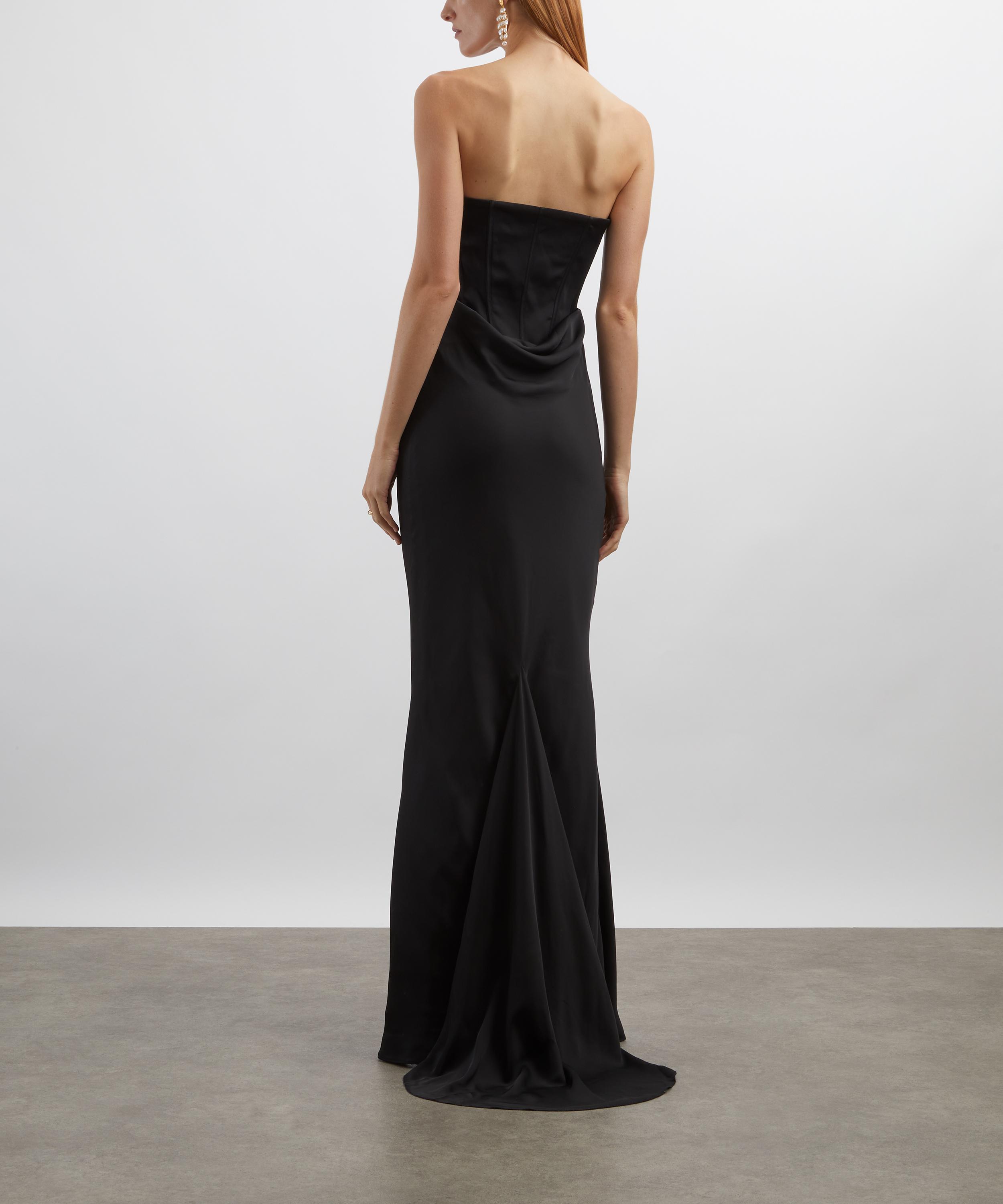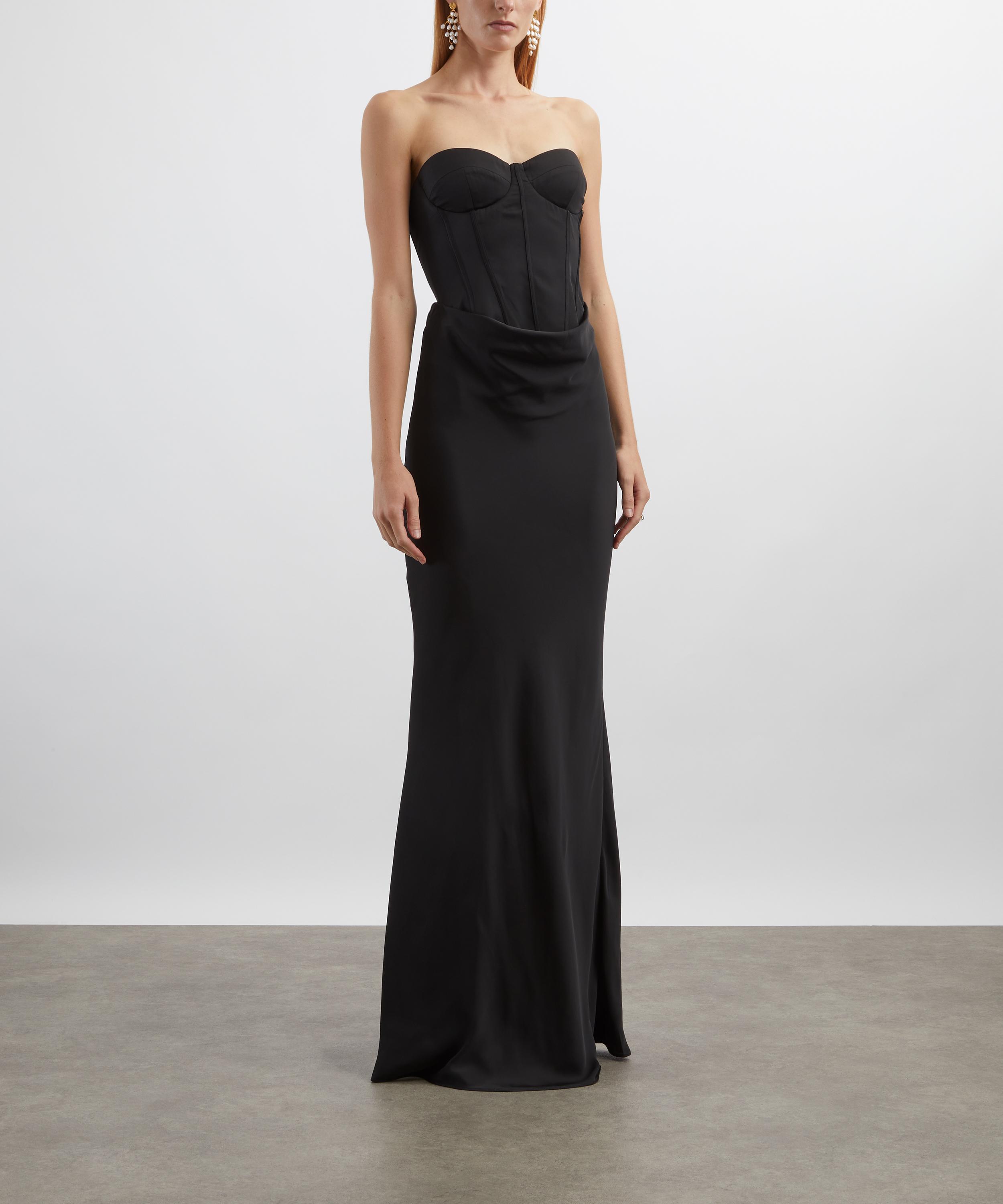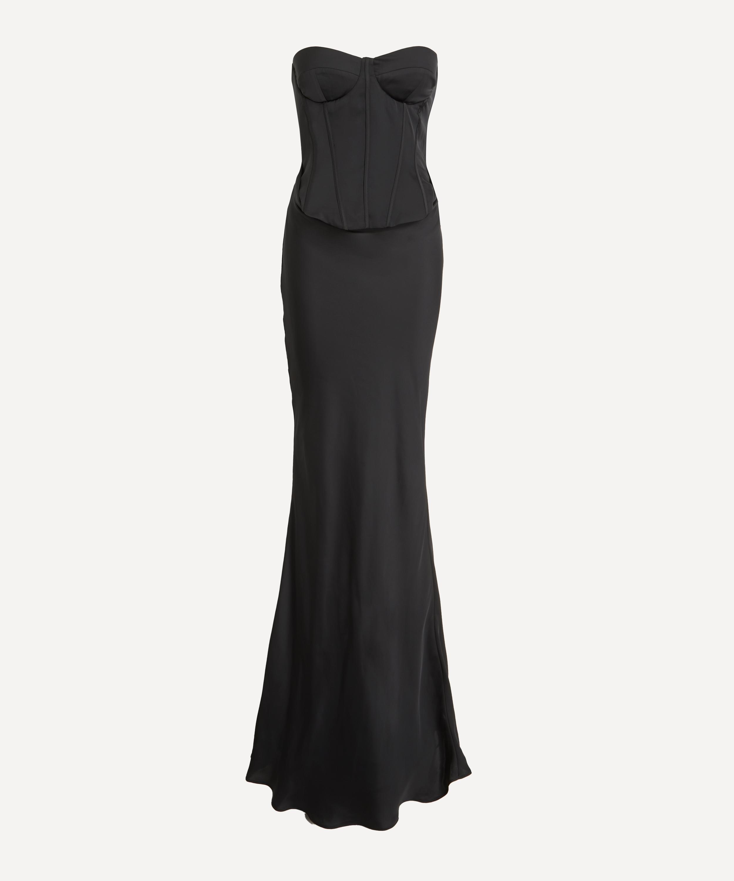The Black Satin Corset Maxi Dress from ROTATE Birger Christensen brings a bold dose of Copenhagen cool to your evening wardrobe.