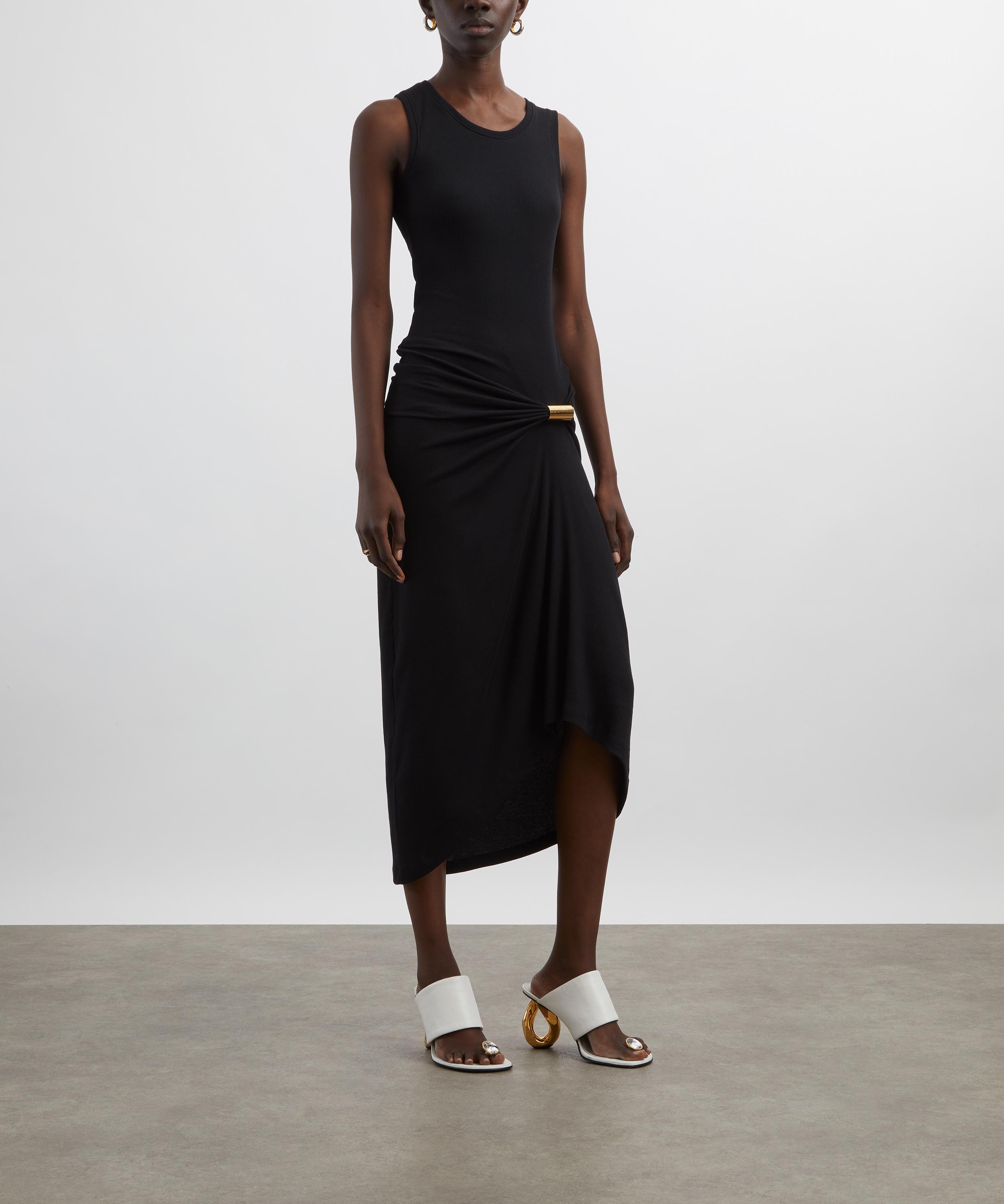 Crafted from lightweight stretch ribbed cotton, this midi dress is designed for a close fit through the bodice and features gathered detailing across the front. A detachable LOEWE-engraved metal embellishment adds a sculptural element - and a signature finish.