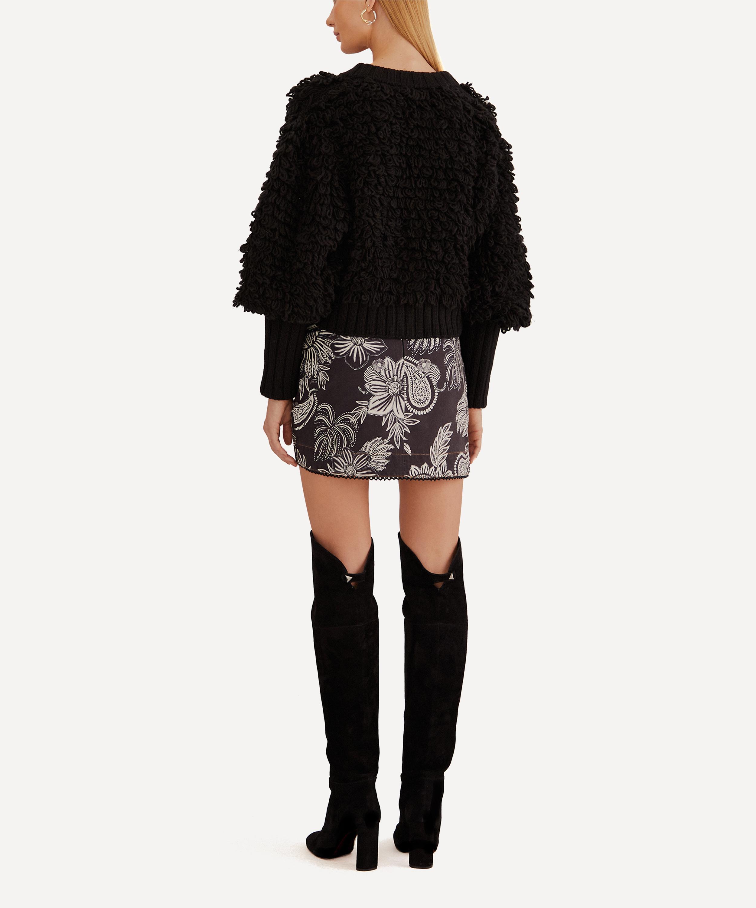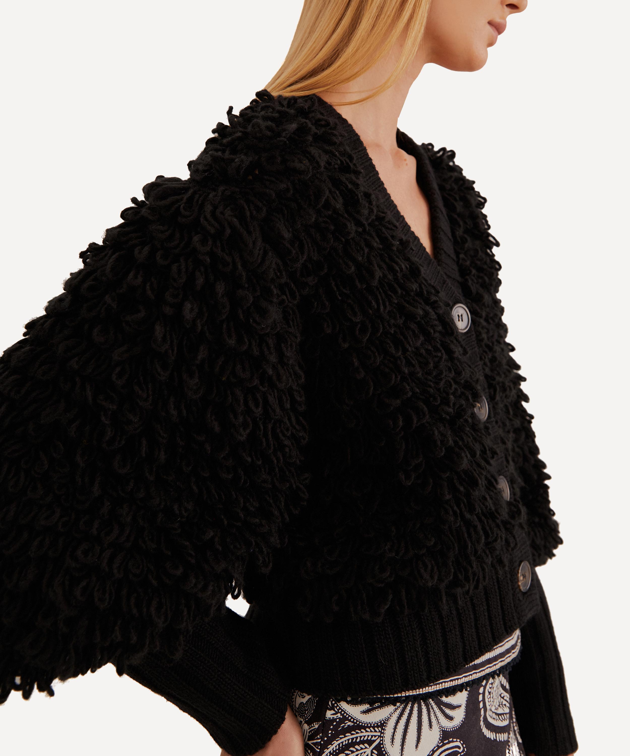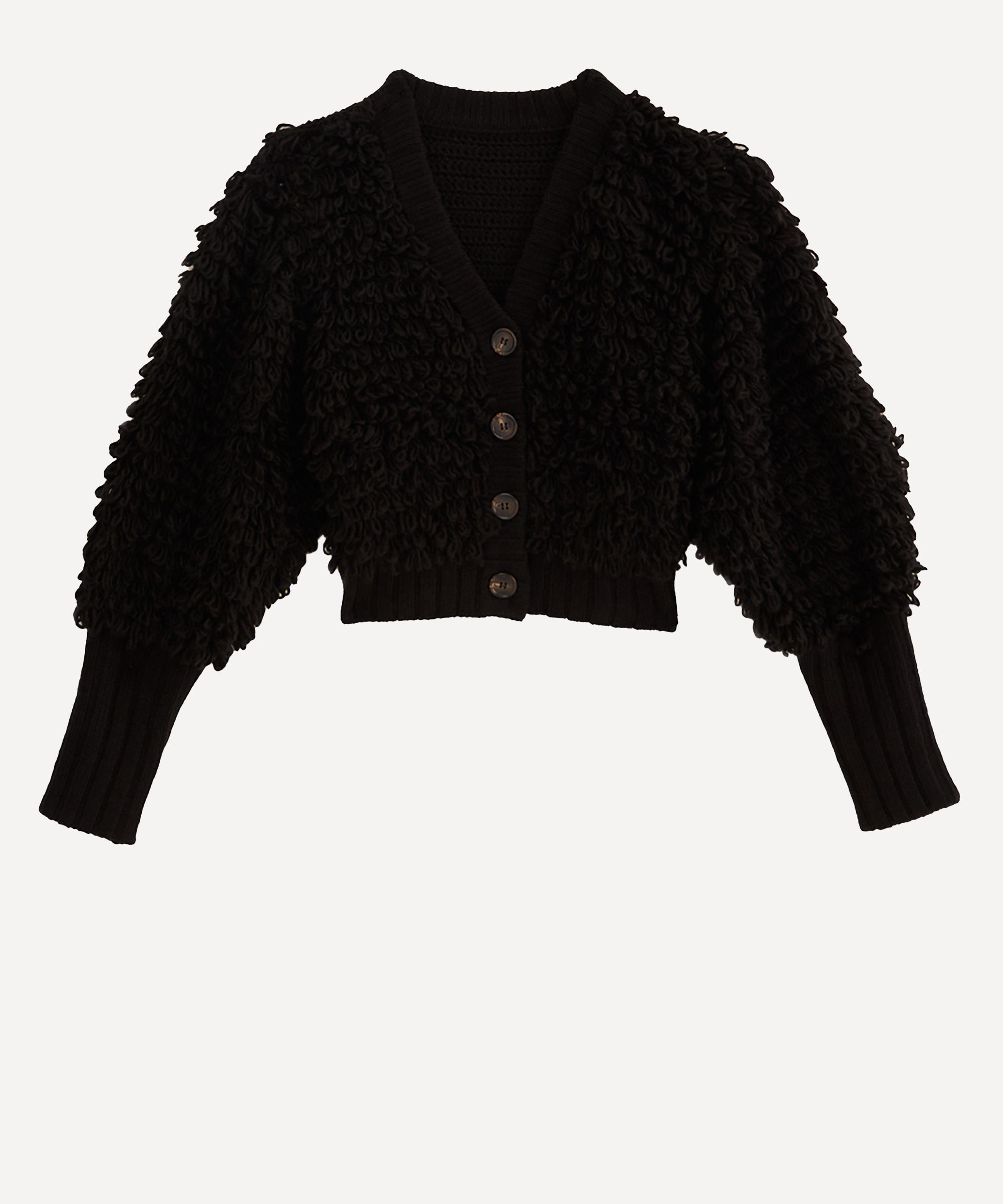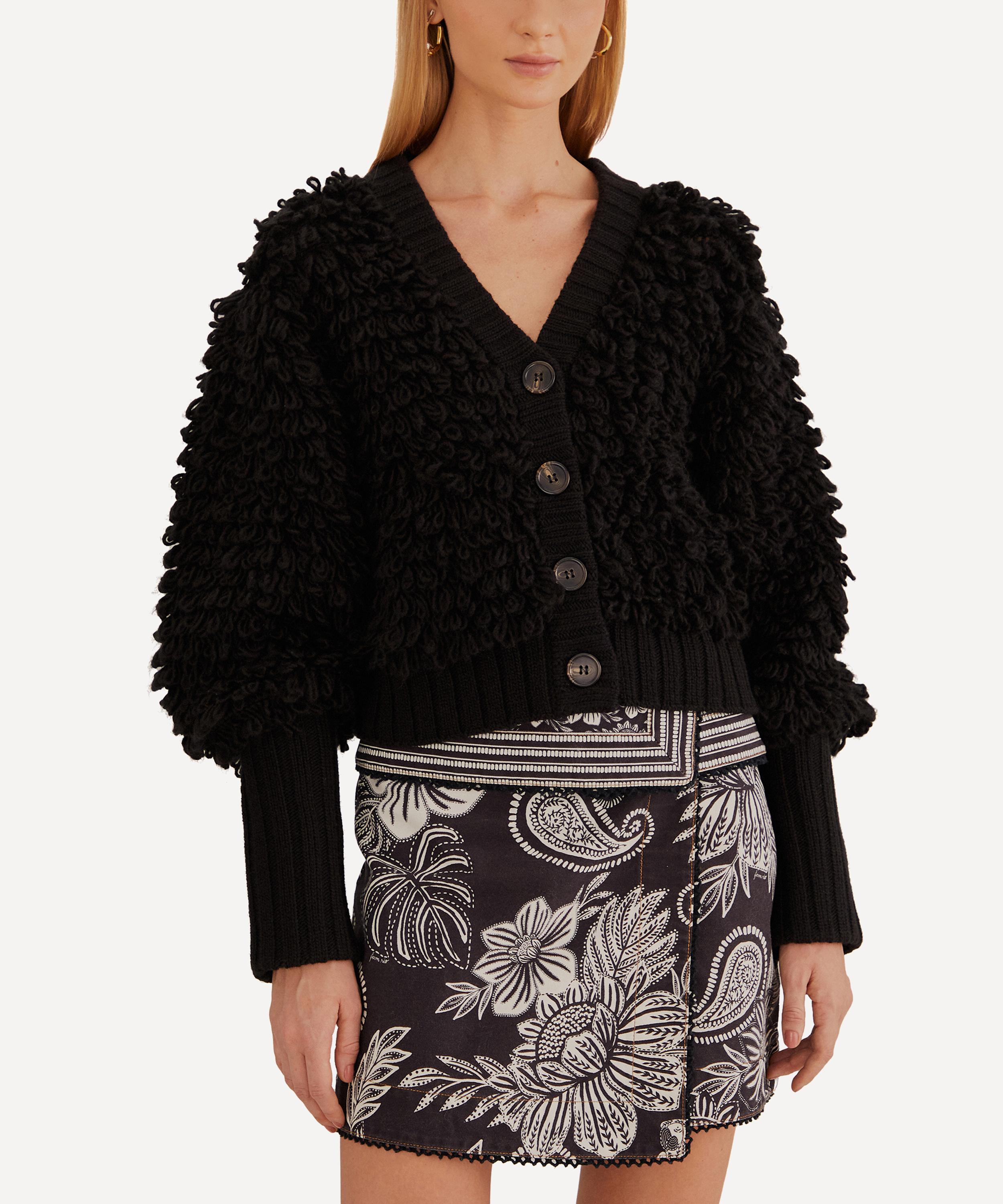 Crafted from a warming wool-blend, this super-snug, statement button-up is detailed all-over with a tactile loop knit. Featuring a plunging V-neckline and voluminous puff sleeves with long, fitted cuffs, it’s finished with chunky ribbed trims.