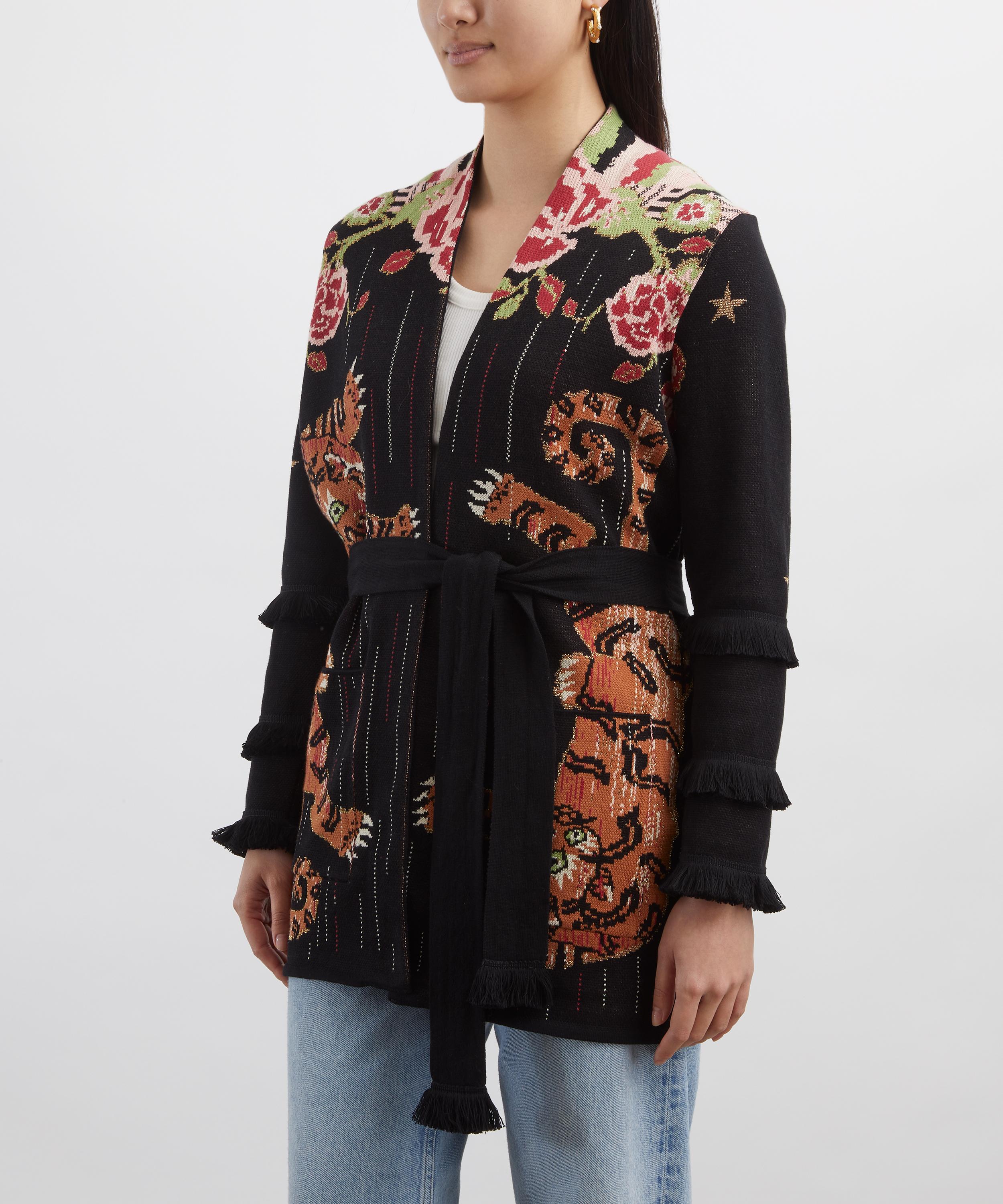 Crafted from pure cotton, this signature Hayley Menzies style returns for the new season in a versatile black base. Designed with a wrap-style front secured by a detachable belt, intricate fringing and knitted motifs of florals and Tibetan tigers elevate both day and evening looks.