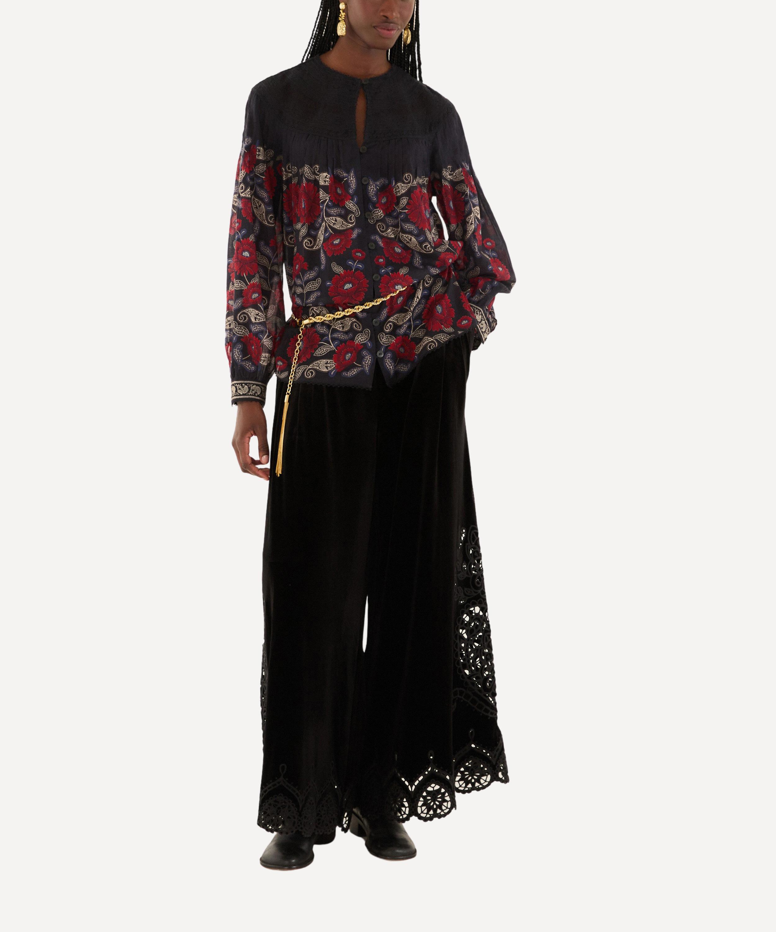 The Black Valentina Long Sleeve Blouse enchants with a high neckline, gathered yoke, and sheer fabric adorned with rich red and neutral floral paisley. Embroidered collar and cuffs add vintage-inspired charm and tactile warmth, blending elegance with a spirited touch.