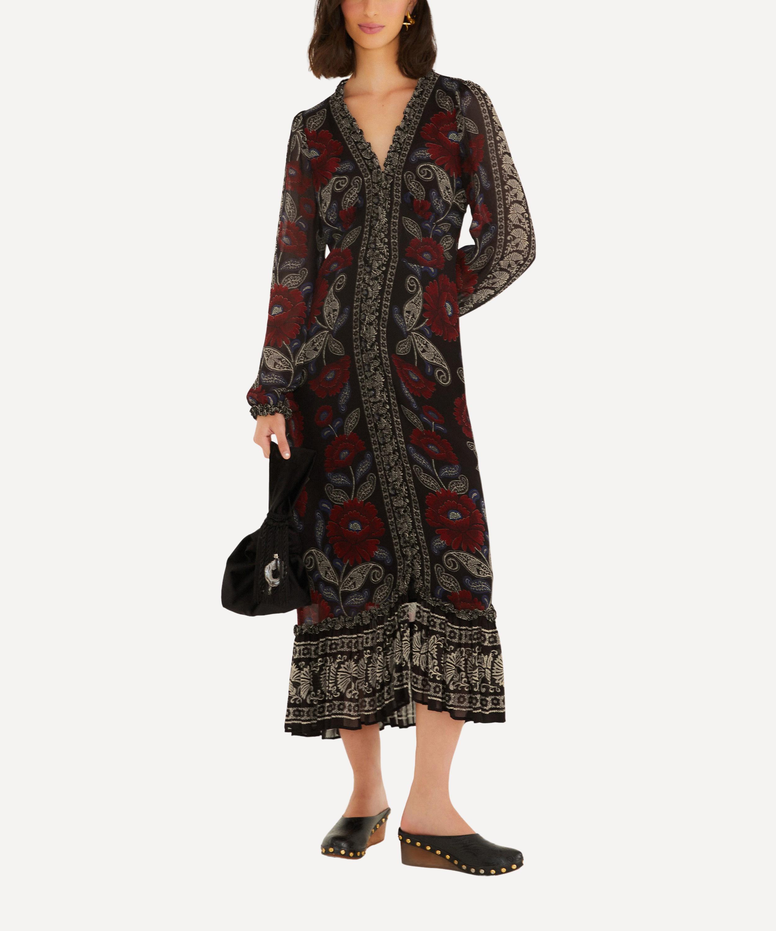 The Black Valentina Ruffled Long Sleeve Midi Dress captivates with a flowing silhouette, ruffled V-neckline, and sheer sleeves for a delicate touch. Bold red and soft blue florals mingle with paisley motifs on rich black fabric, while a frilled hem adds playful charm and graceful movement.