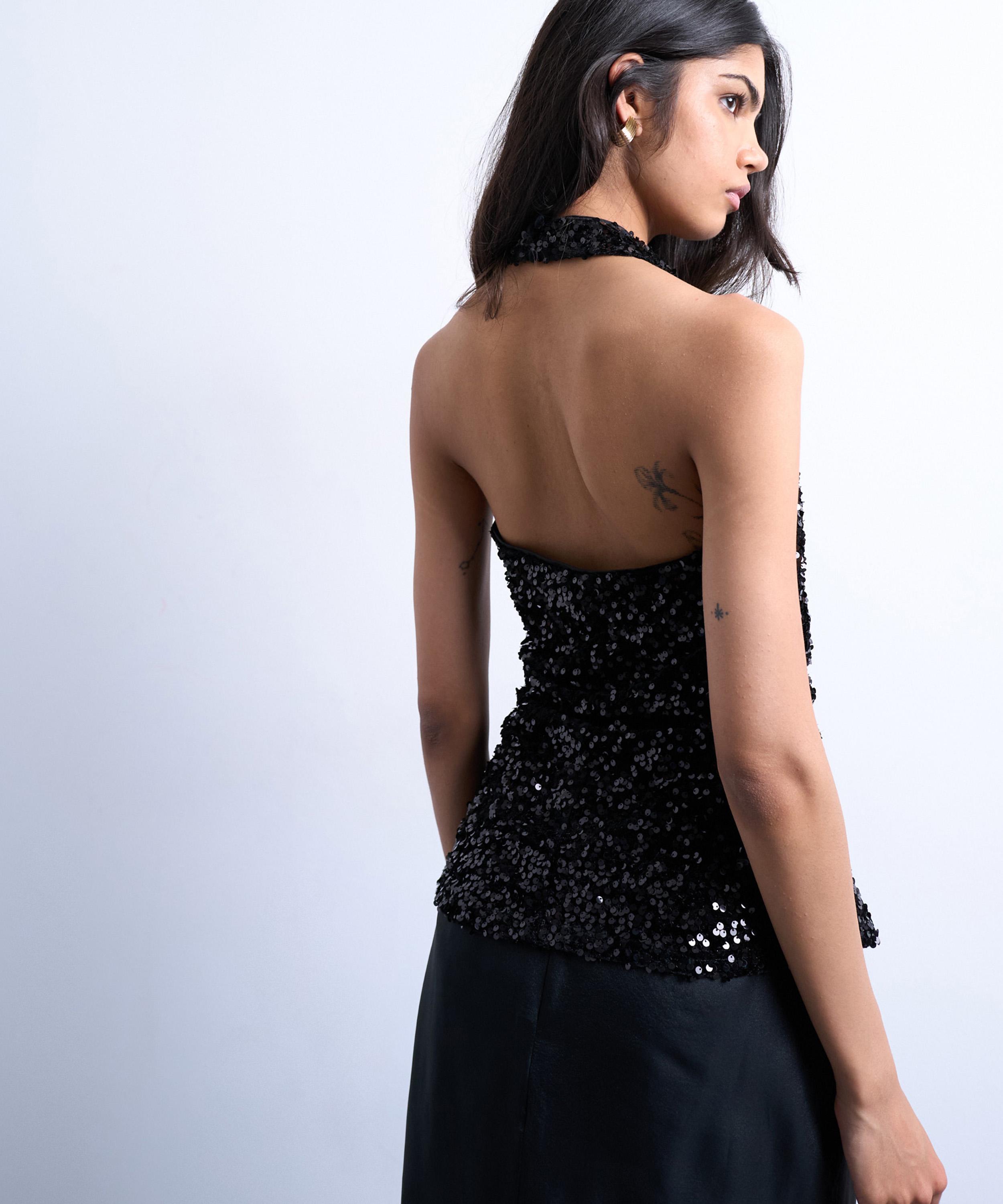 Crafted from plush velvet in a deep black hue, this elegant top is cut for a slim, sleeveless silhouette, and is complete with a round neckline, a halter neck strap and an open back – featuring all-over sequin embellishment for a glistening finish, it boasts a versatile addition to your party-ready edit.