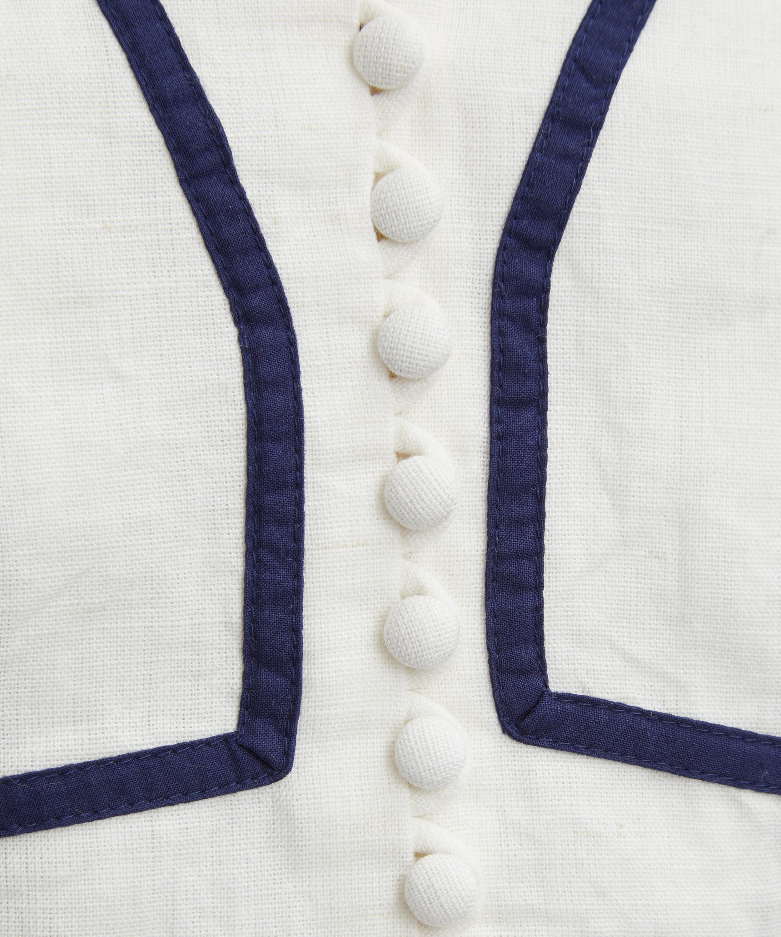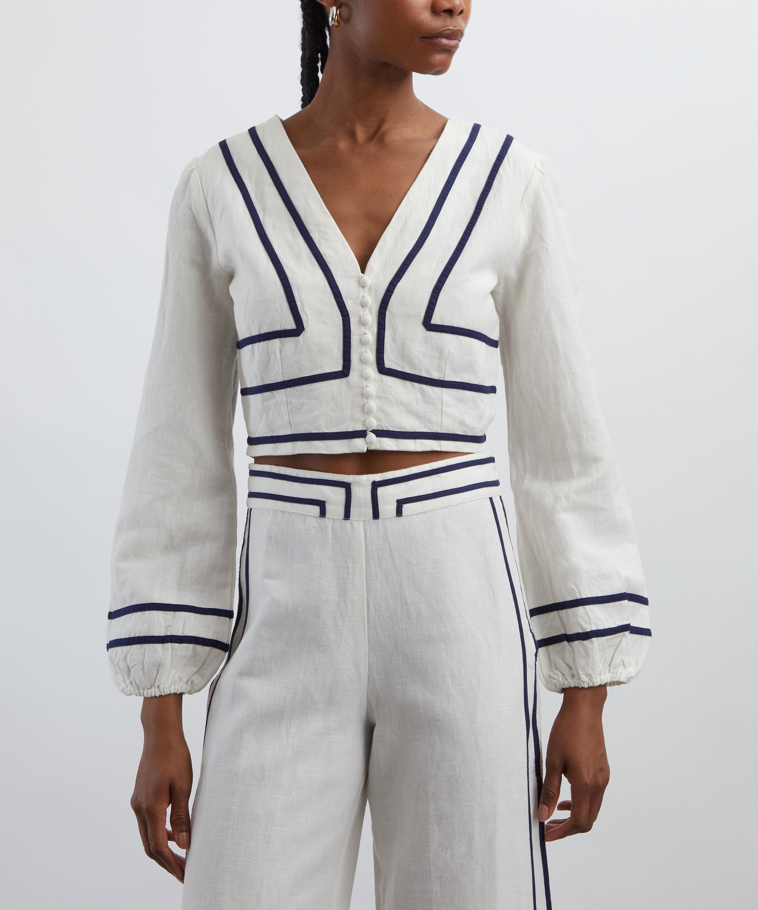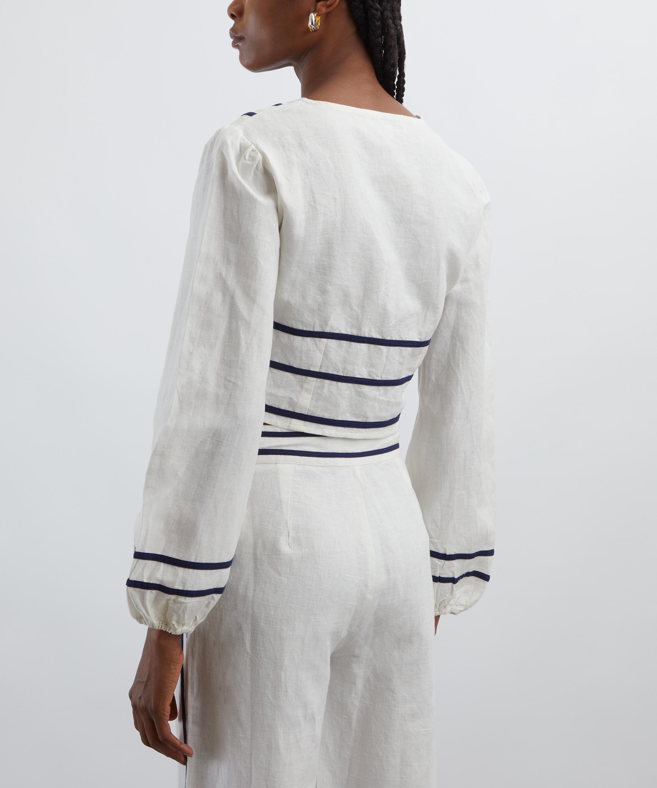 rafted from lightweight, airy linen, the Bloom top exudes effortless elegance. Accented with a navy border design, it features long puffed sleeves and a V-neckline with a buttoned placket, offering a timeless, romantic finish.