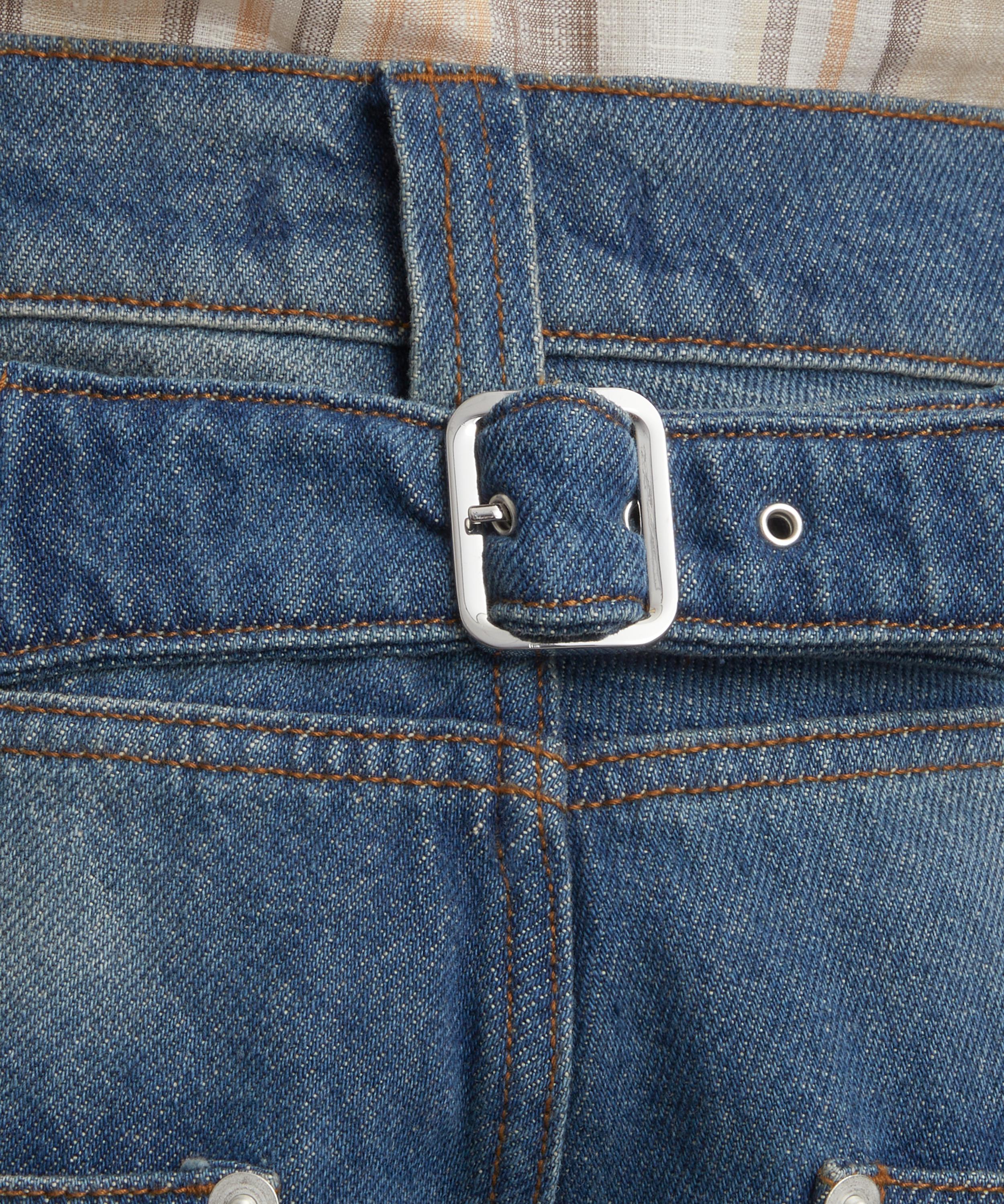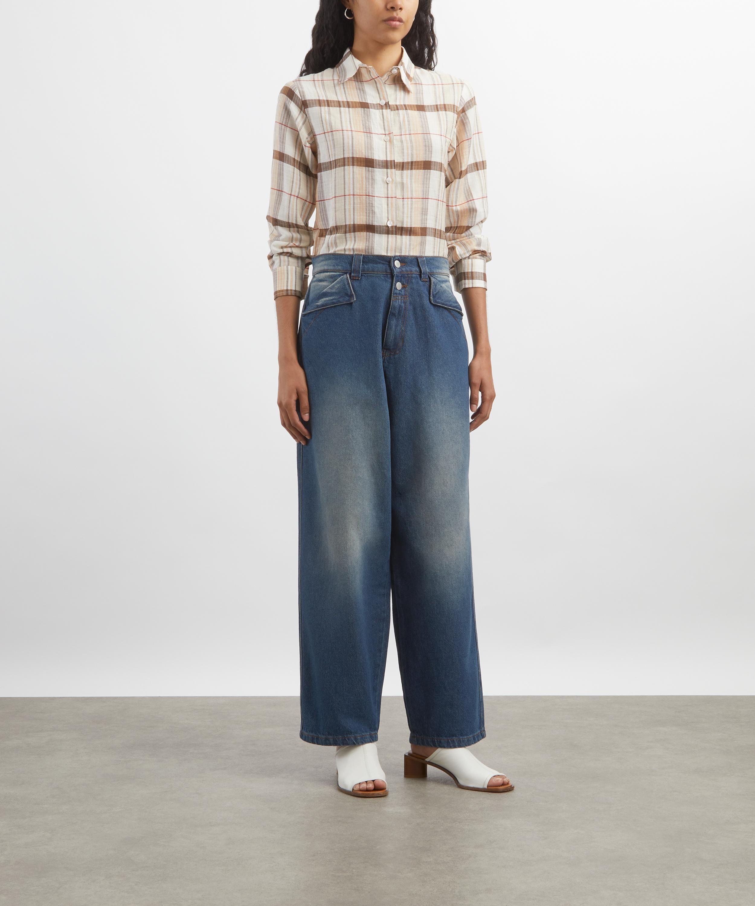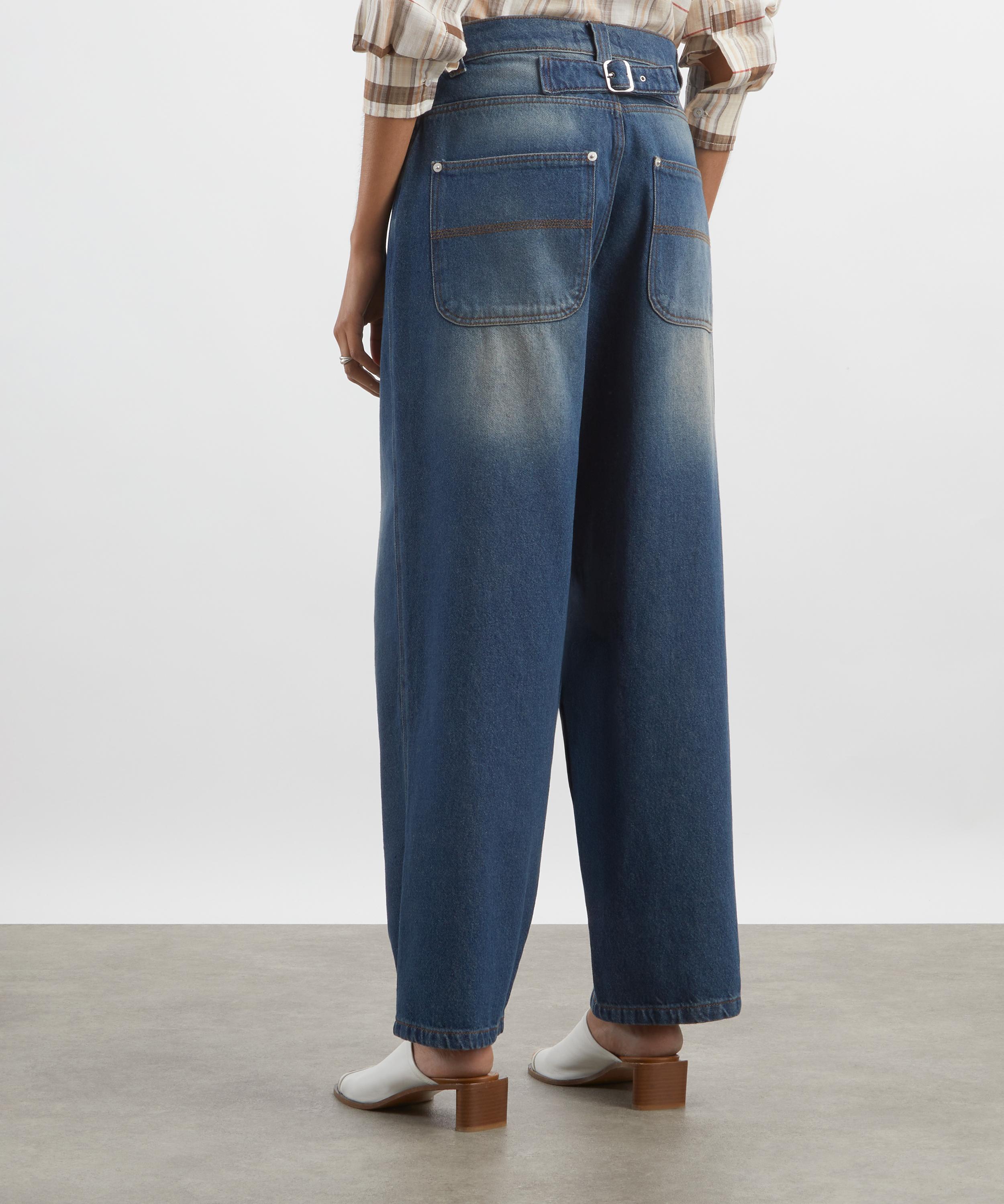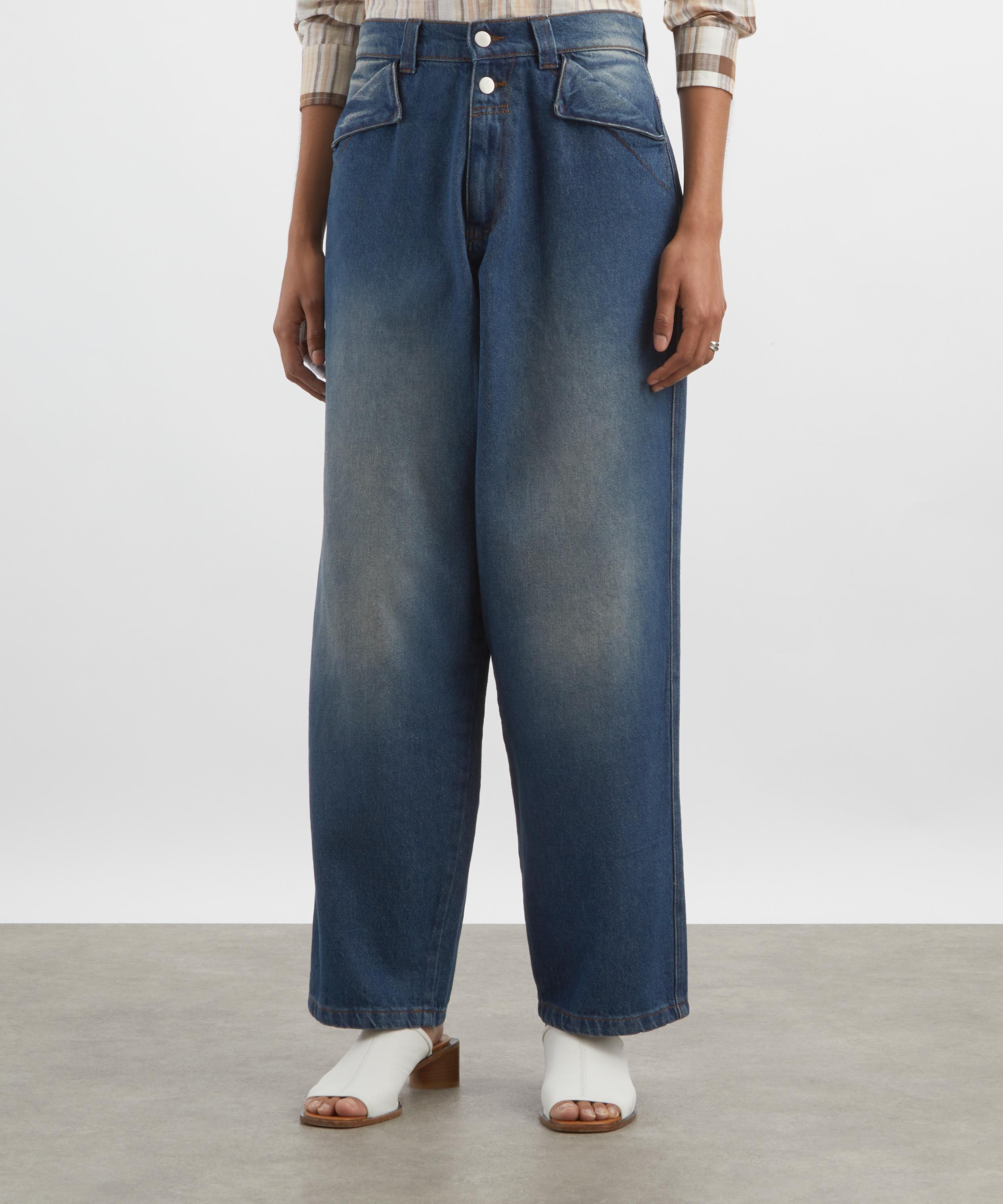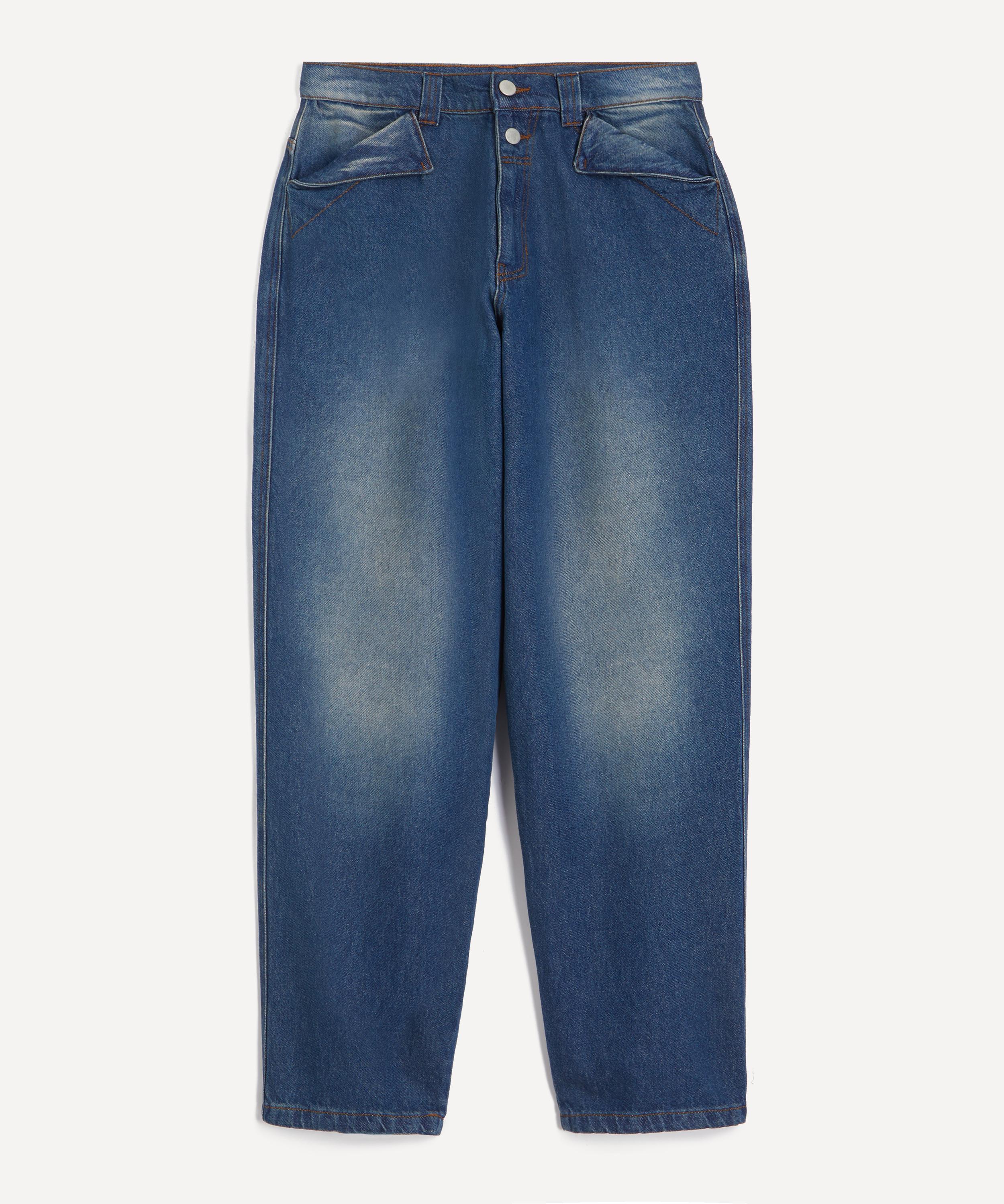 Crafted from non-stretch cotton in a dark blue wash, these wide-leg jeans feature fading and whiskering throughout for a lived-in look. Fold-over front pockets and a back cinch tab add both utility and an adjustable fit.