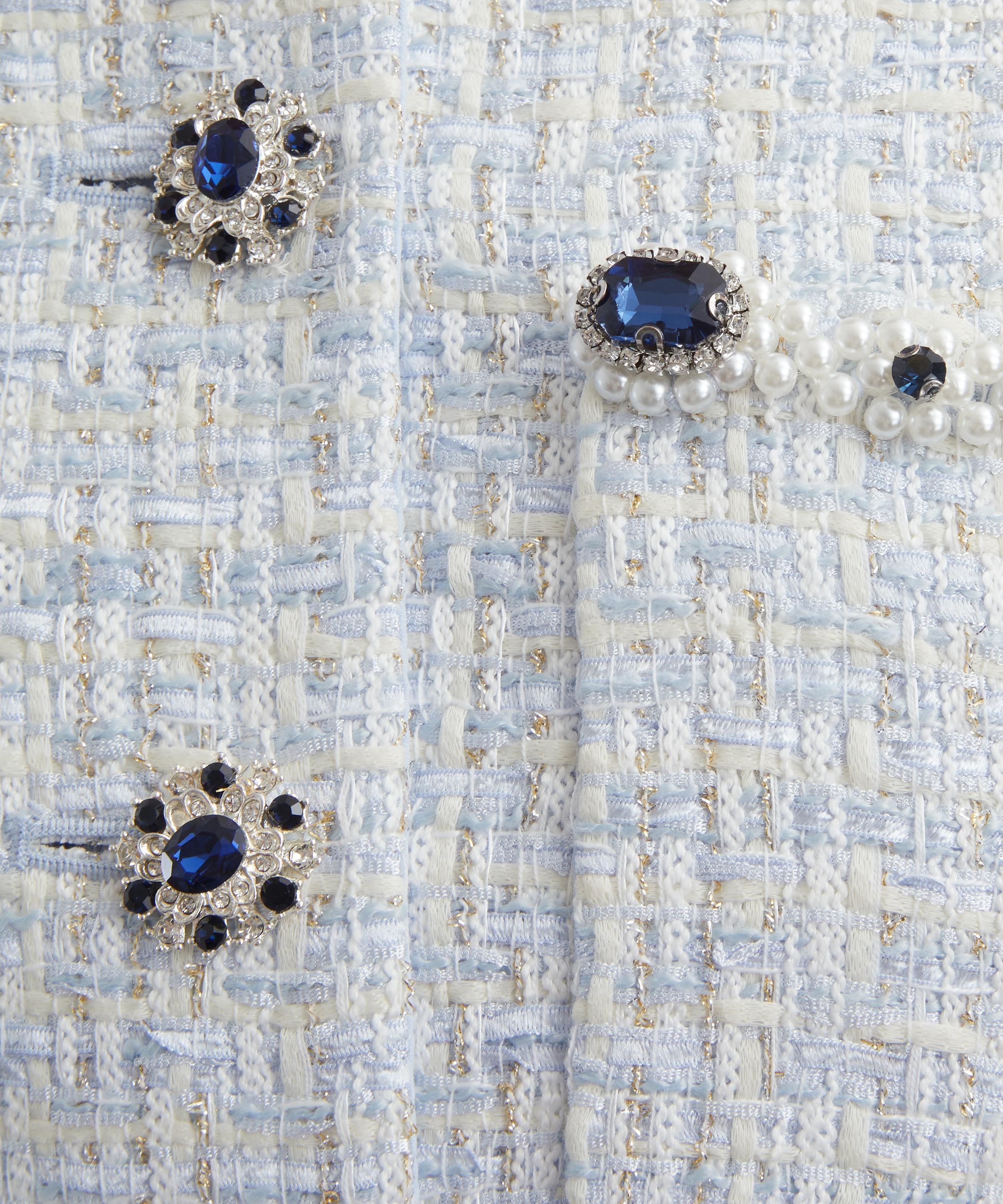 Crafted with a textured bouclé weave and tailored in a modern boxy silhouette, this blue jacket effortlessly exudes sophistication and style. Framed by a round neckline, the collar, front button fastening and patch pockets are elevated with diamanté trims and buttons, adding a touch of luxury and refinement to this elegant piece.