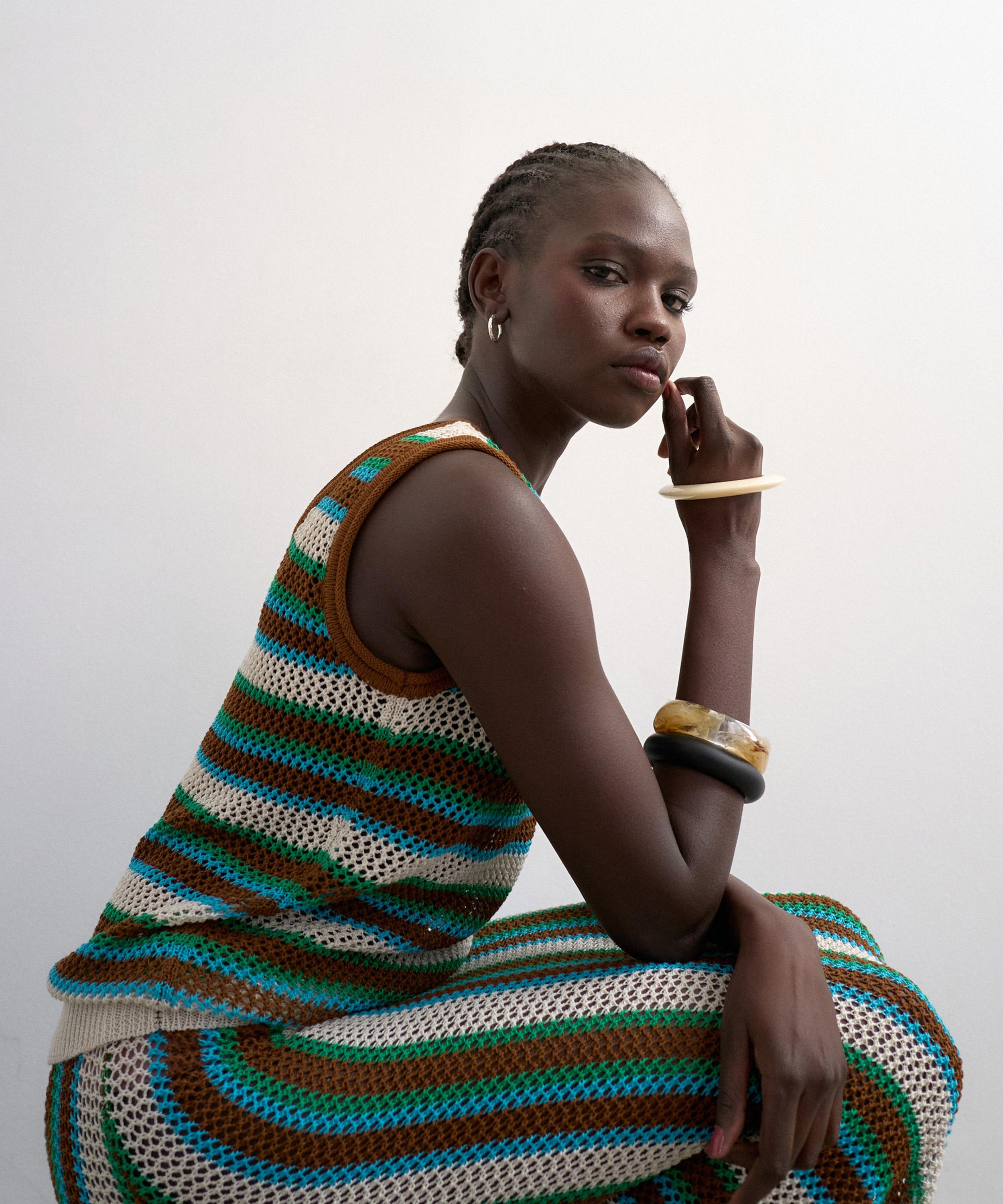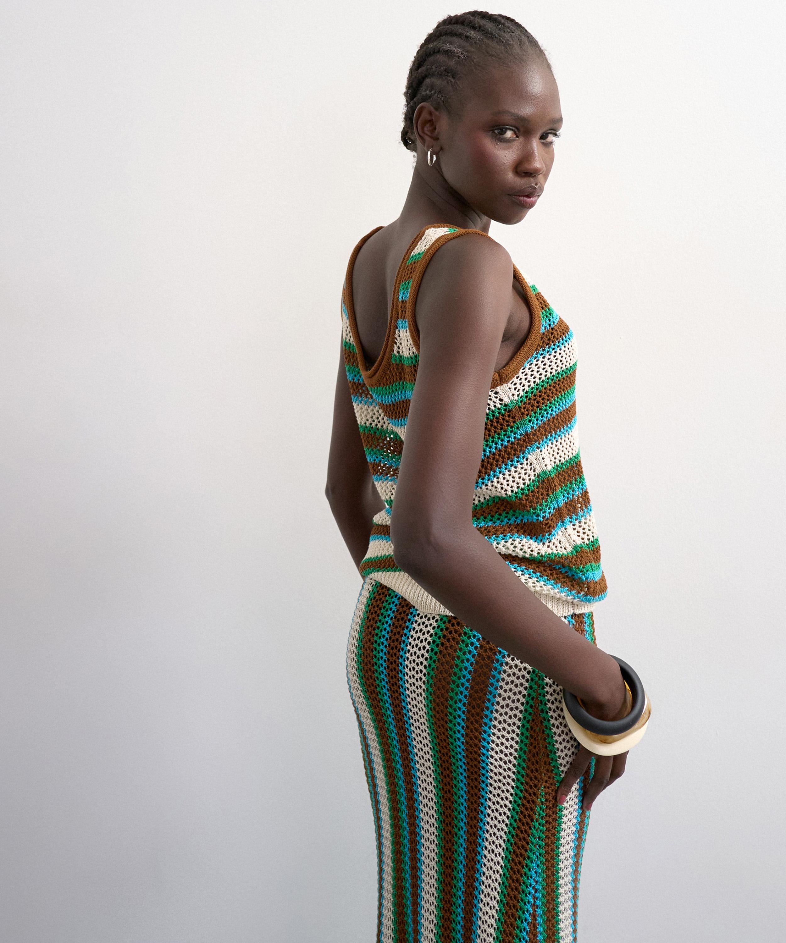 Crafted in a loose-weave knit with a vibrant striped pattern, this vest top features a regular fit complete with a flattering scooped neck and back. Pair it with the matching maxi skirt for an effortlessly coordinated beach-ready look.