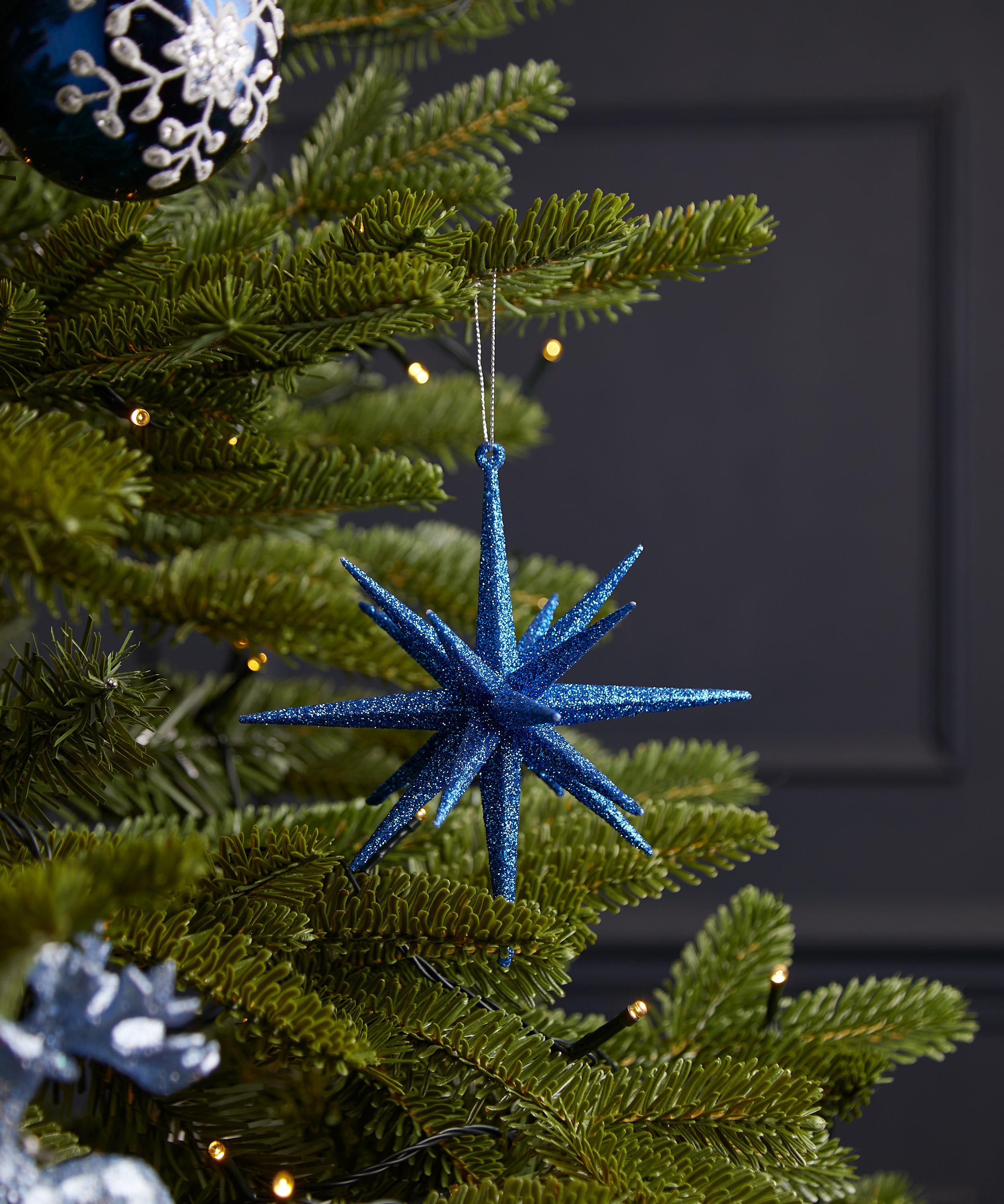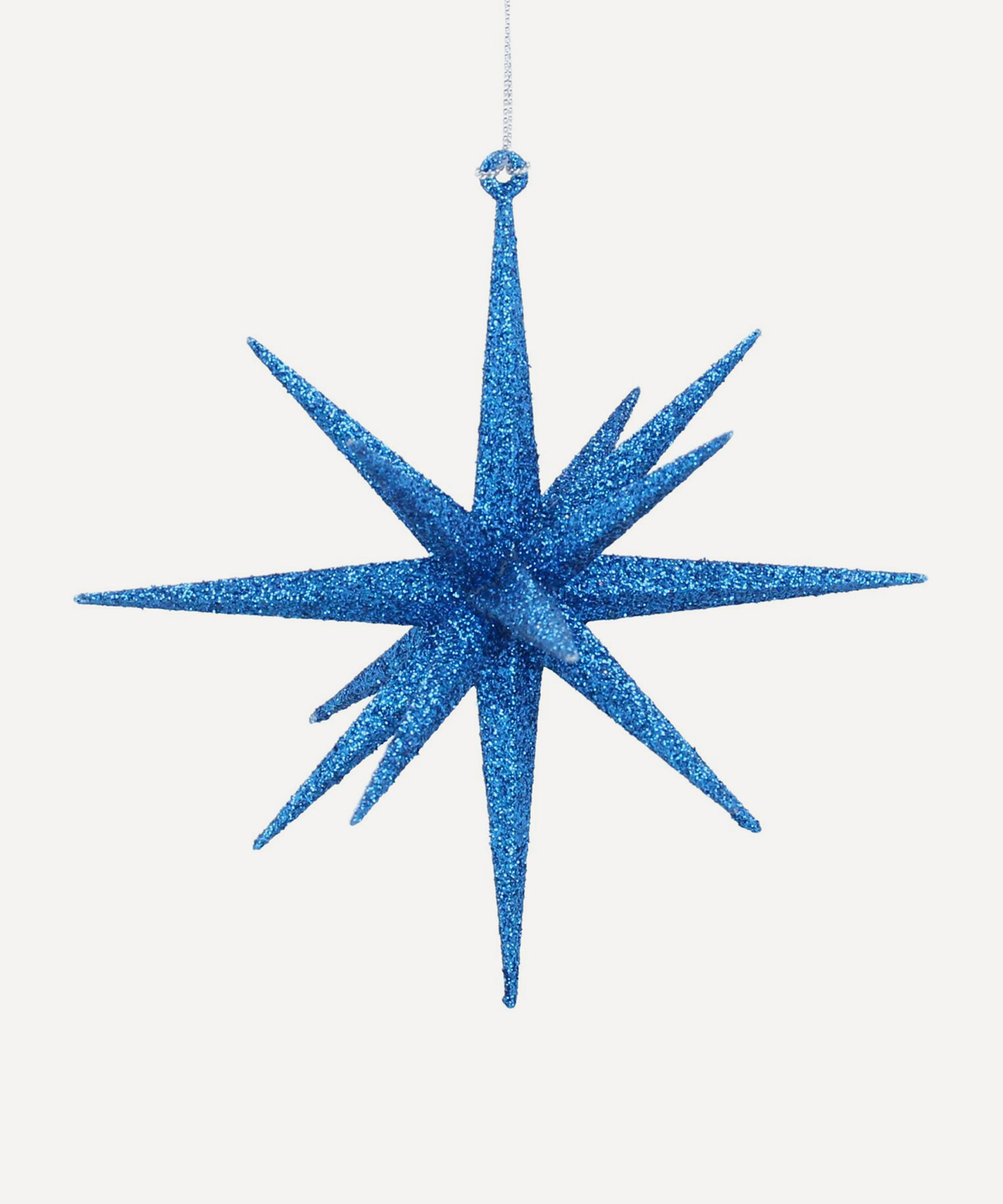 A modern alternative to traditional decorations, it features a striking Bethlehem star adorned in blue glitter - a luxuriously embellished option for those seeking a treasured heirloom piece.