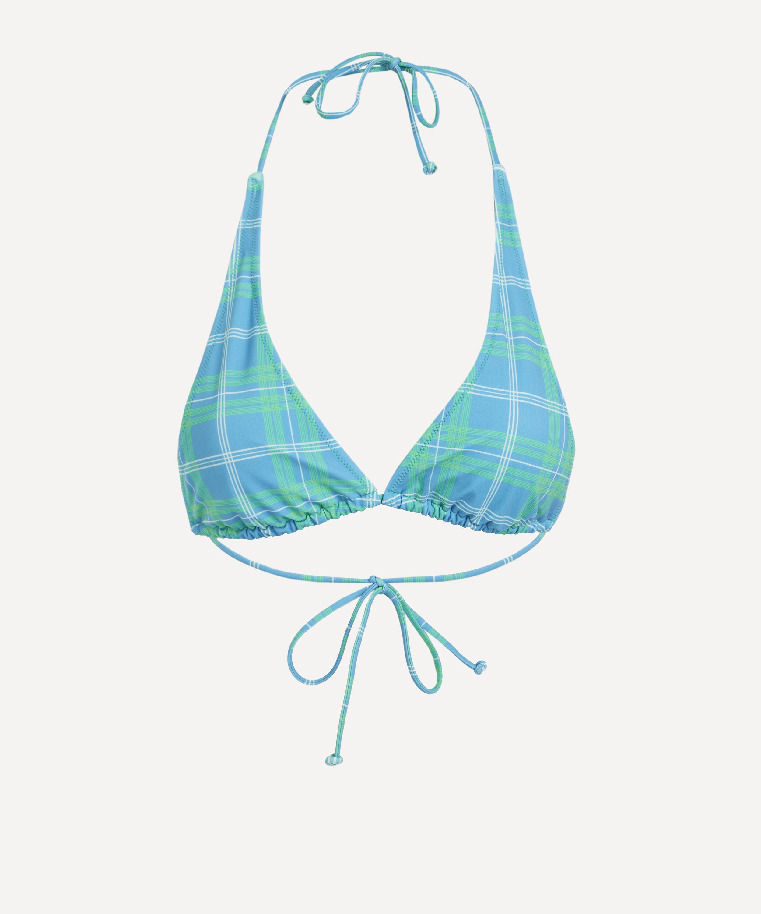 In a vibrant blue and green check, this triangle bikini top features a fully adjustable design with ties at the neck and back for a perfectly tailored fit.