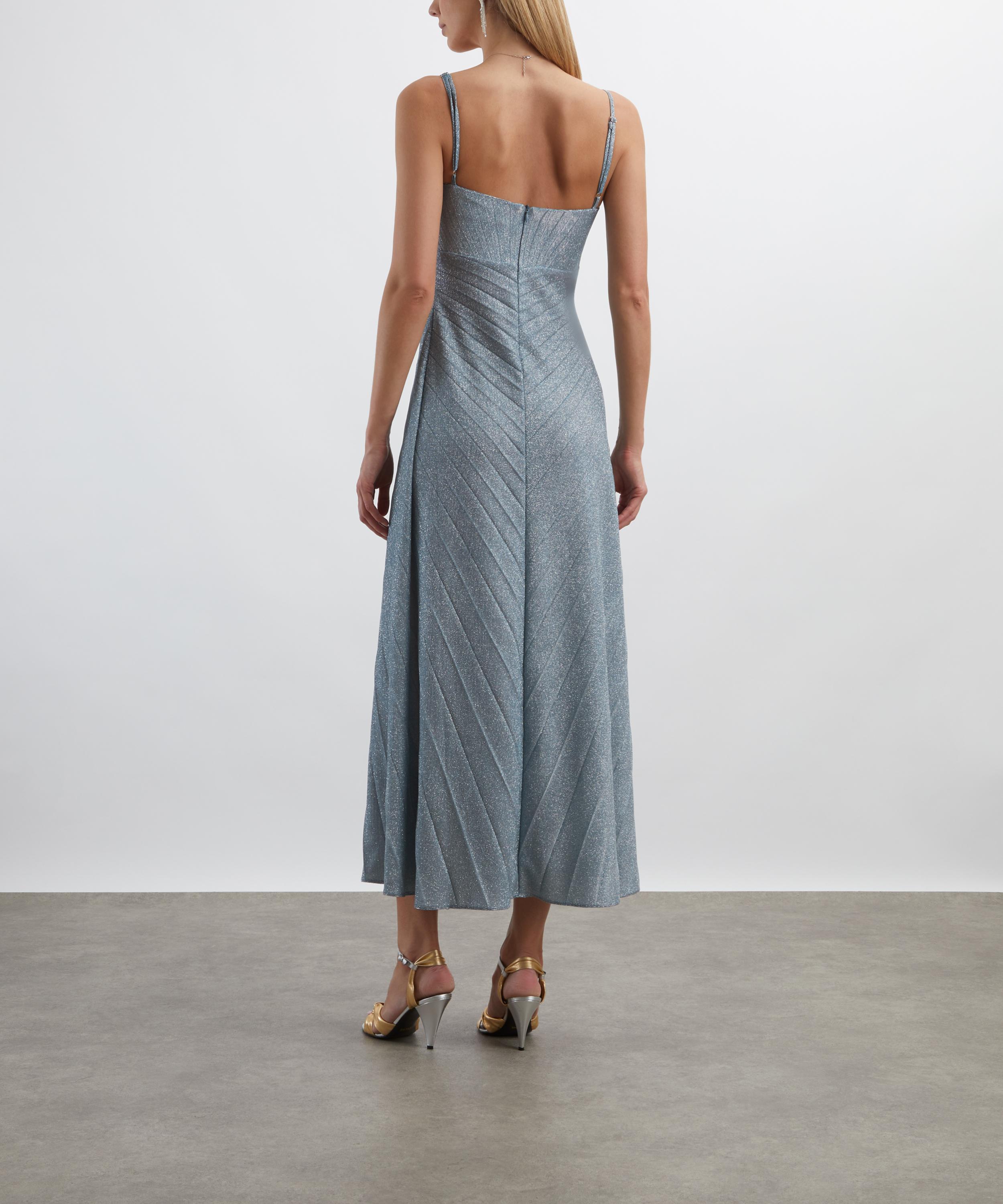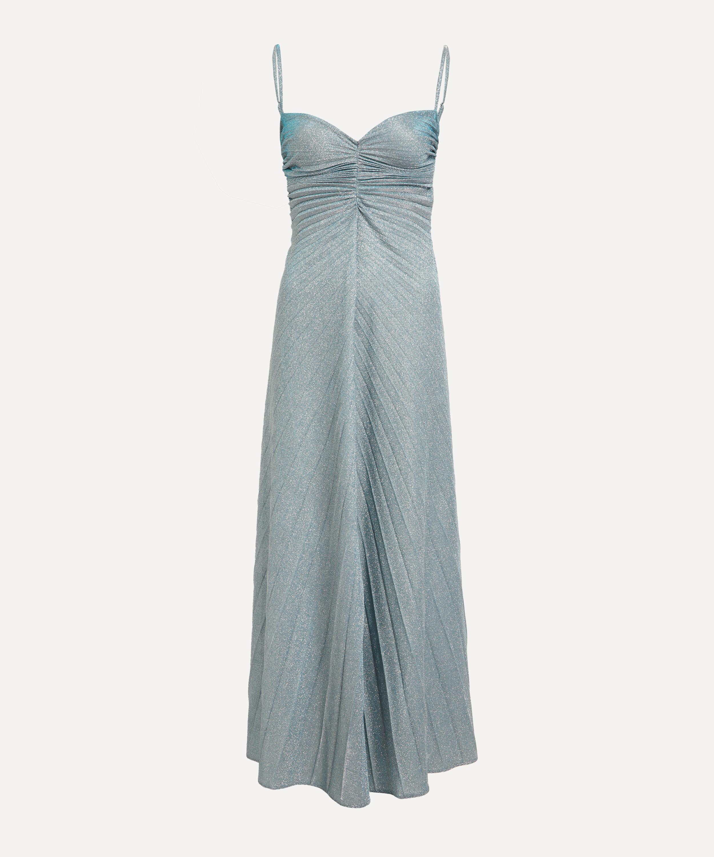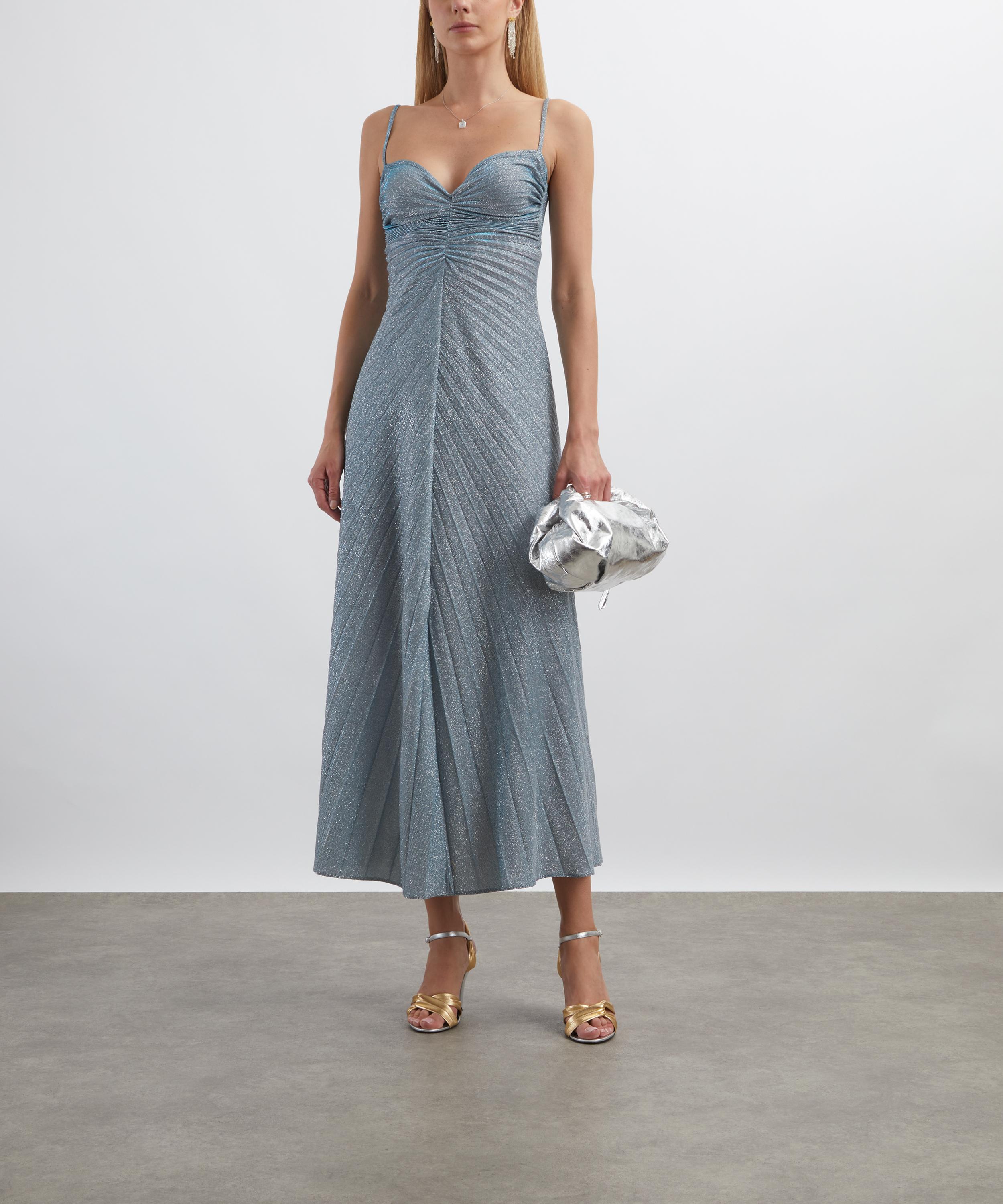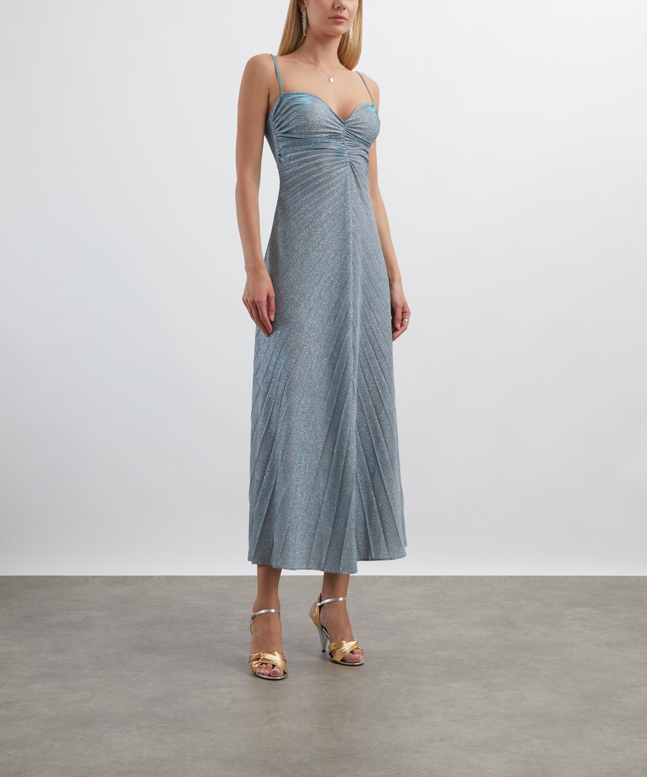 A bold expression of modern elegance, this metallic blue mid-length dress is defined by all-over sunray pleating that catches the light with every movement. An elegant sweetheart neckline with adjustable straps adds a touch of allure, while the gathered bust accentuates its flattering A-line silhouette.