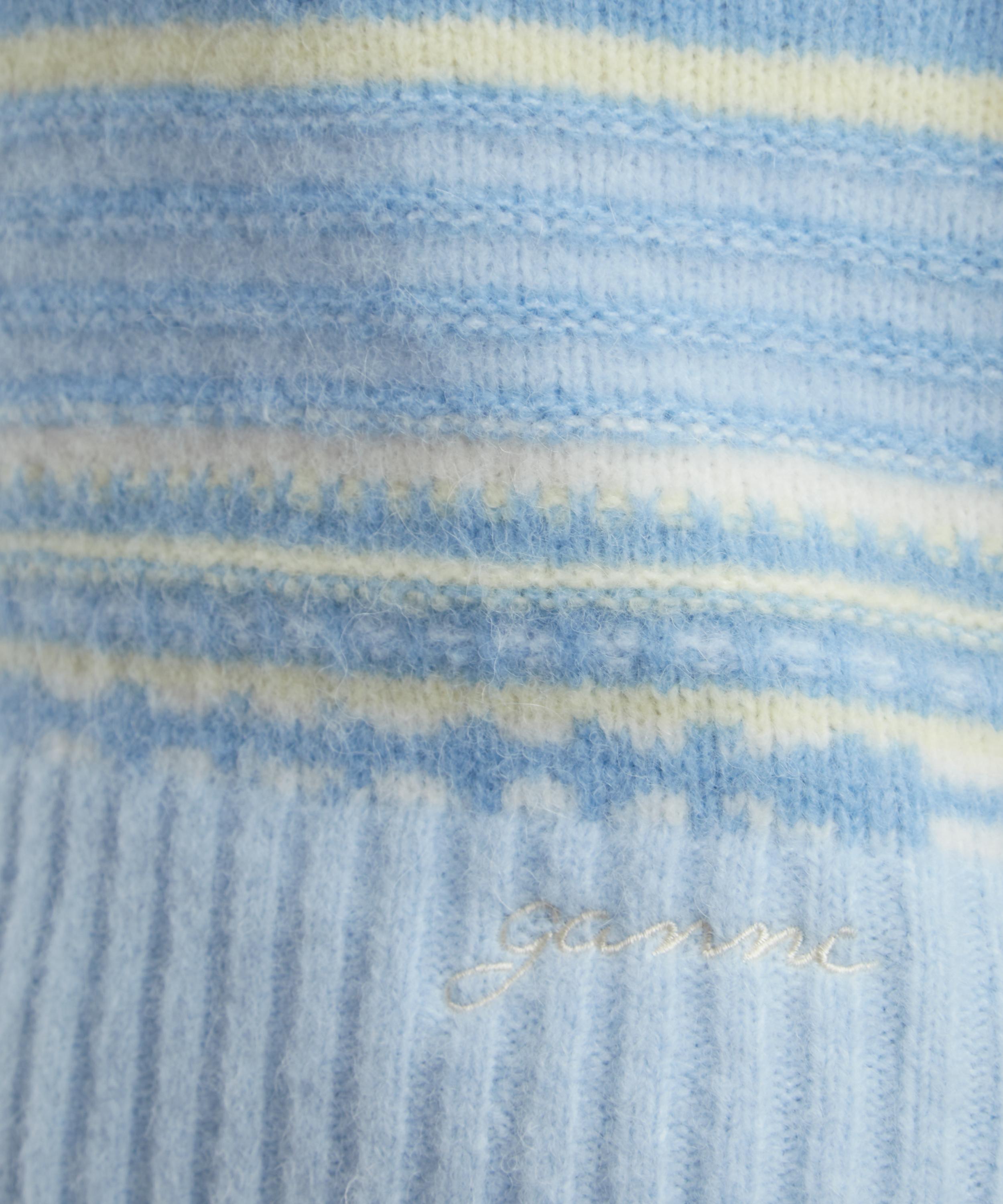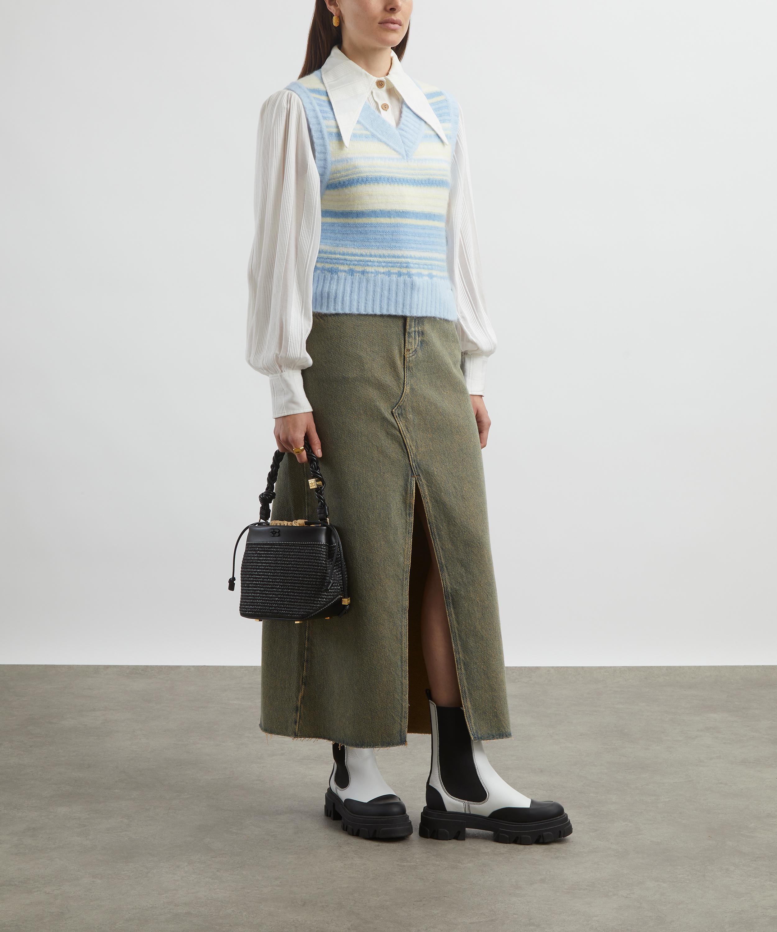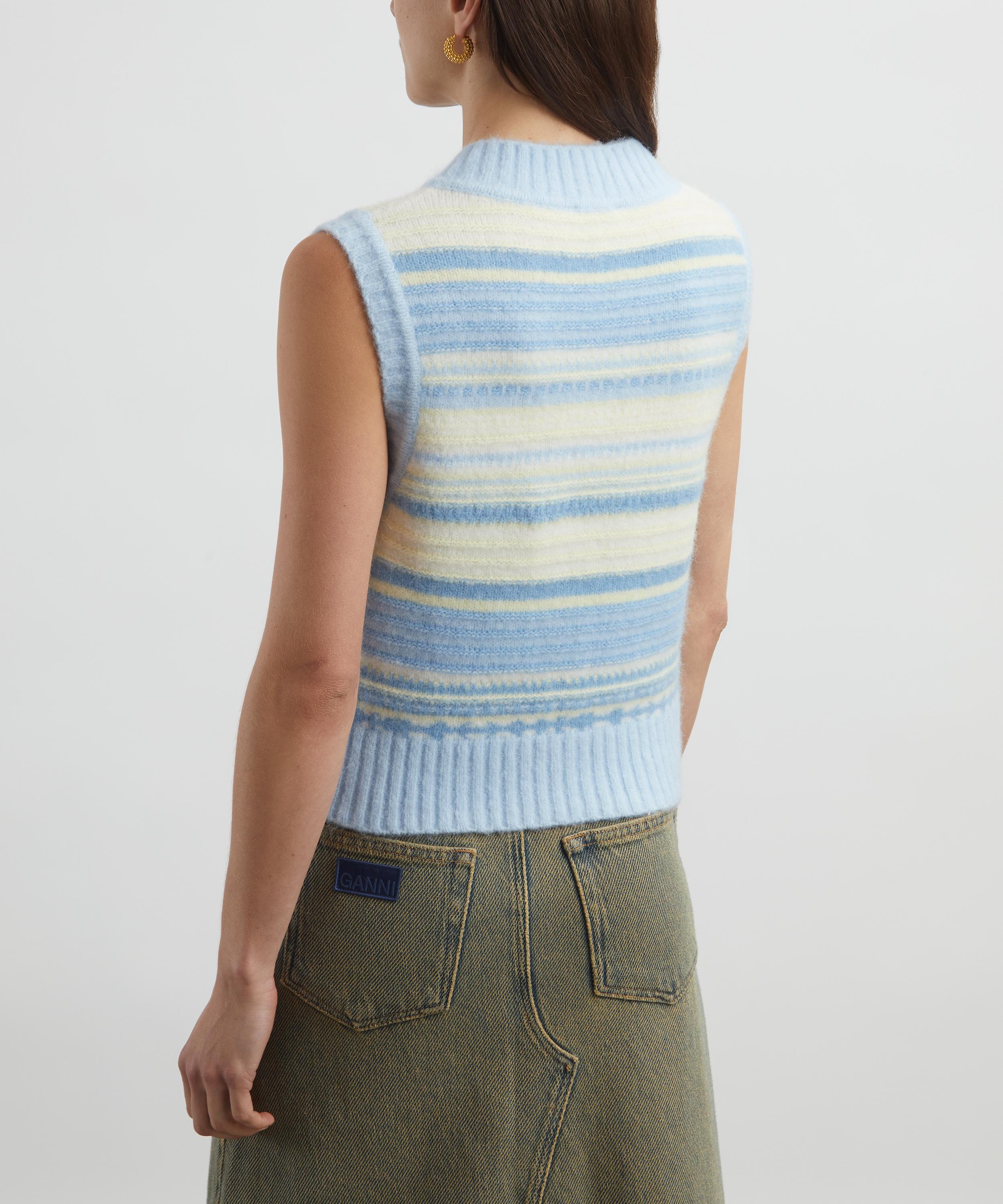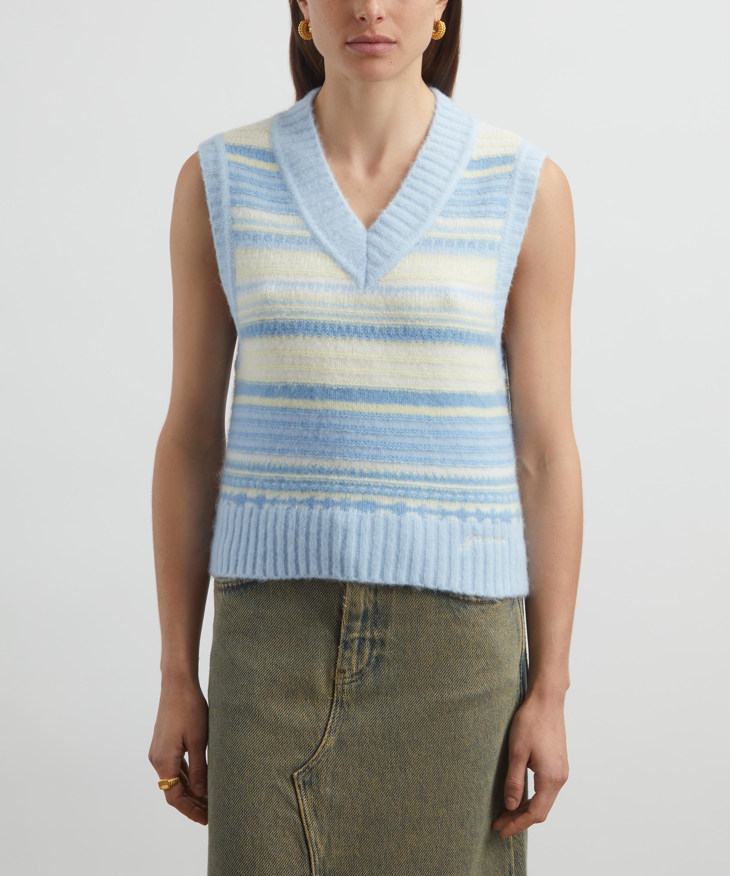 Crafted from a super-soft alpaca and Merino wool blend, this blue striped vest features a V-neckline, chunky ribbed trims and GANNI logo embroidery at the hem. Ultra-versatile, layer it over a shirt or t-shirt for an easy boost of warmth in cooler climes.
