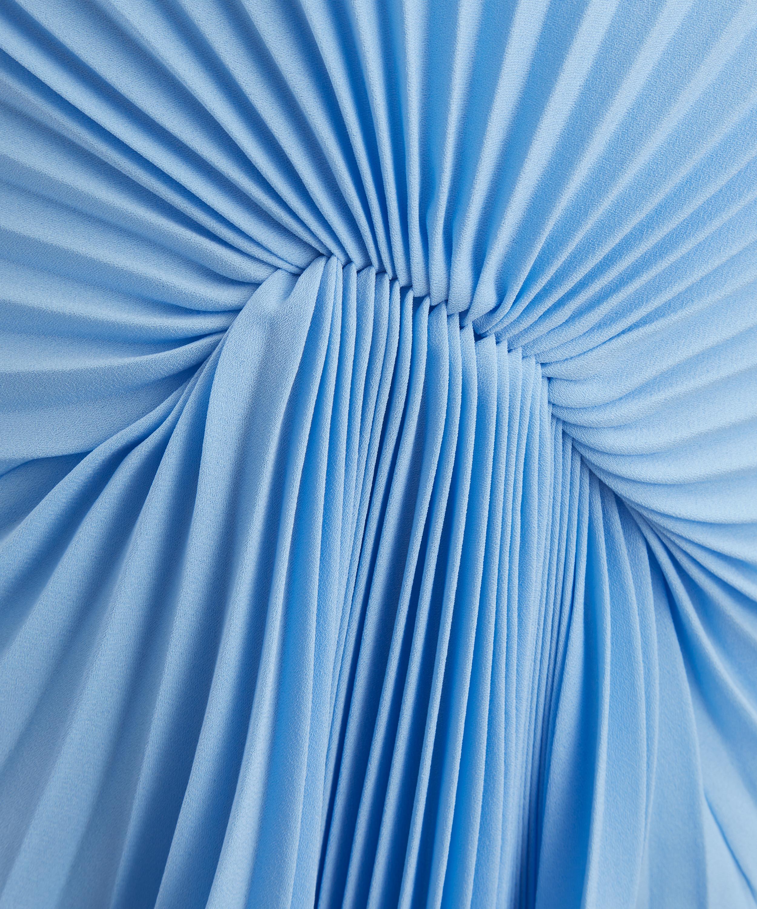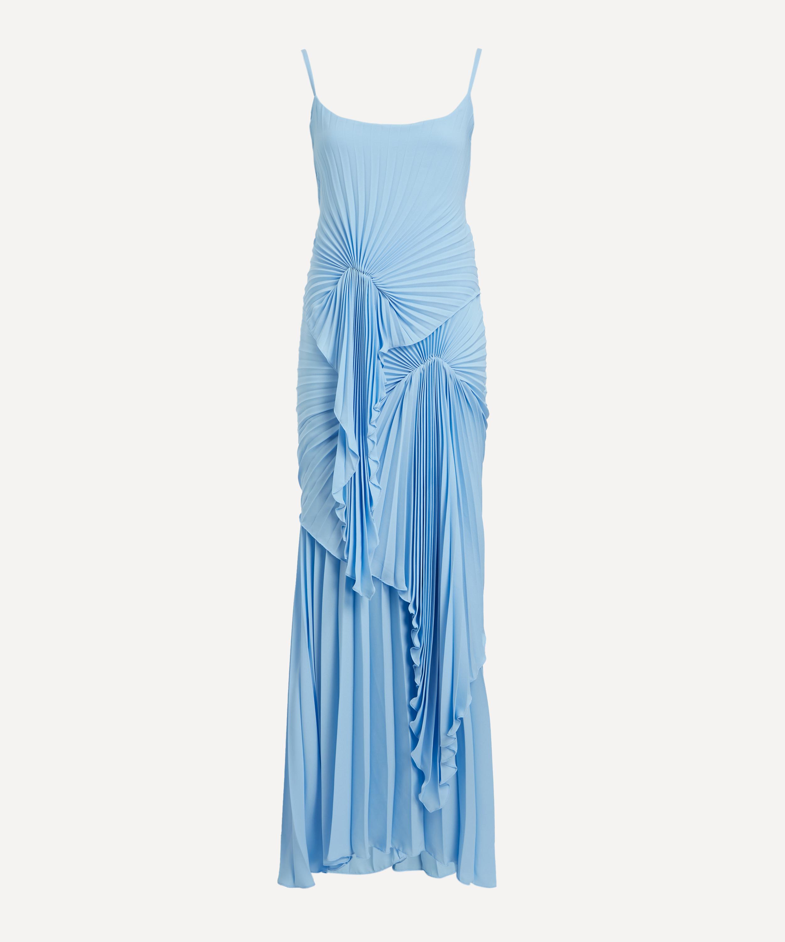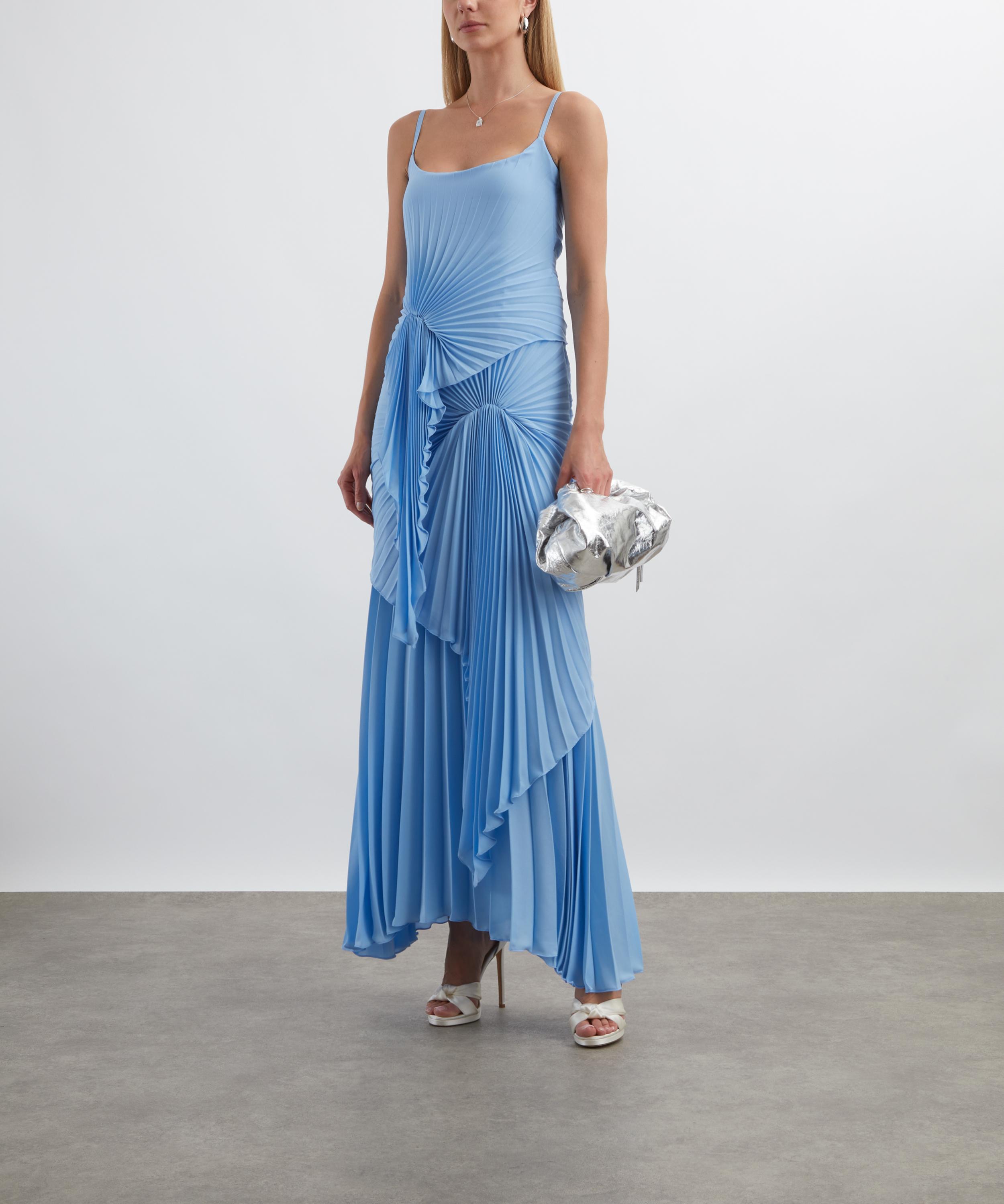 A bold expression of modern elegance, this floor-length dress is defined by delicate pleating that flows in a waterfall design, enhanced by artful gathering throughout. An open neckline with adjustable straps adds a touch of allure, while the slip-on style and waist tie effortlessly sculpt a flattering silhouette.