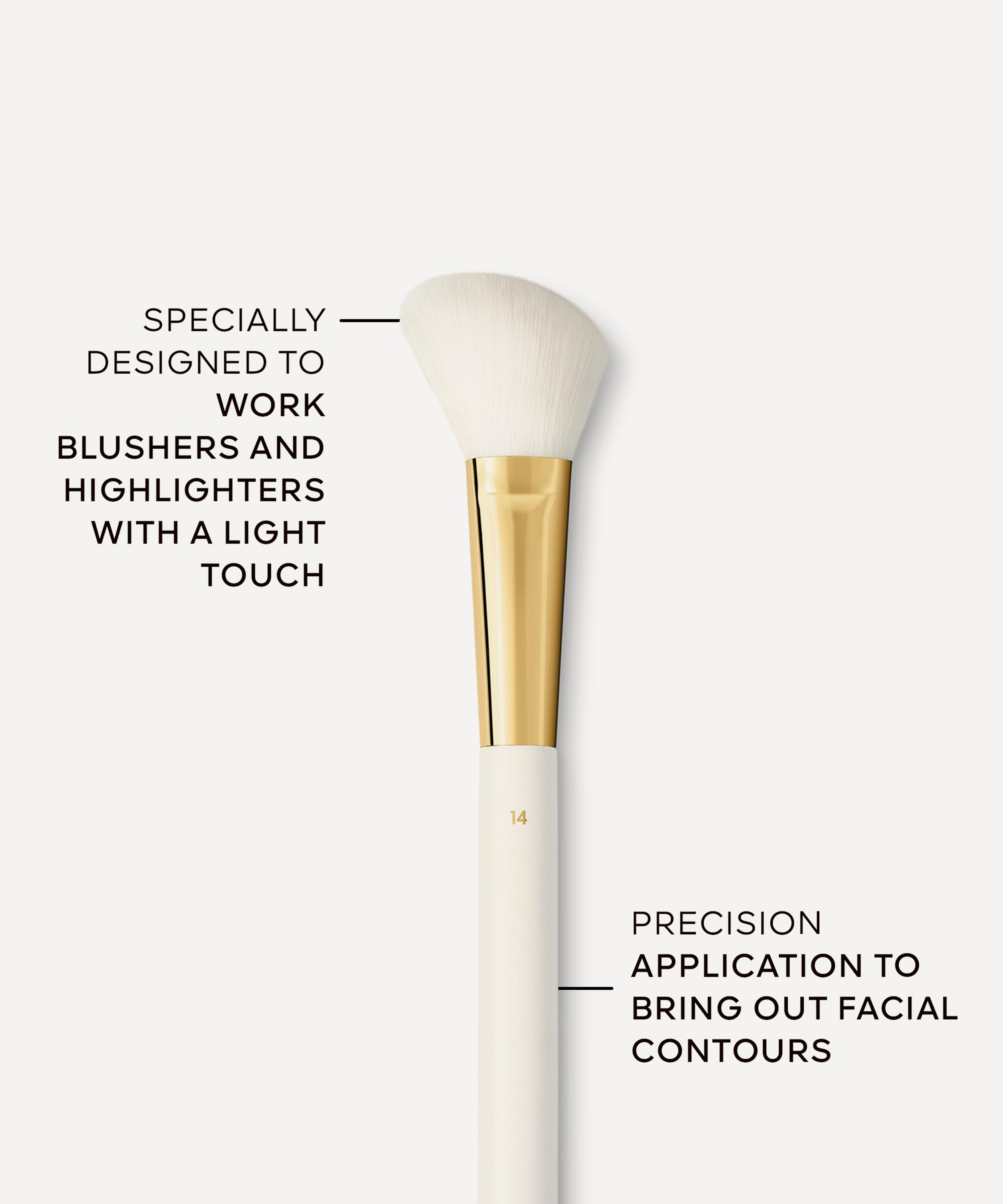 For blushers, using the flat side of Brush n°14, apply blusher to the apple of the cheek, blending upwards towards the temples.