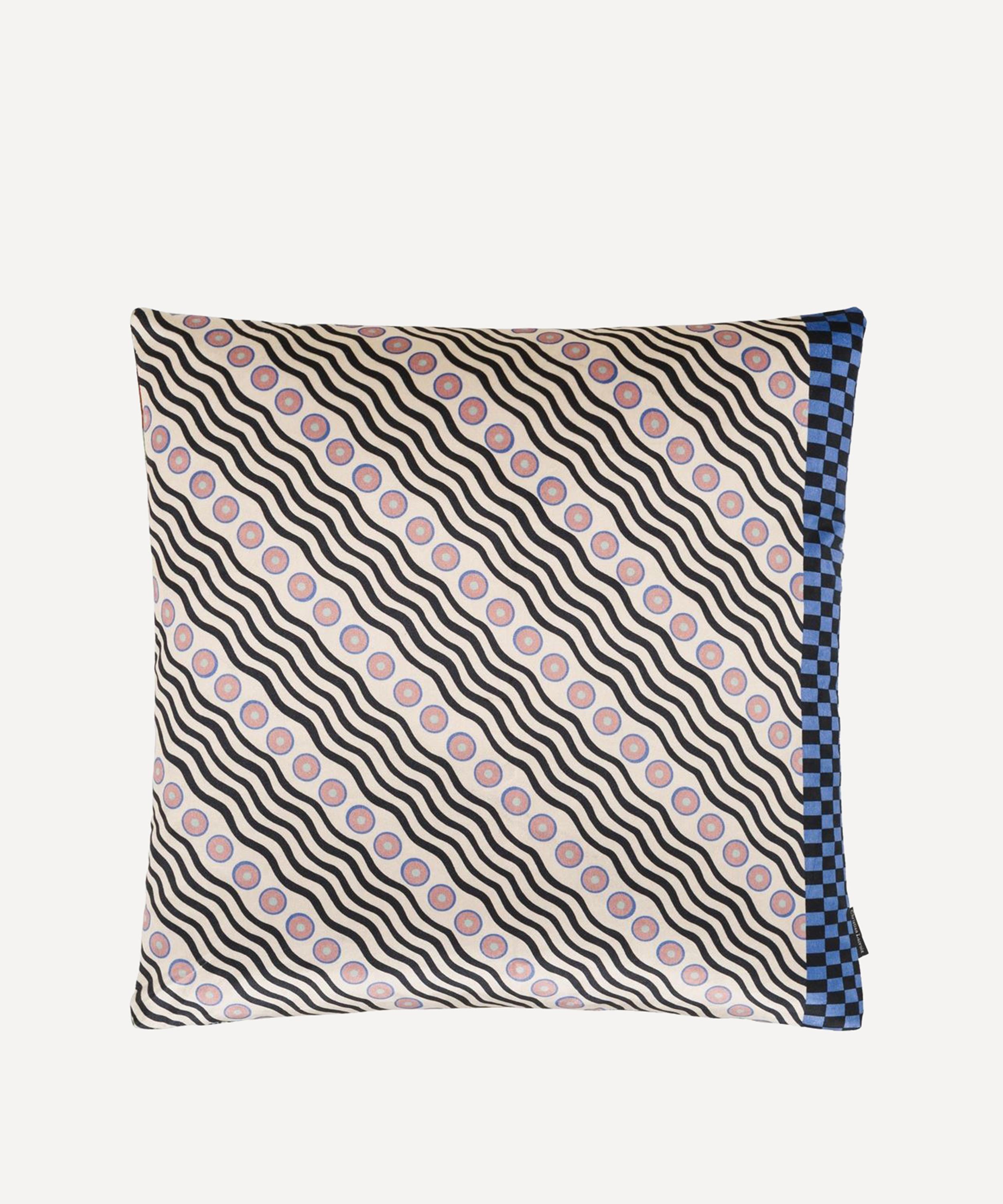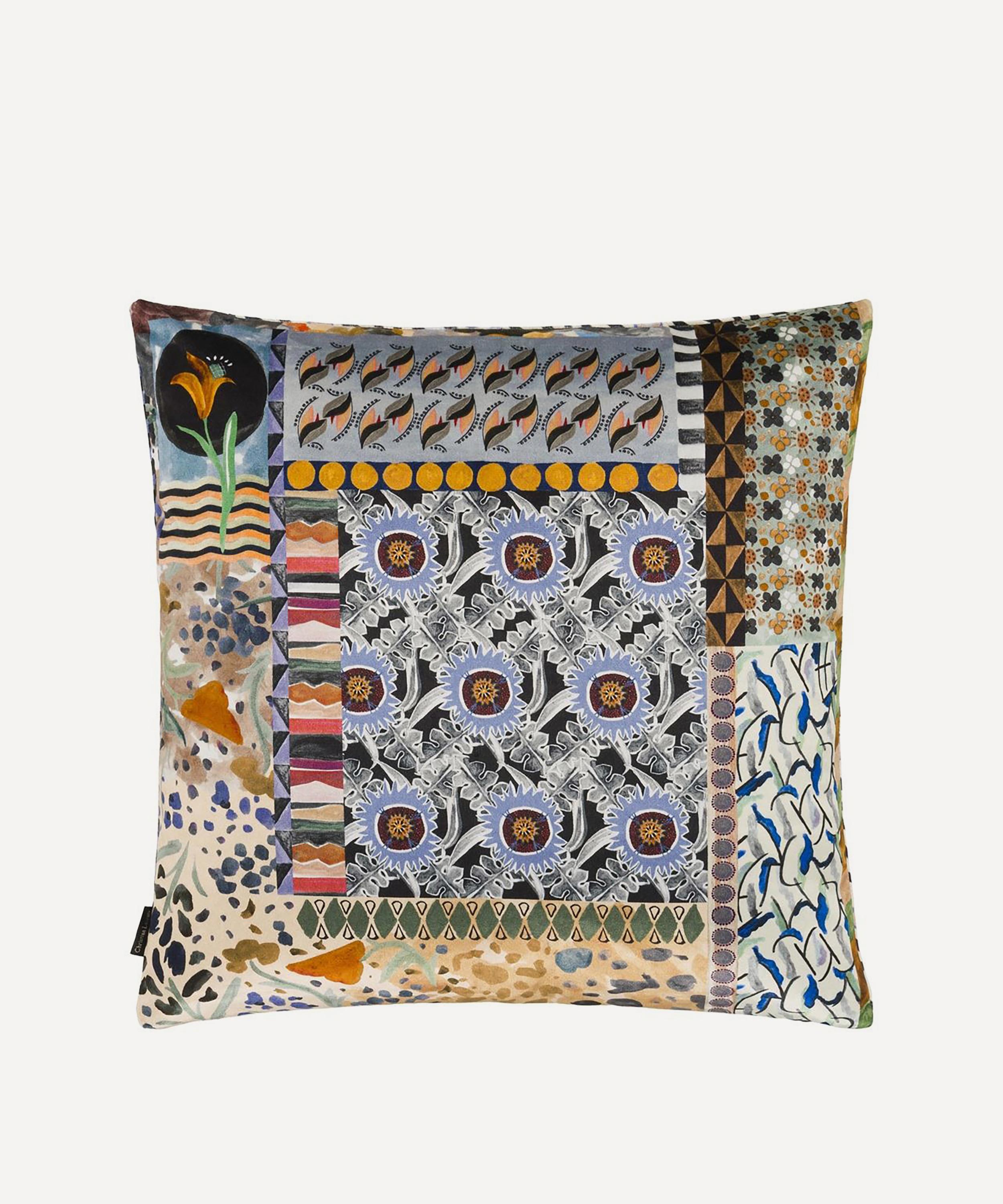 Spotlighting a patchwork of intricate patterns to the front, this cushion is digitally printed onto luxe velvet, achieving bold, saturated hues. With a wavy diagonal graphic stripe to the reverse, style with block colours to enhance the vibrant design.