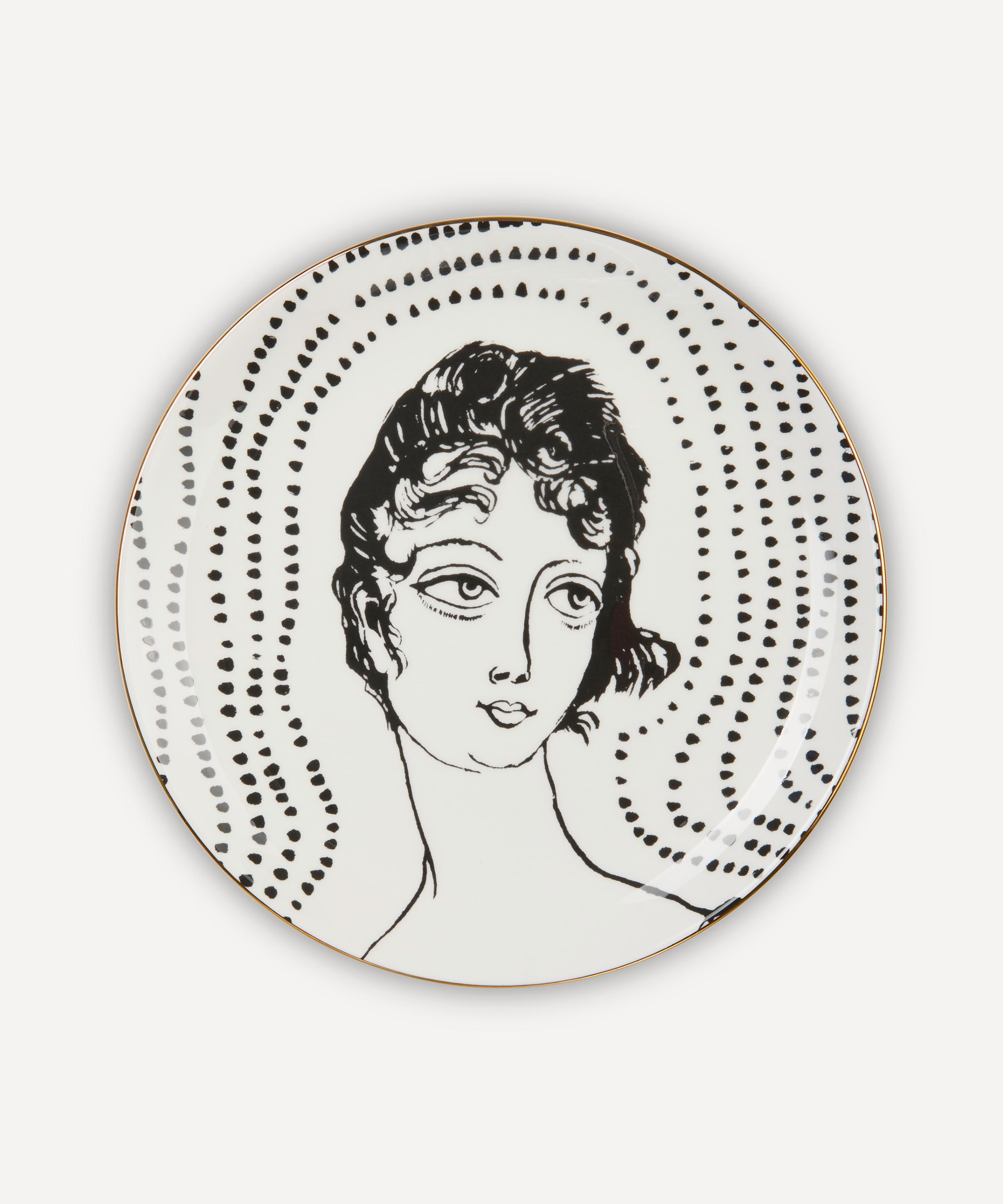 The intricate design of this plate is inspired by the artwork The Great Beauty, 2024. The original piece is a cabinet heavily decorated with ceramic female portraiture, created in celebration of friendship and in response to the abundant furniture and miniatures housed in the Wallace Collection. Each plate highlights a hand-picked, beautifully detailed, portrait from the cabinet in monochrome.