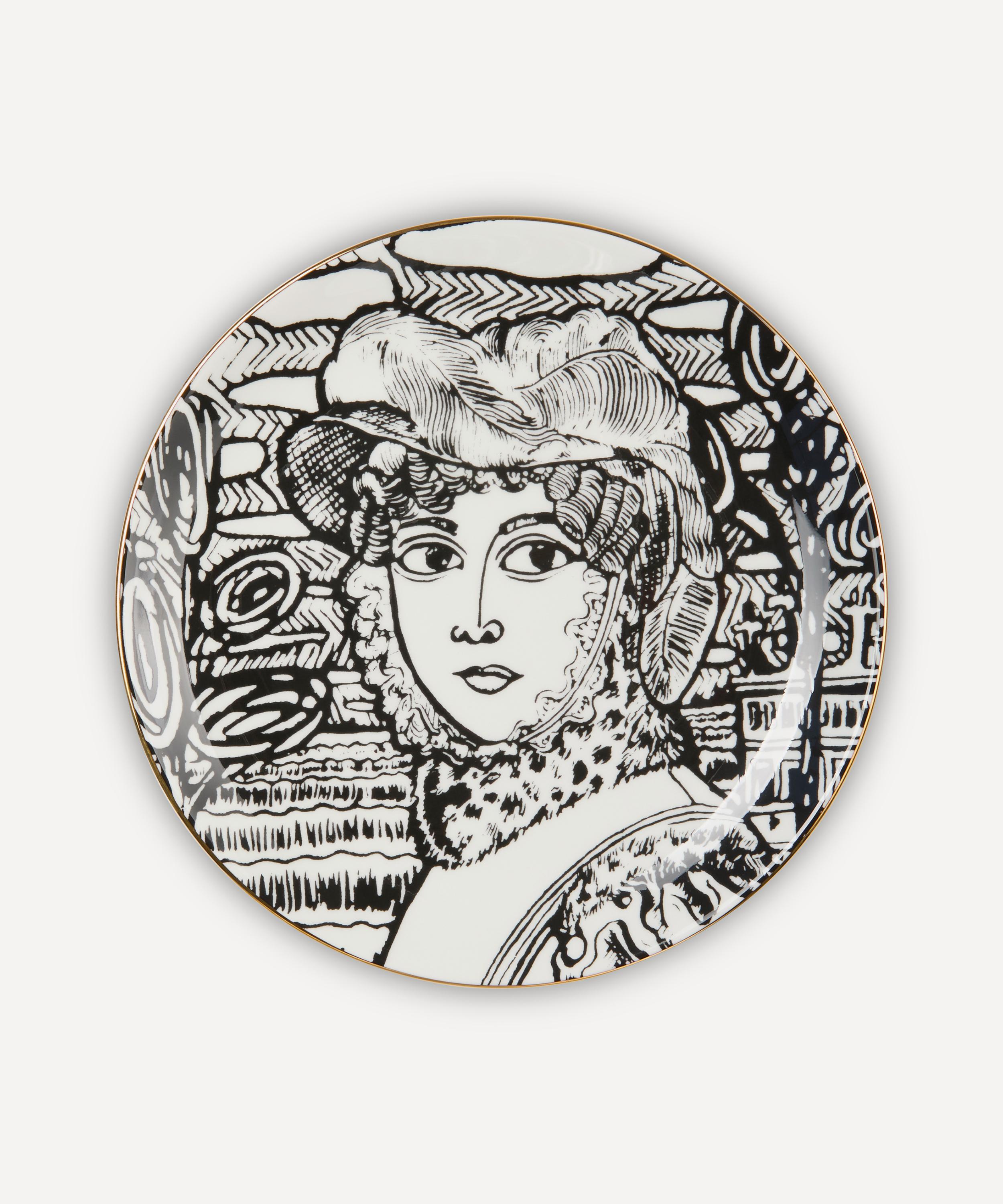 The intricate design of this plate is inspired by the artwork The Great Beauty, 2024. The original piece is a cabinet heavily decorated with ceramic female portraiture, created in celebration of friendship and in response to the abundant furniture and miniatures housed in the Wallace Collection. Each plate highlights a hand-picked, beautifully detailed, portrait from the cabinet in monochrome.