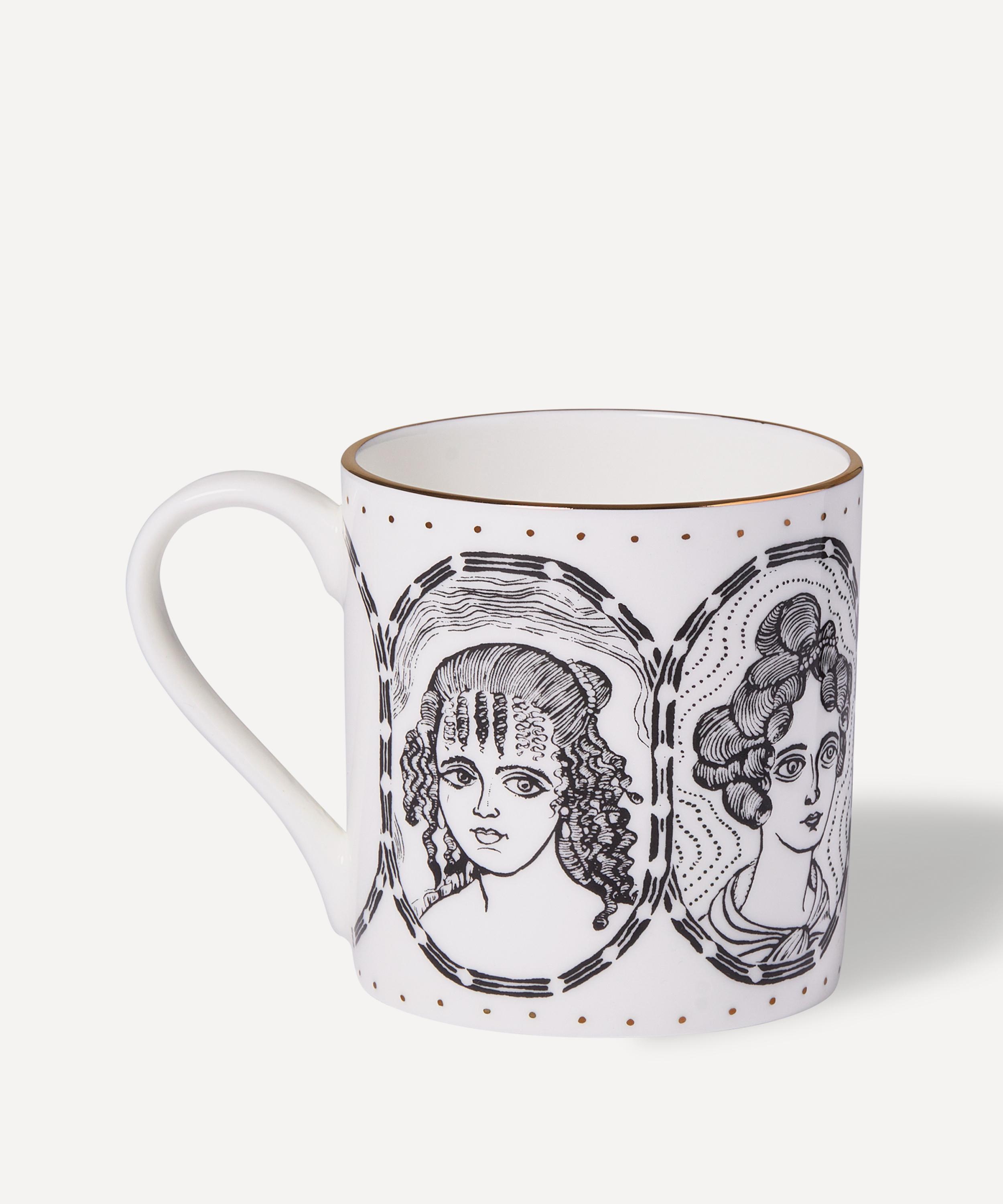 The intricate design of this mug is inspired by the artwork The Great Beauty, 2024. The original piece is a cabinet heavily decorated with ceramic female portraiture, created in celebration of friendship and in response to the abundant furniture and miniatures housed in the Wallace Collection. The decoration on the mug highlights four of these beautifully detailed portraits in monochrome, with a lustre rim and handle for a delicate finish.Delivery & Returns