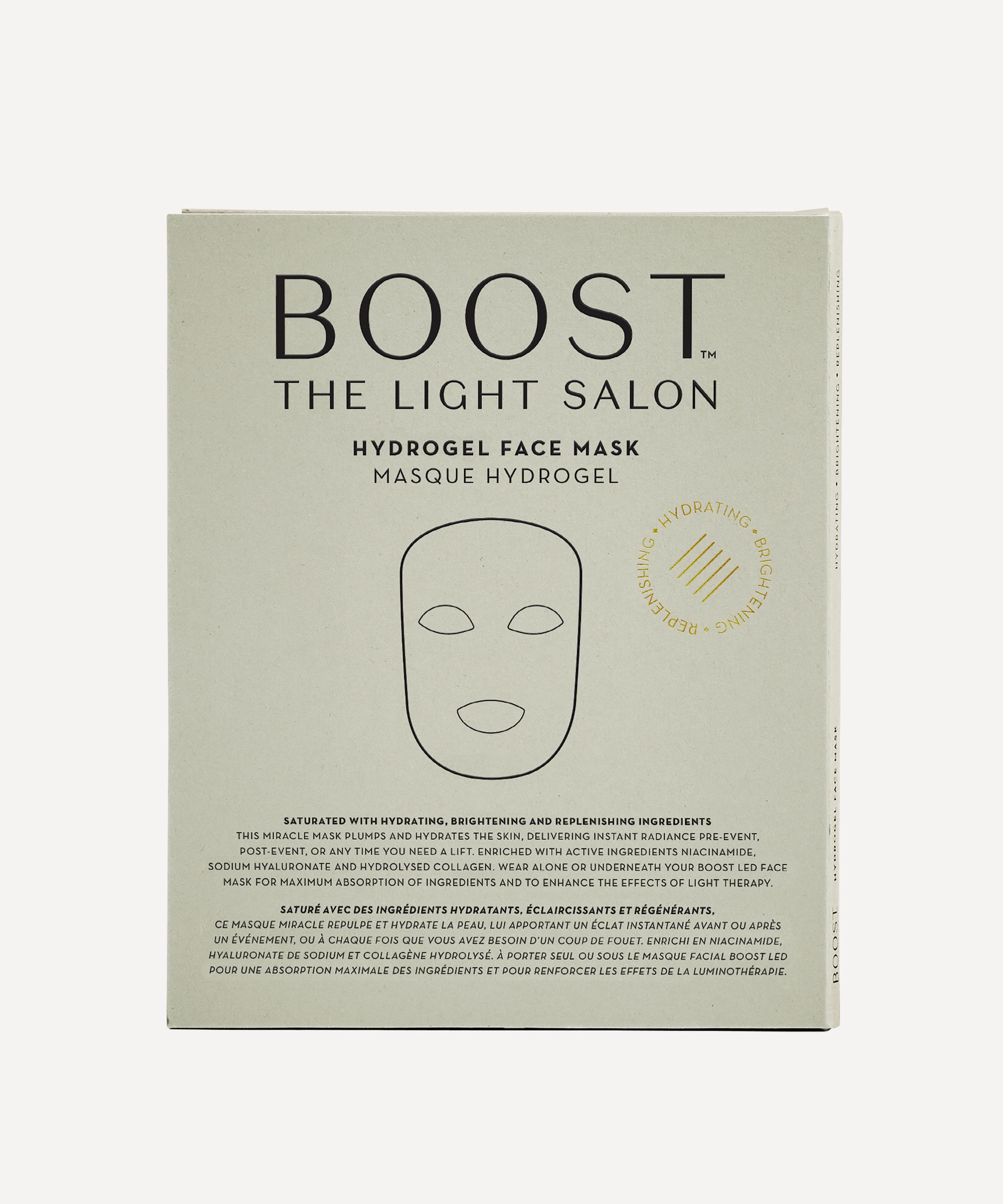 The Light Salon's illuminating Boost Hydrogel Face Mask delivers an intense dose of hydration for a smooth, filter-like finish.
