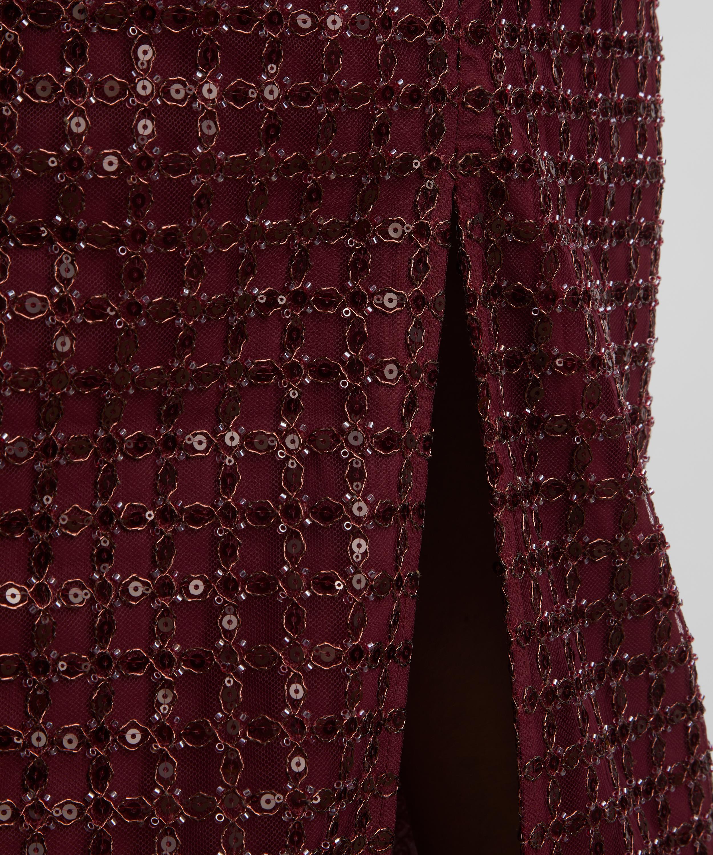 Adorned all-over with an intricate beaded pattern, this sleeveless maxi dress exudes timeless elegance with a fitted silhouette and straight neckline. Effortlessly sleek, it’s finished with a back slit for ease of movement.