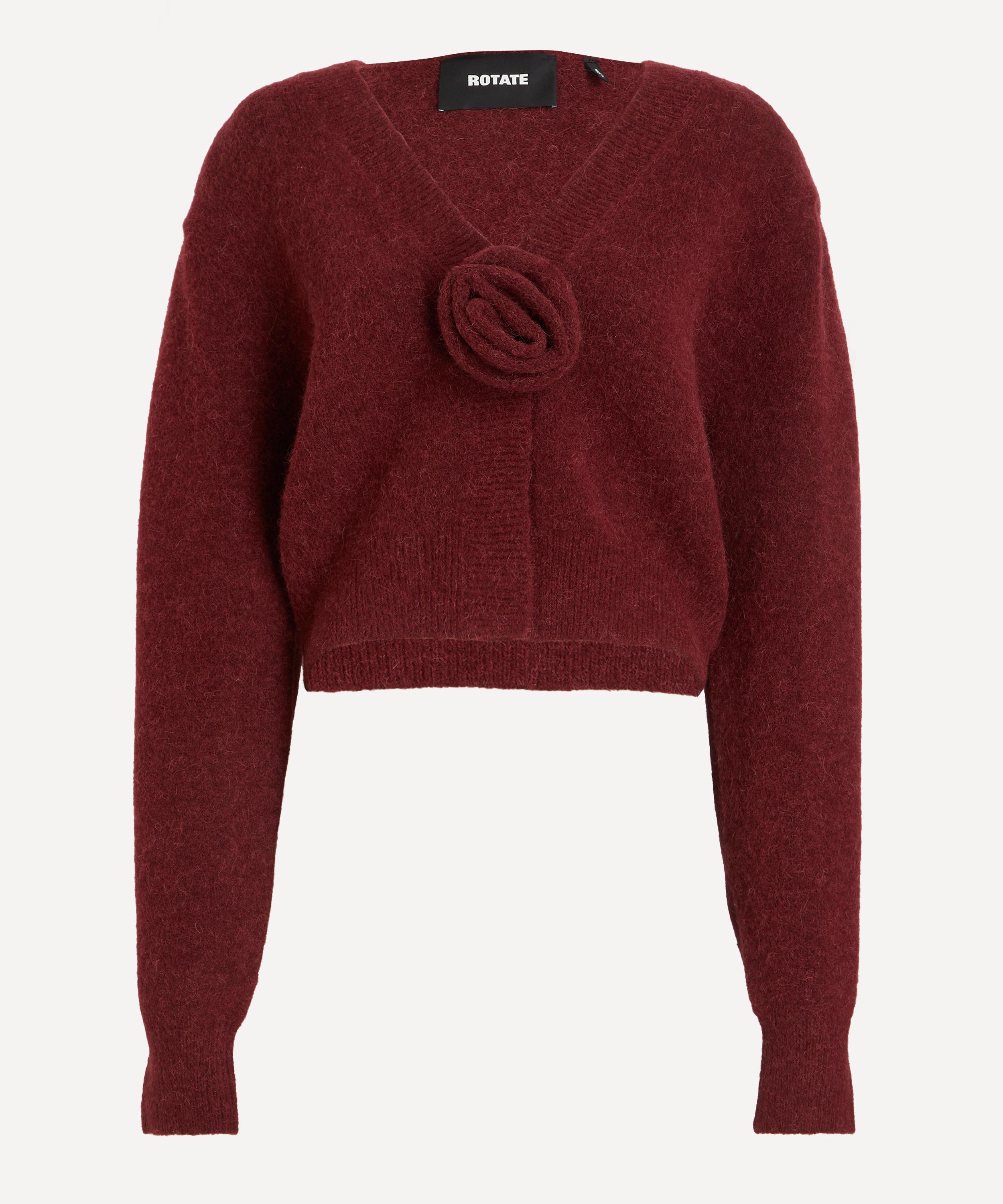 Spun from a plush alpaca-wool blend, this cropped cardigan is defined by its deep V-neckline and sculptural sleeves, shaped with removable shoulder pads. A delicate knitted rosette at the centre front lends a subtle romantic accent.