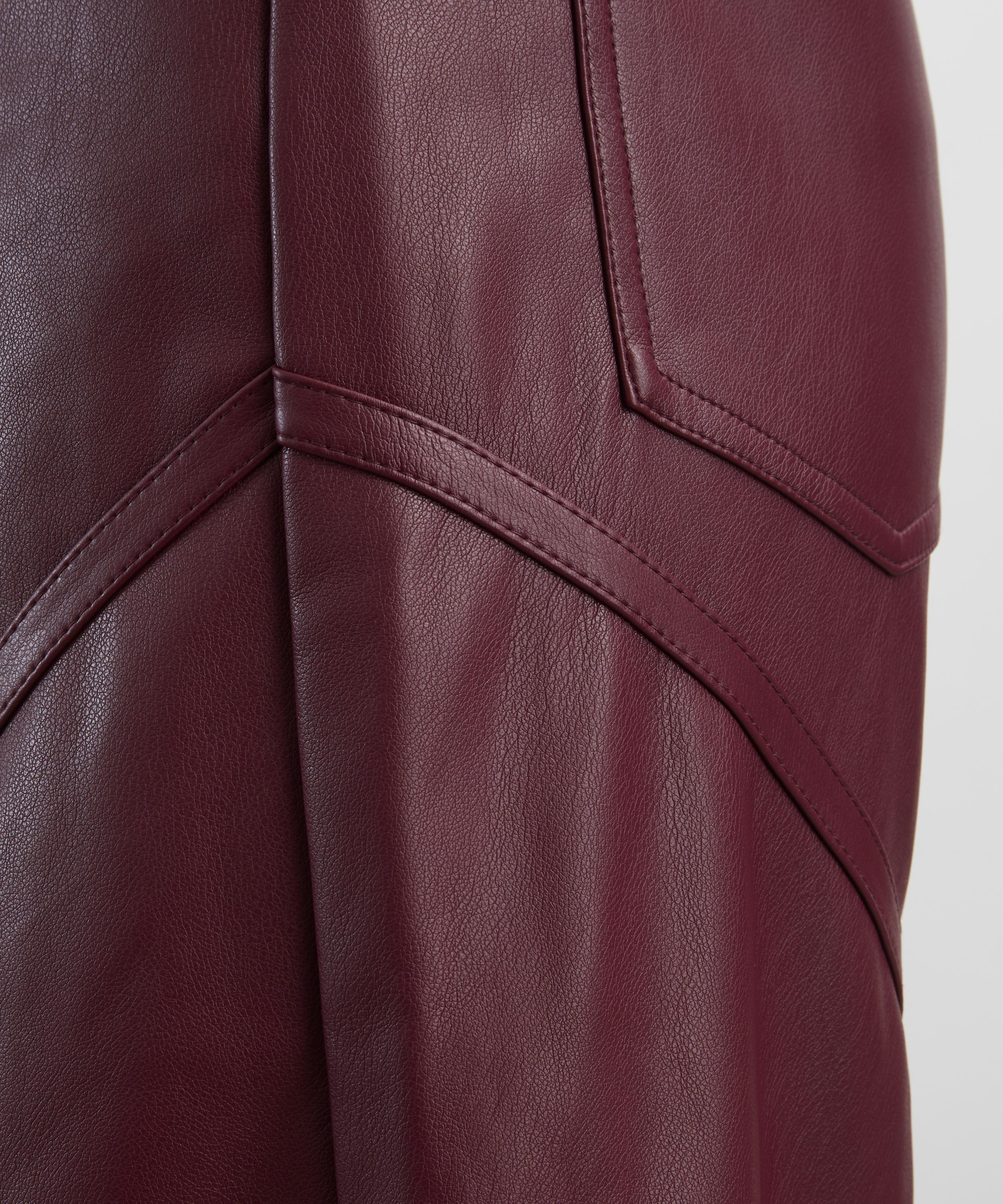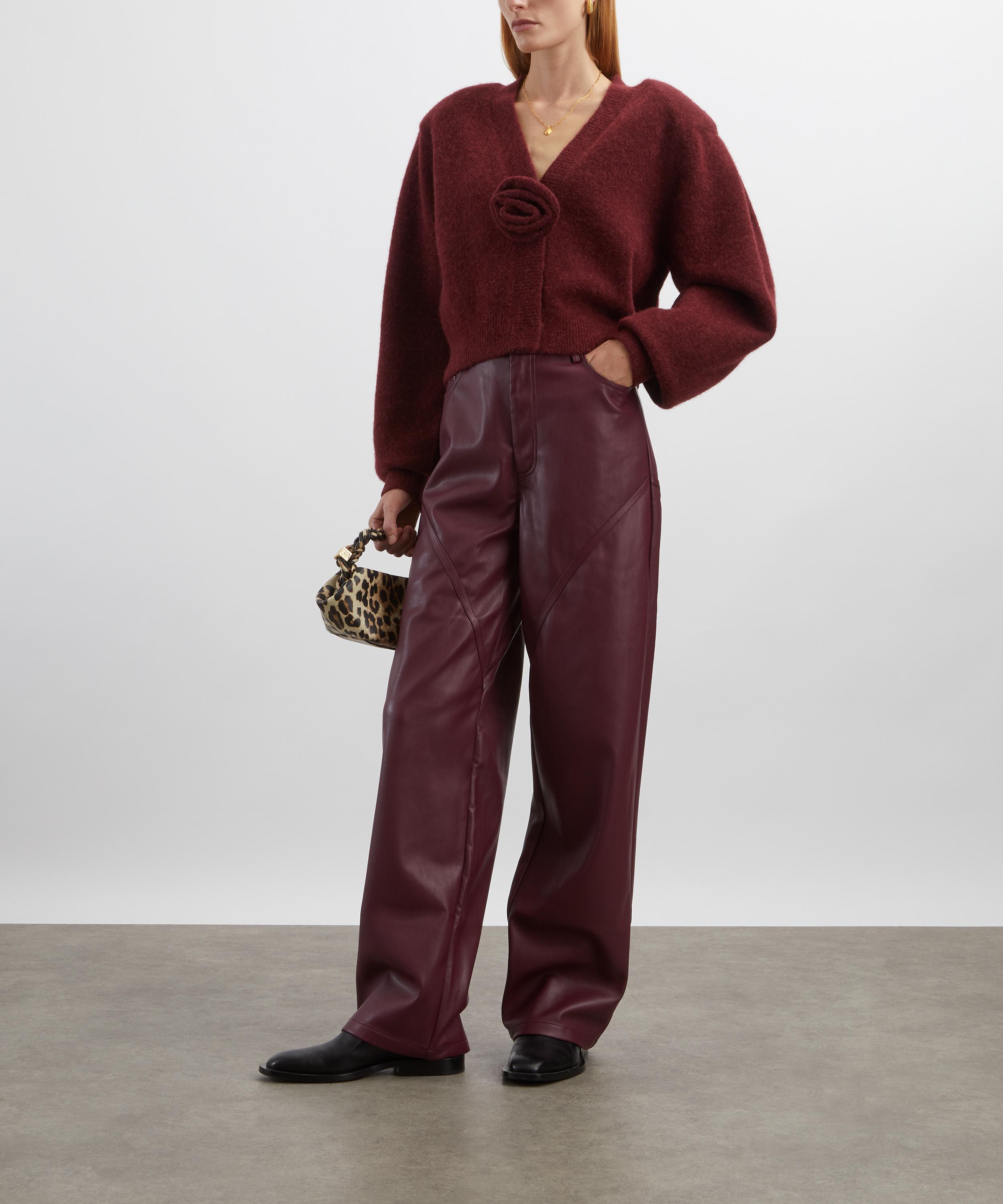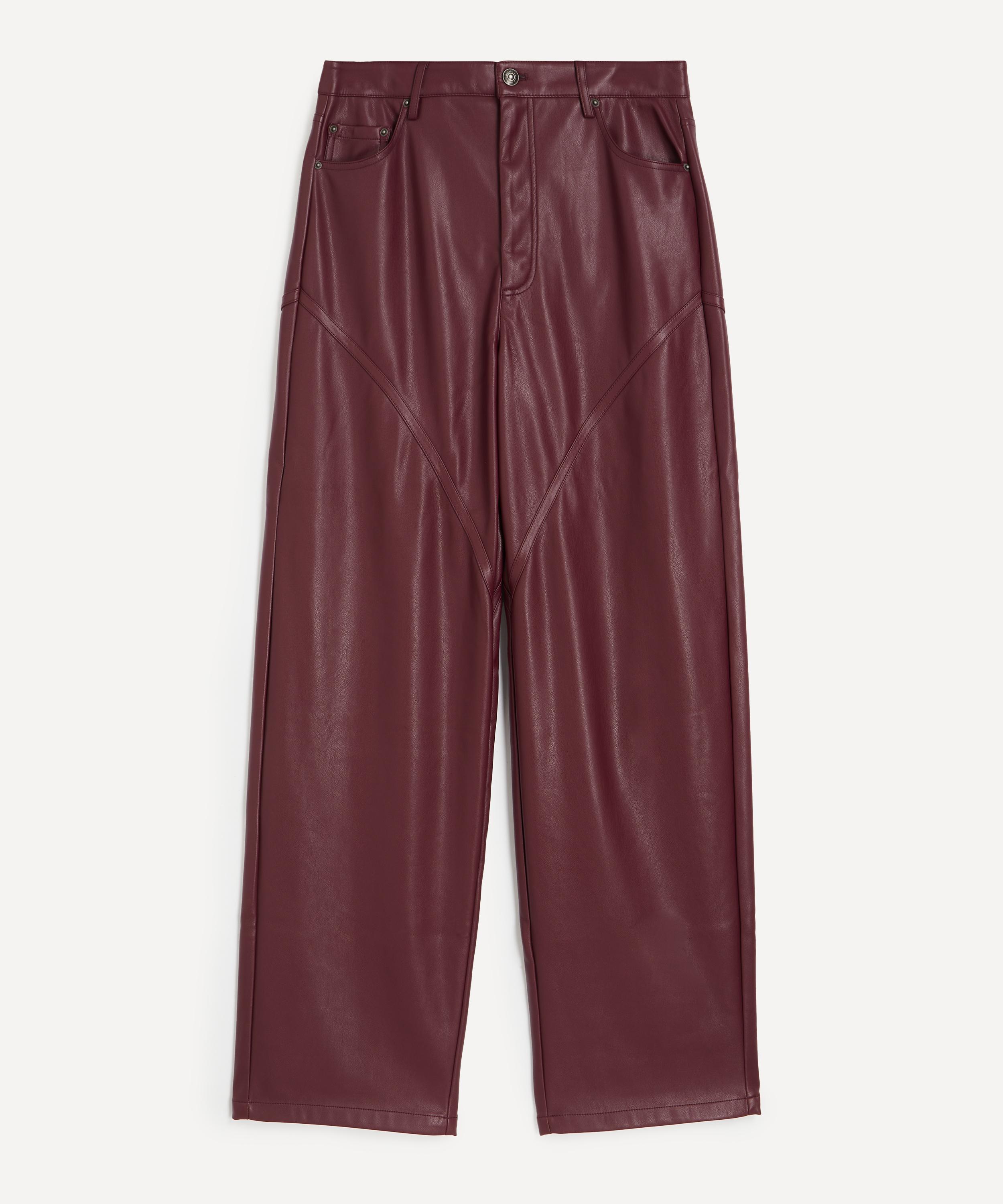 Crafted from burgundy faux leather, these trousers feature a structured mid-rise waist and a voluminous wide-leg silhouette, enhanced by curved piping details at the front and back. Drawing inspiration from classic denim, they’re finished with five-pocket styling and an embossed logo patch at the back waistband.
