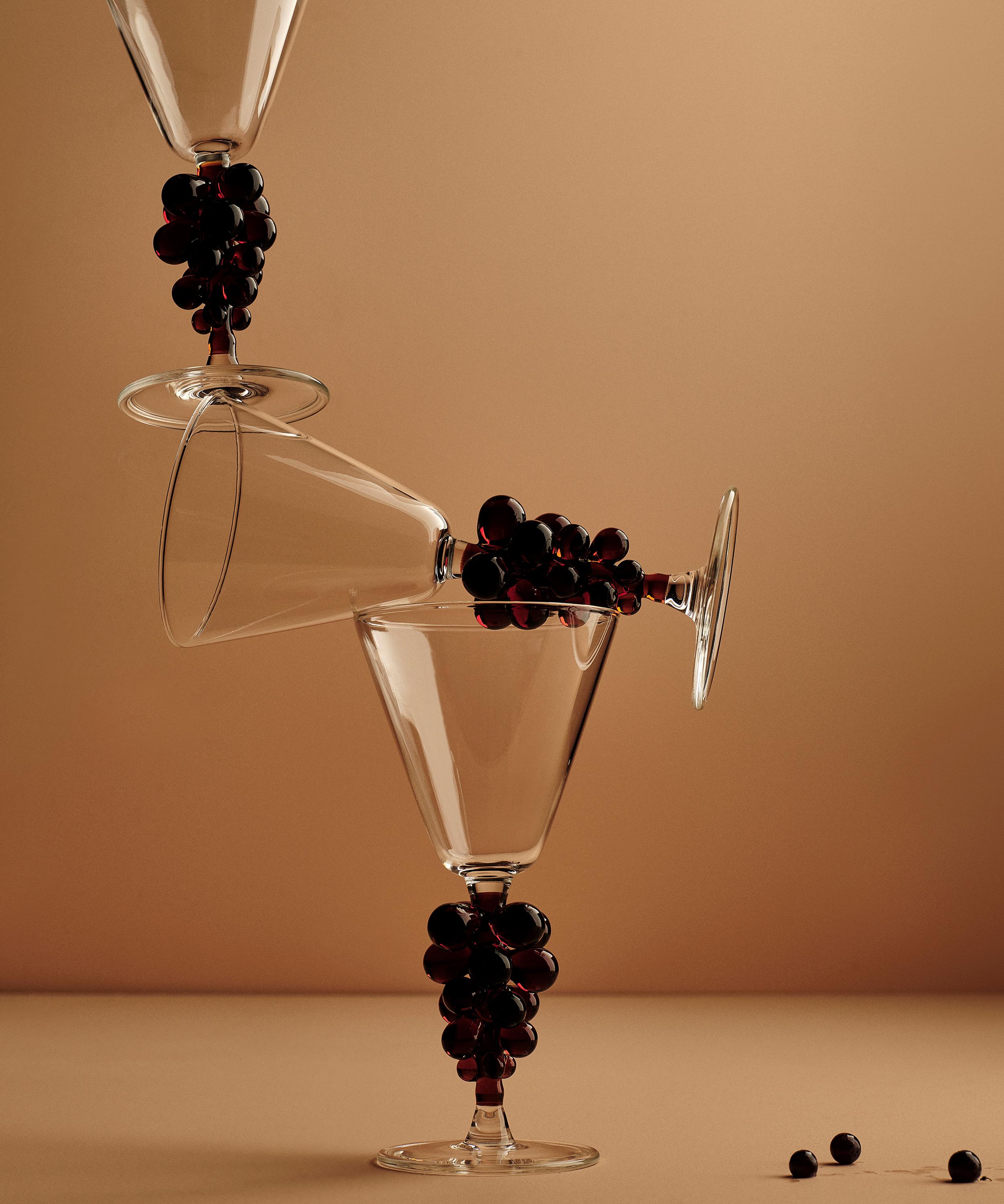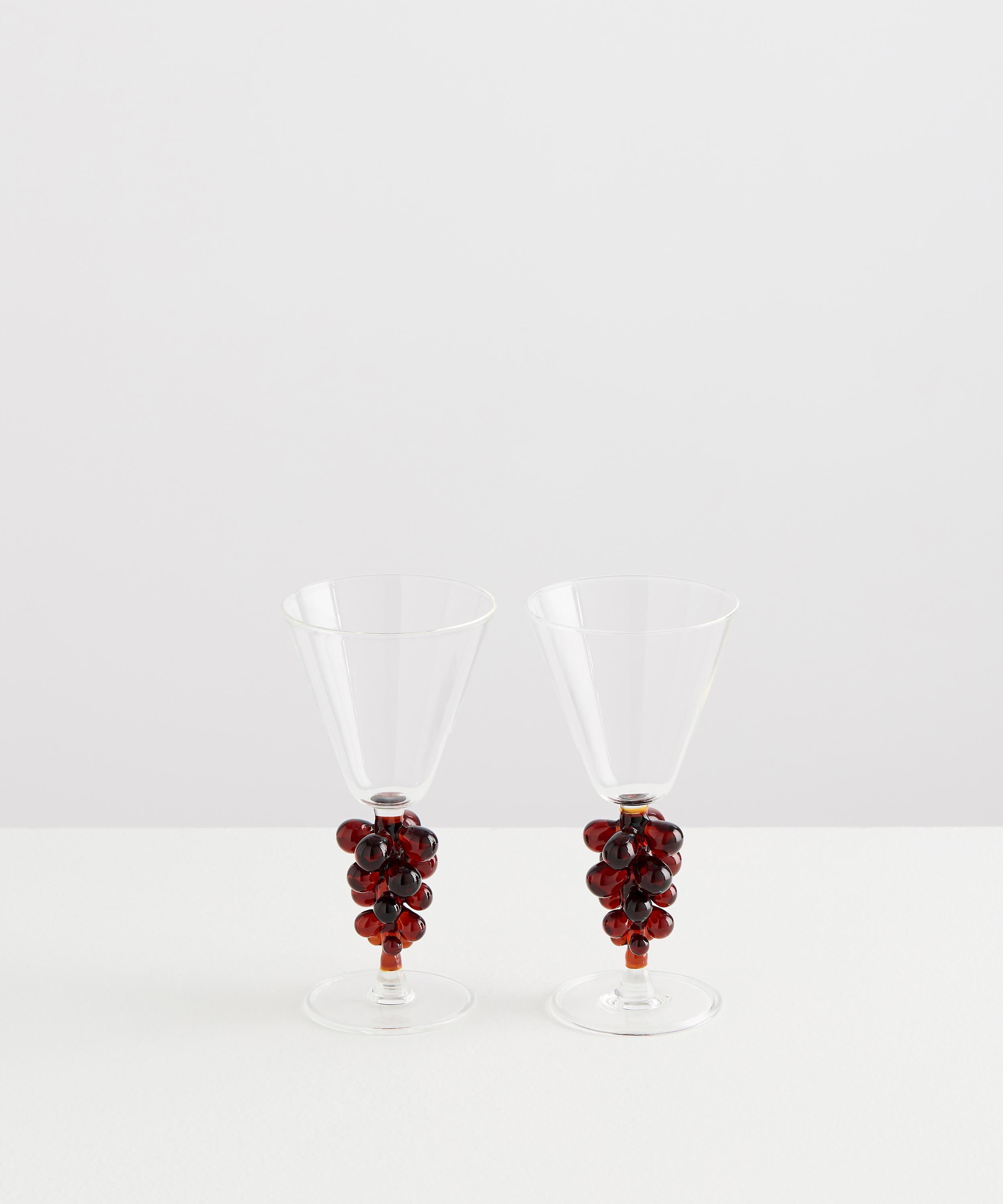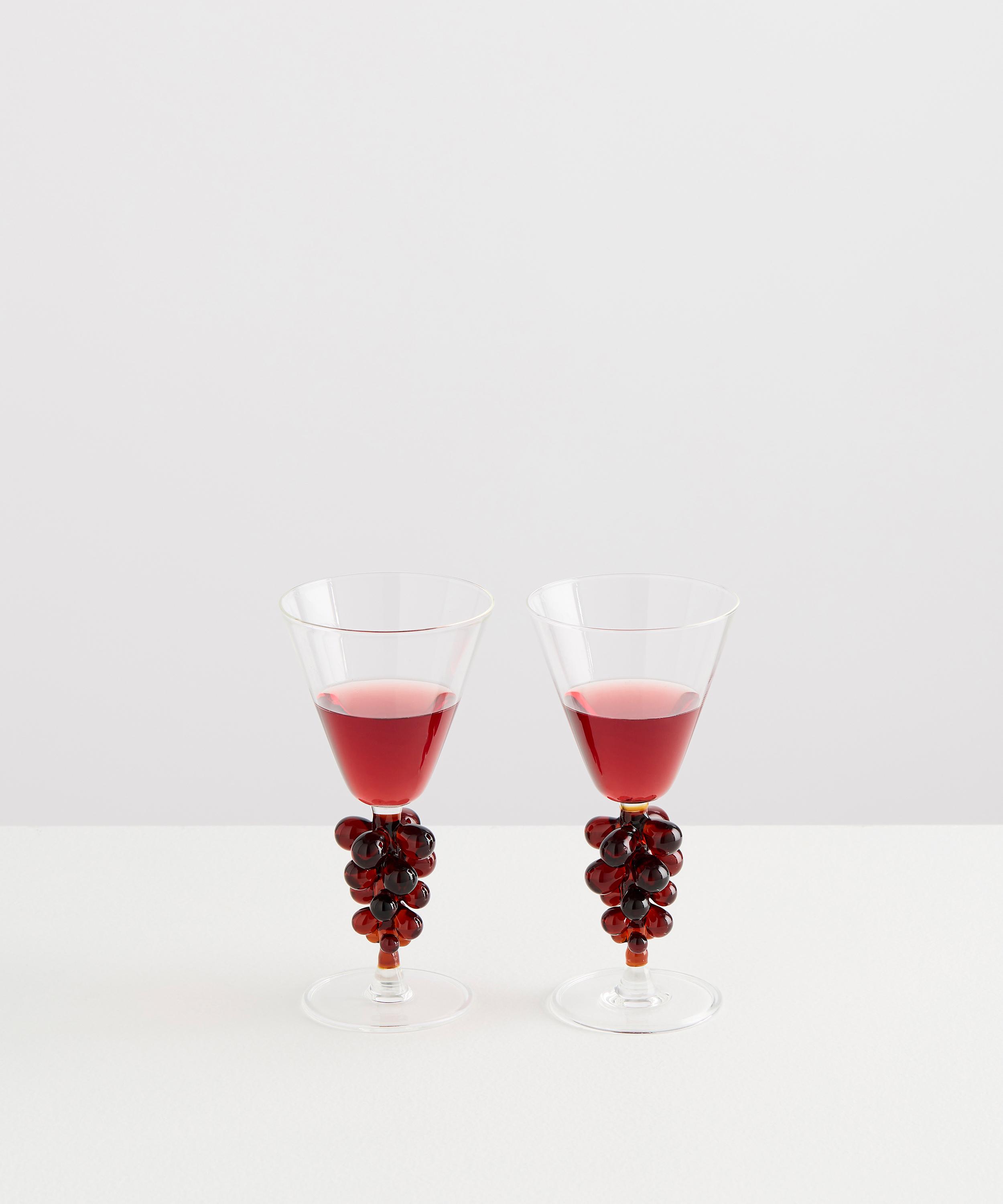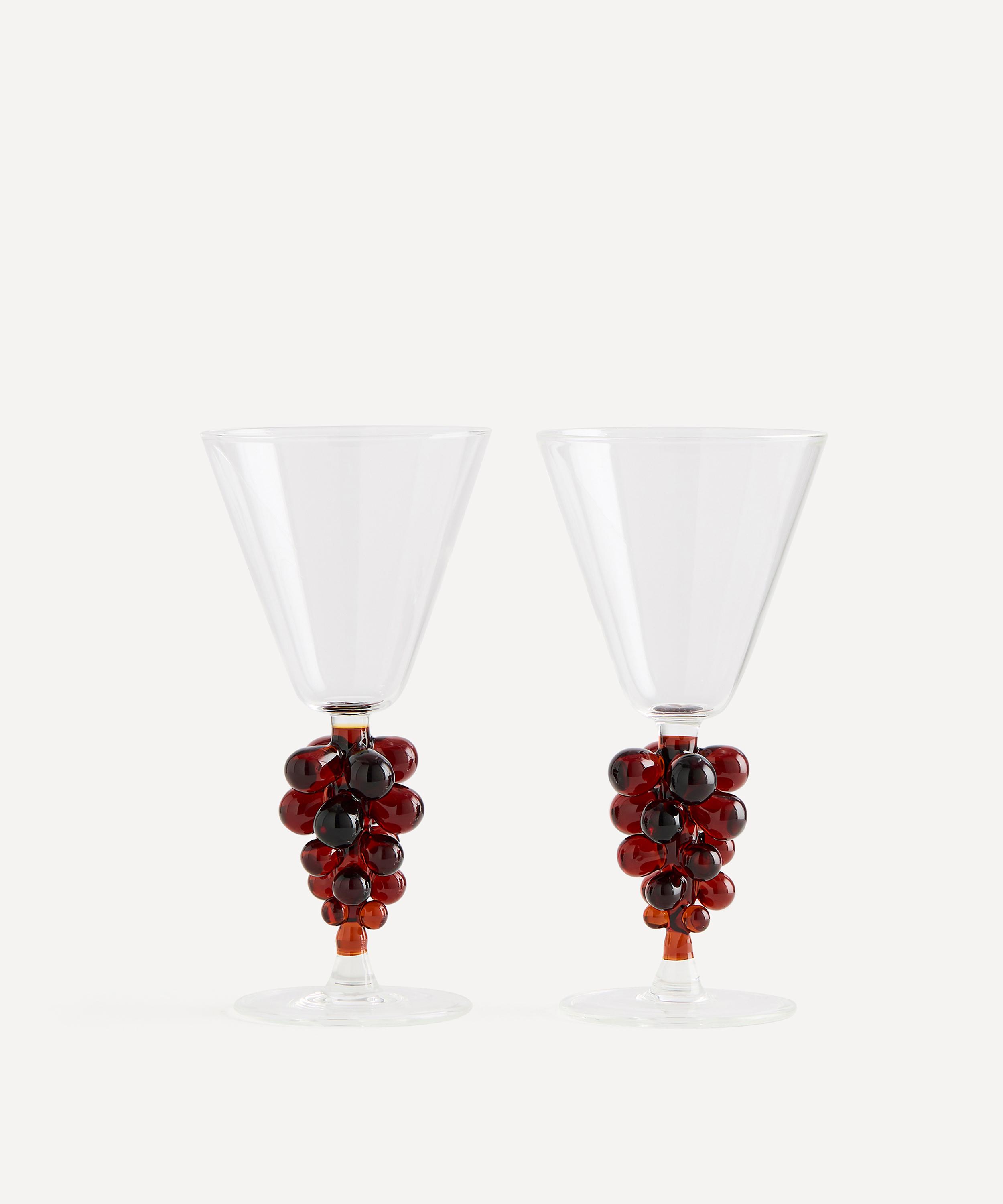 This enchanting pair of glasses are adorned with a delicate cluster of grapes along each of their stems, as if picked fresh from the vine. Mix and match alongside other statement glassware from the brand’s eclectic selection for an artistically informed tablescape.