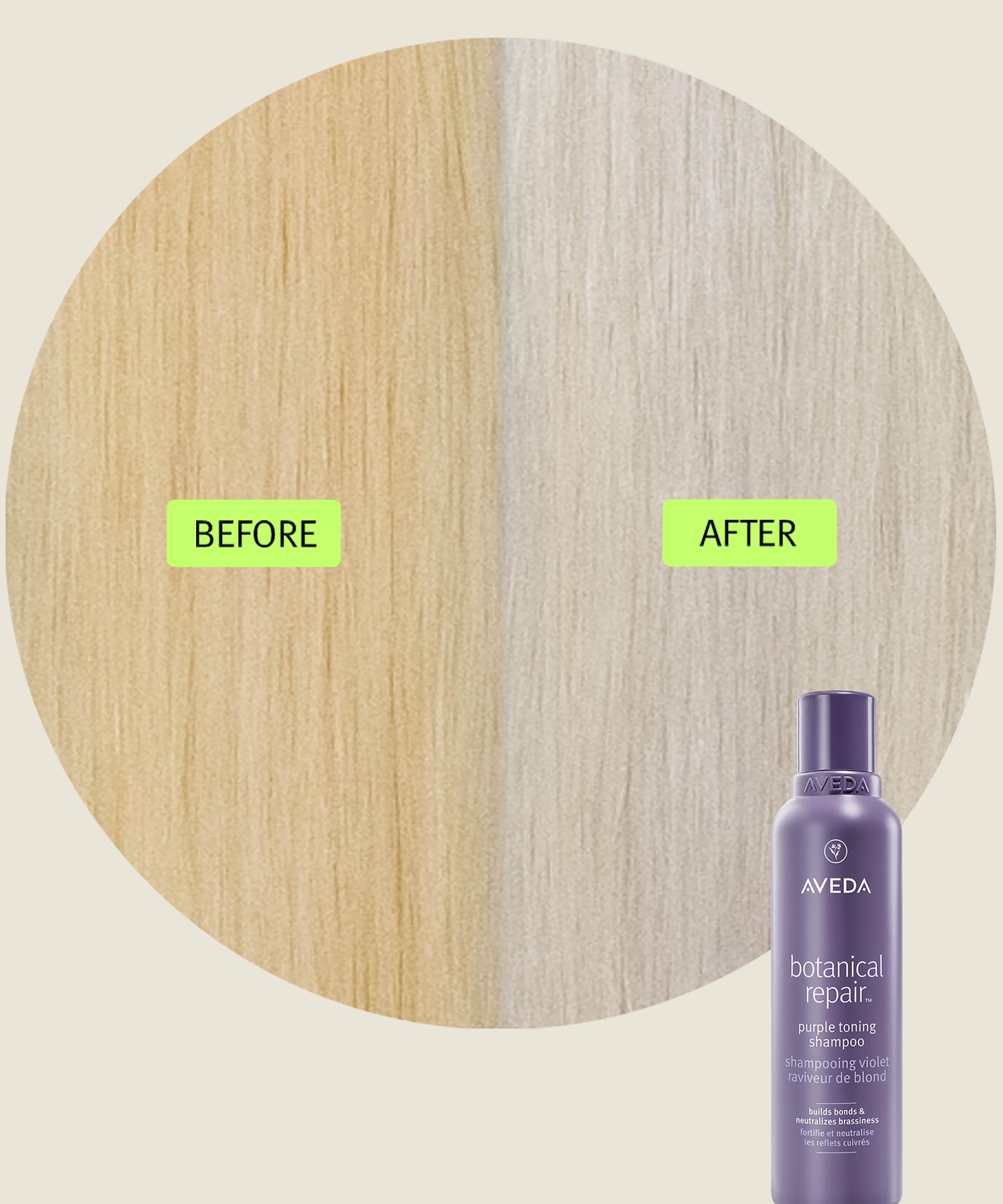 To neutralise brassy and yellow tones, use Botanical Repair™ Purple Toning Shampoo each wash day until your desired color is achieved. Then, use weekly or as needed to maintain your desired tone.