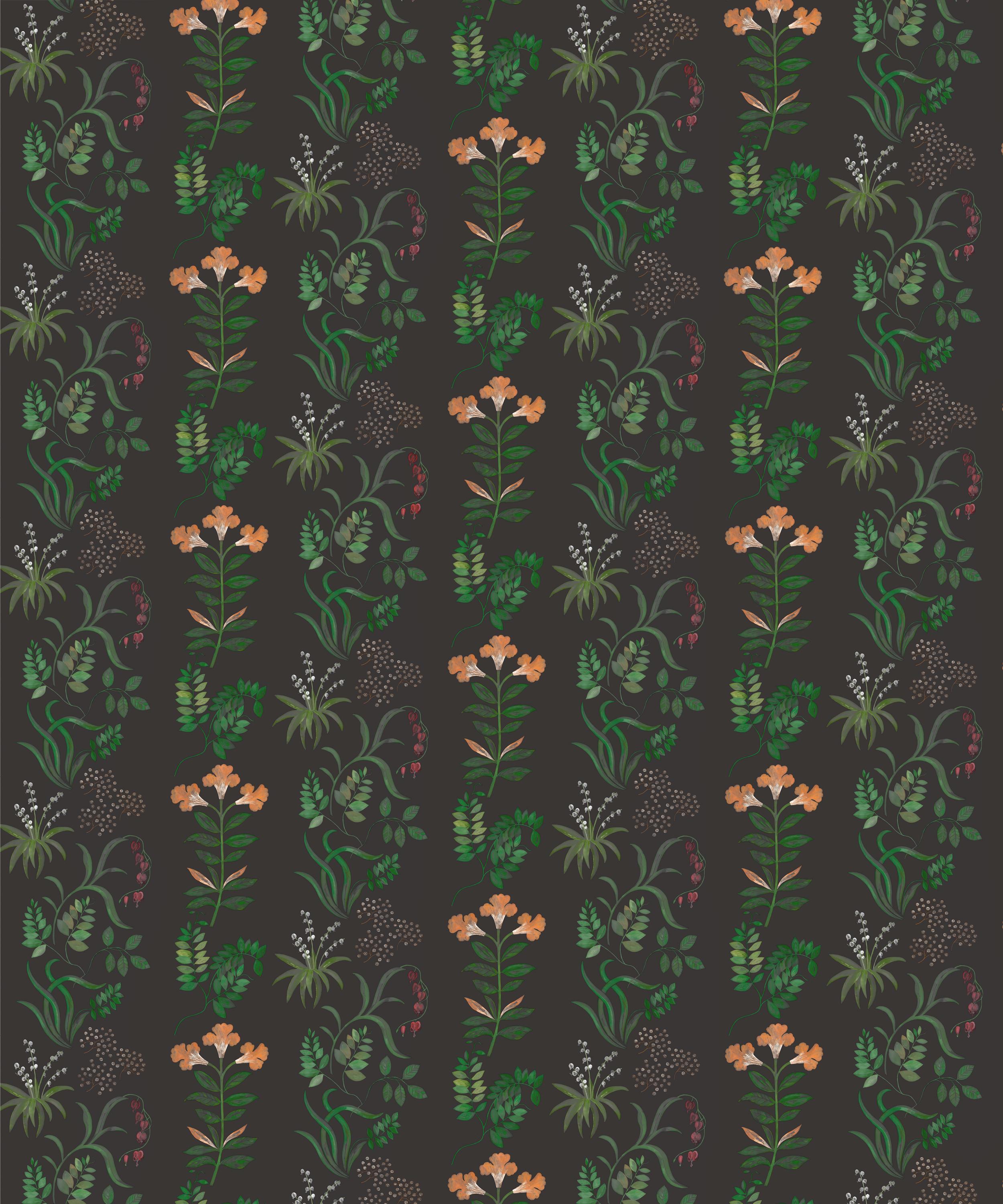 Hand-painted in the Liberty design studio, Botanical Stripe is a signature artwork of the Floribunda collection, celebrating the historic tradition of botanical illustration in Britain. Botanical Stripe is printed using a fine mesh gravure technique, bringing to life the soft painterly nature of the motifs. Matte and metallic pigments are layered in varied degrees of tonality to create a subtle luminescence, reminiscent of Victorian cyanotypes.