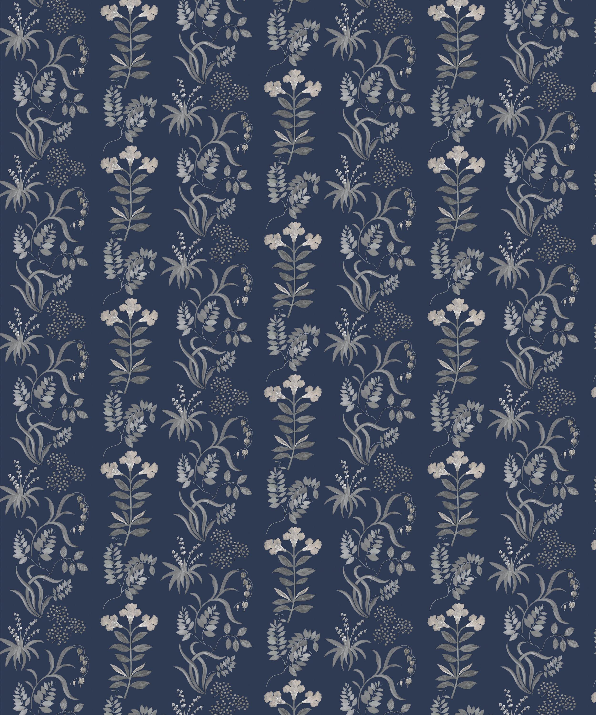 Hand-painted in the Liberty design studio, Botanical Stripe is a signature artwork of the Floribunda collection, celebrating the historic tradition of botanical illustration in Britain. Botanical Stripe is printed using a fine mesh gravure technique, bringing to life the soft painterly nature of the motifs. Matte and metallic pigments are layered in varied degrees of tonality to create a subtle luminescence, reminiscent of Victorian cyanotypes.