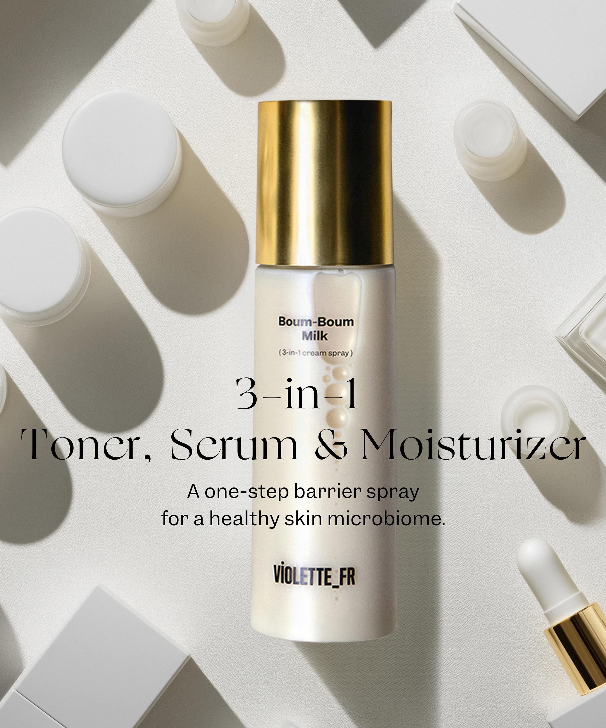 Boum-Boum Milk is an innovative, cult-favourite 3-in-1 toner, serum, and moisturiser from VIOLETTE_FR, expertly crafted to soothe and hydrate all skin types in an instant, including sensitive and acne-prone skin.