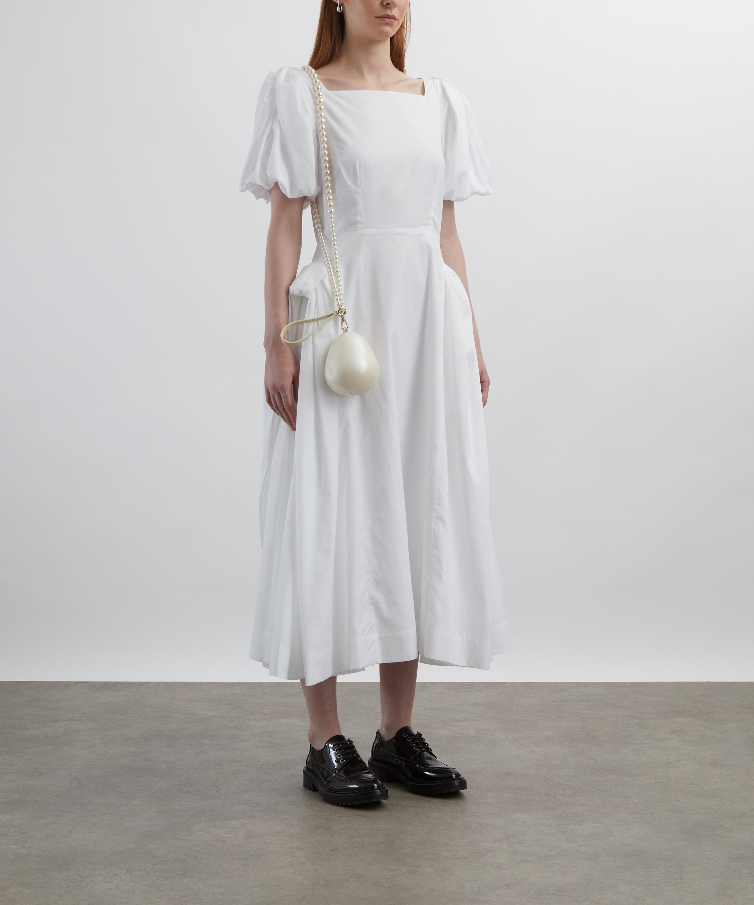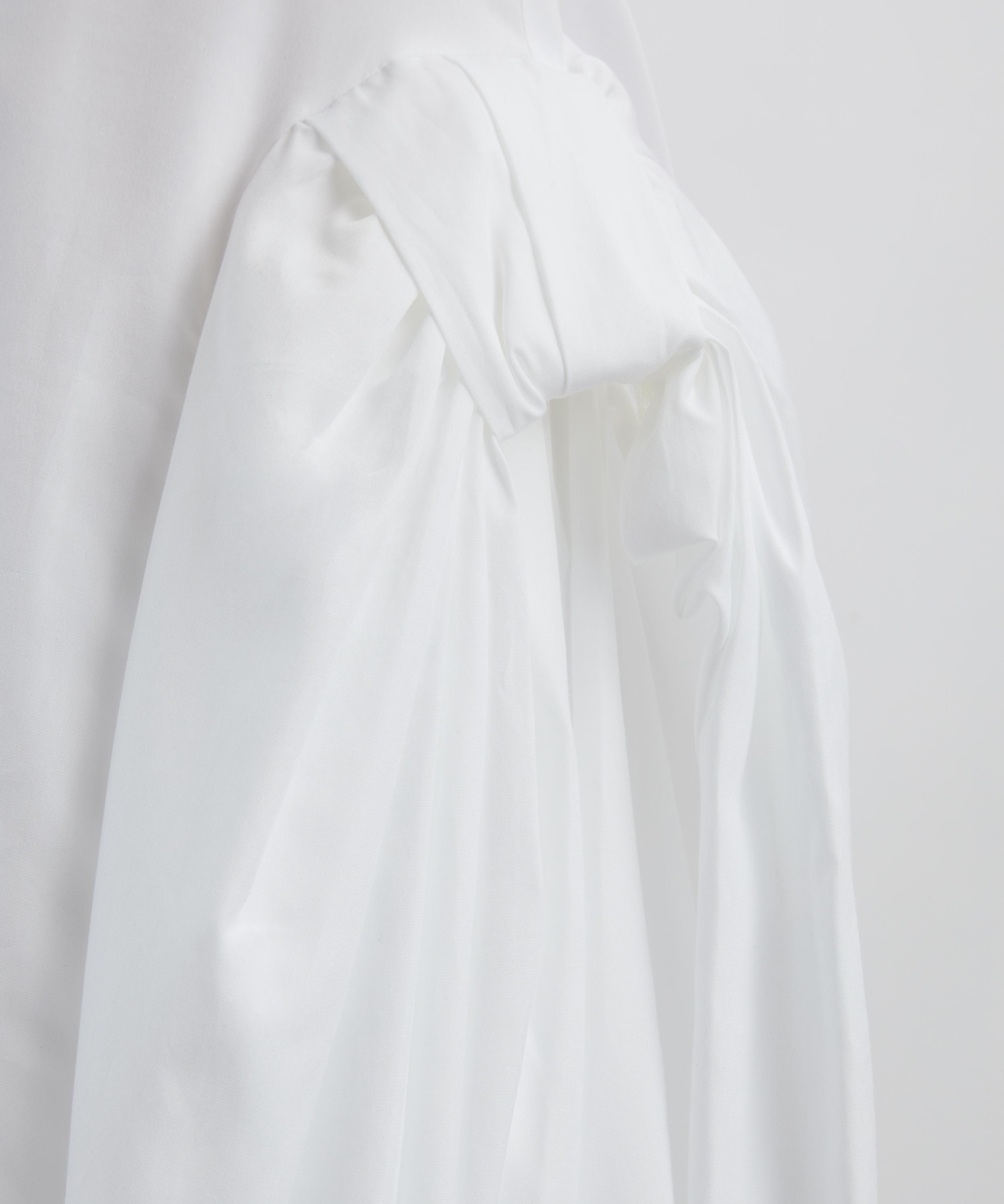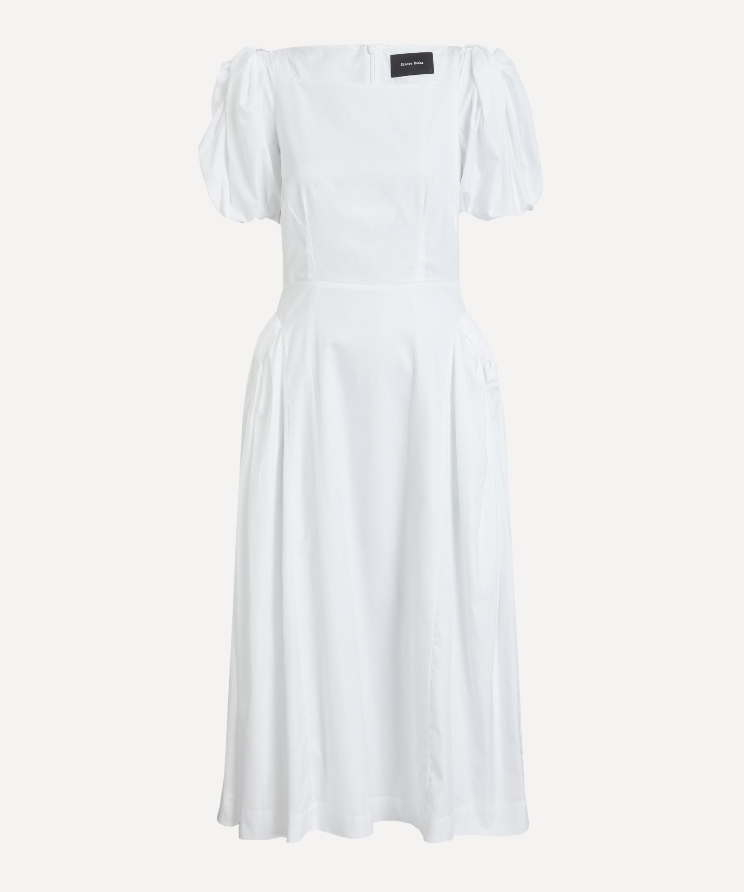 Crafted from crisp cotton poplin, this dress features a square neckline, short puff sleeves, and exaggerated hip detailing that together create a voluminous yet undeniably romantic silhouette.