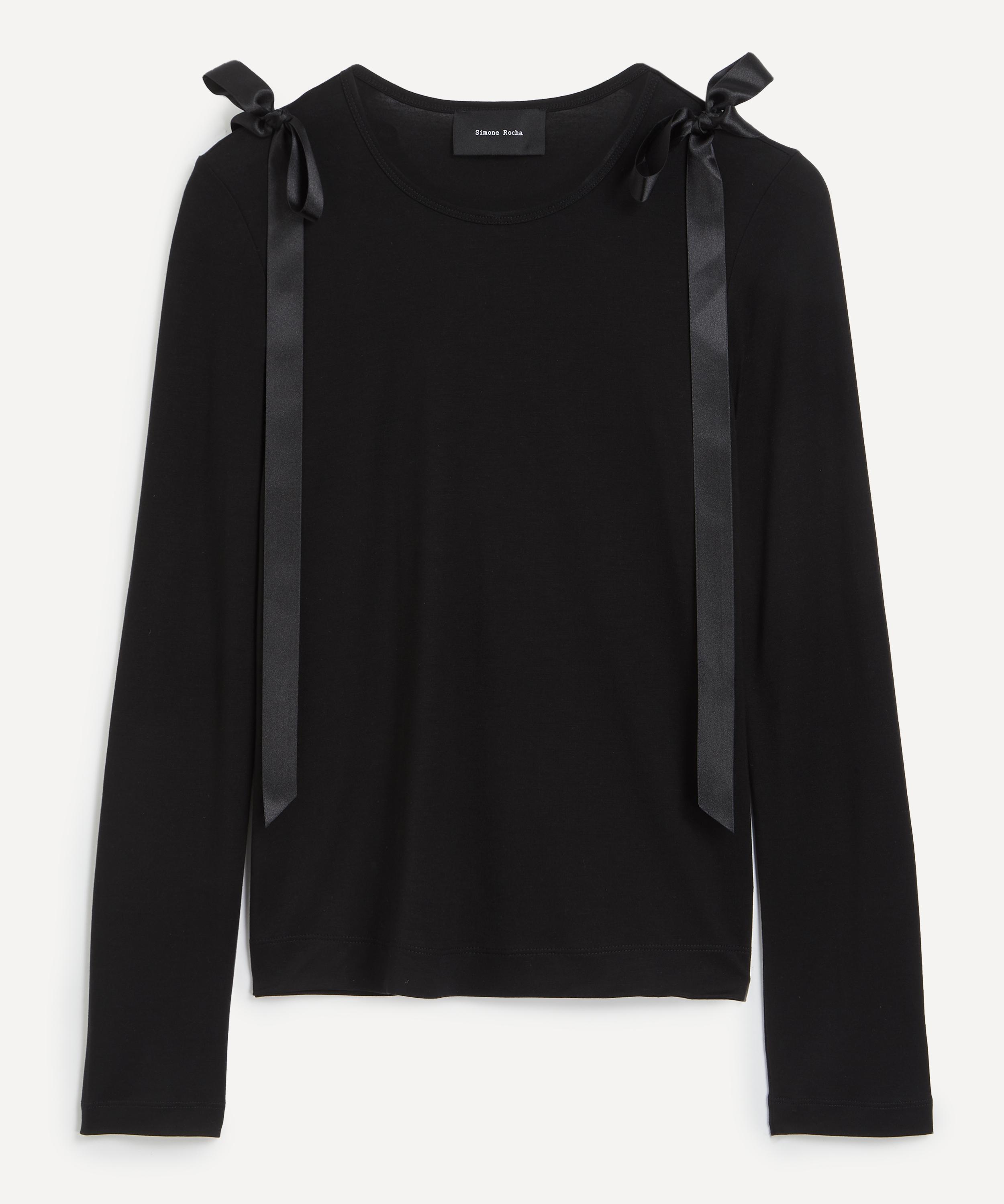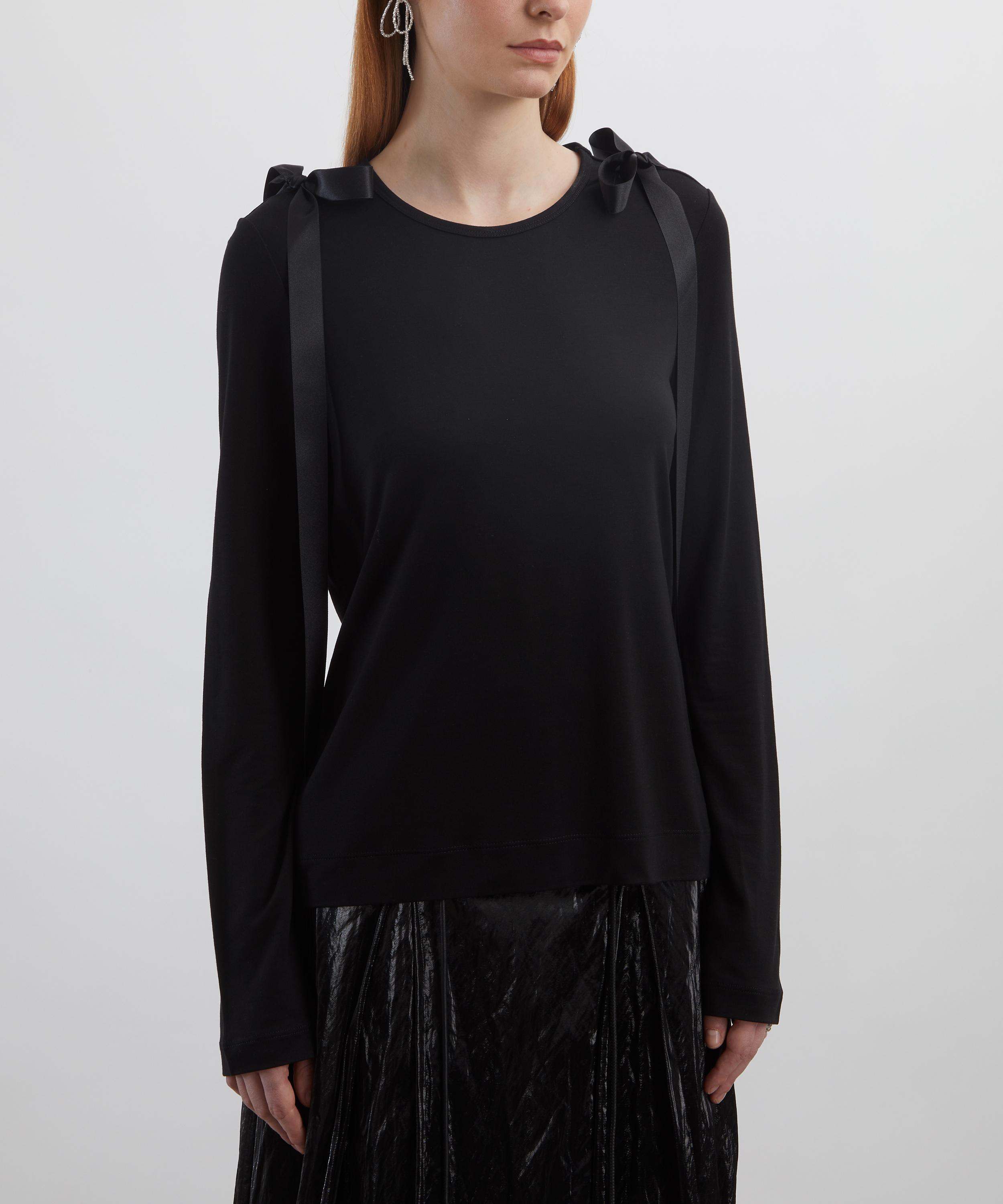 Crafted from lightweight jersey, this black long-sleeve top is accented with decorative bow ribbons at the shoulders, adding a soft, draped touch of romantic elegance.