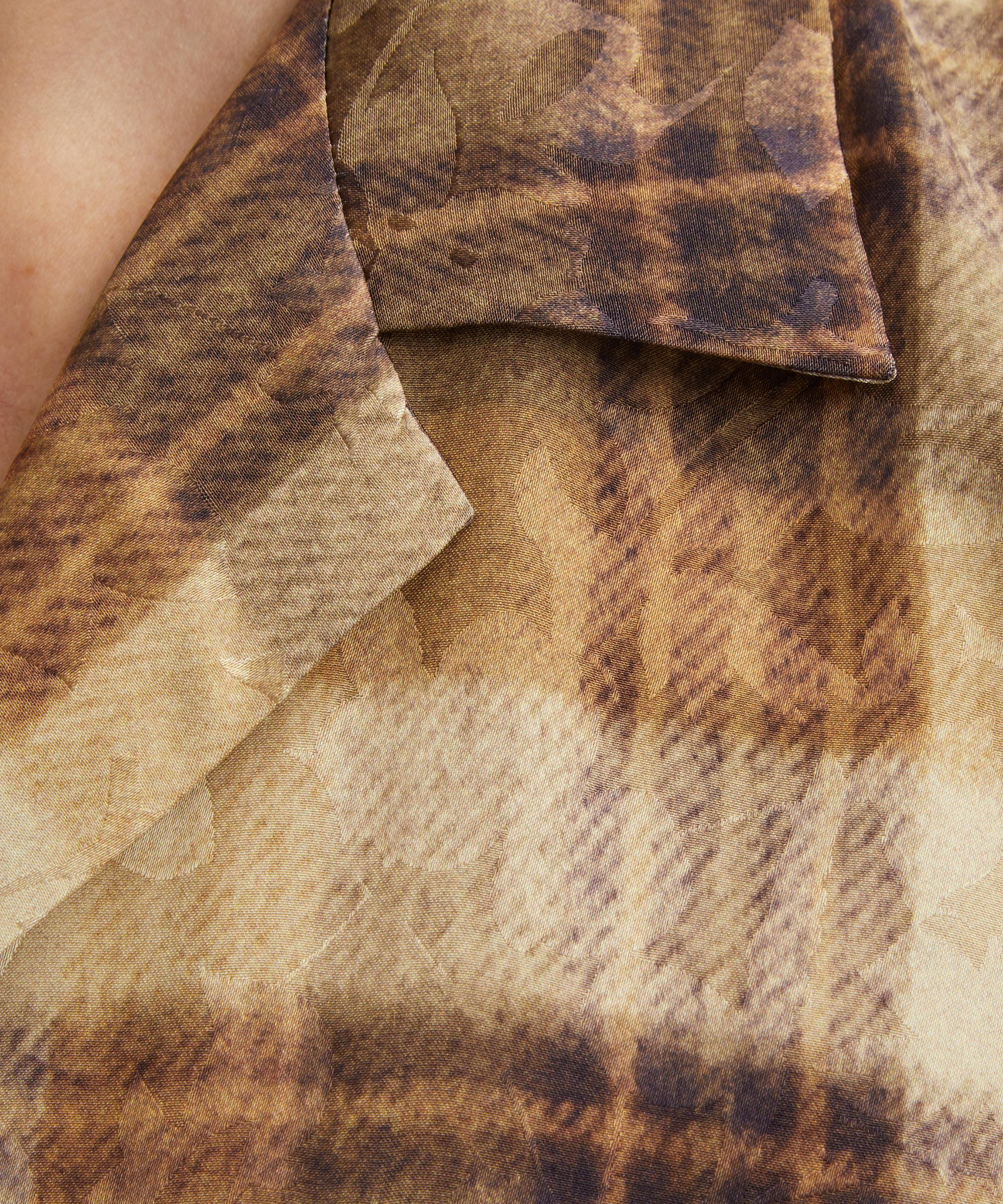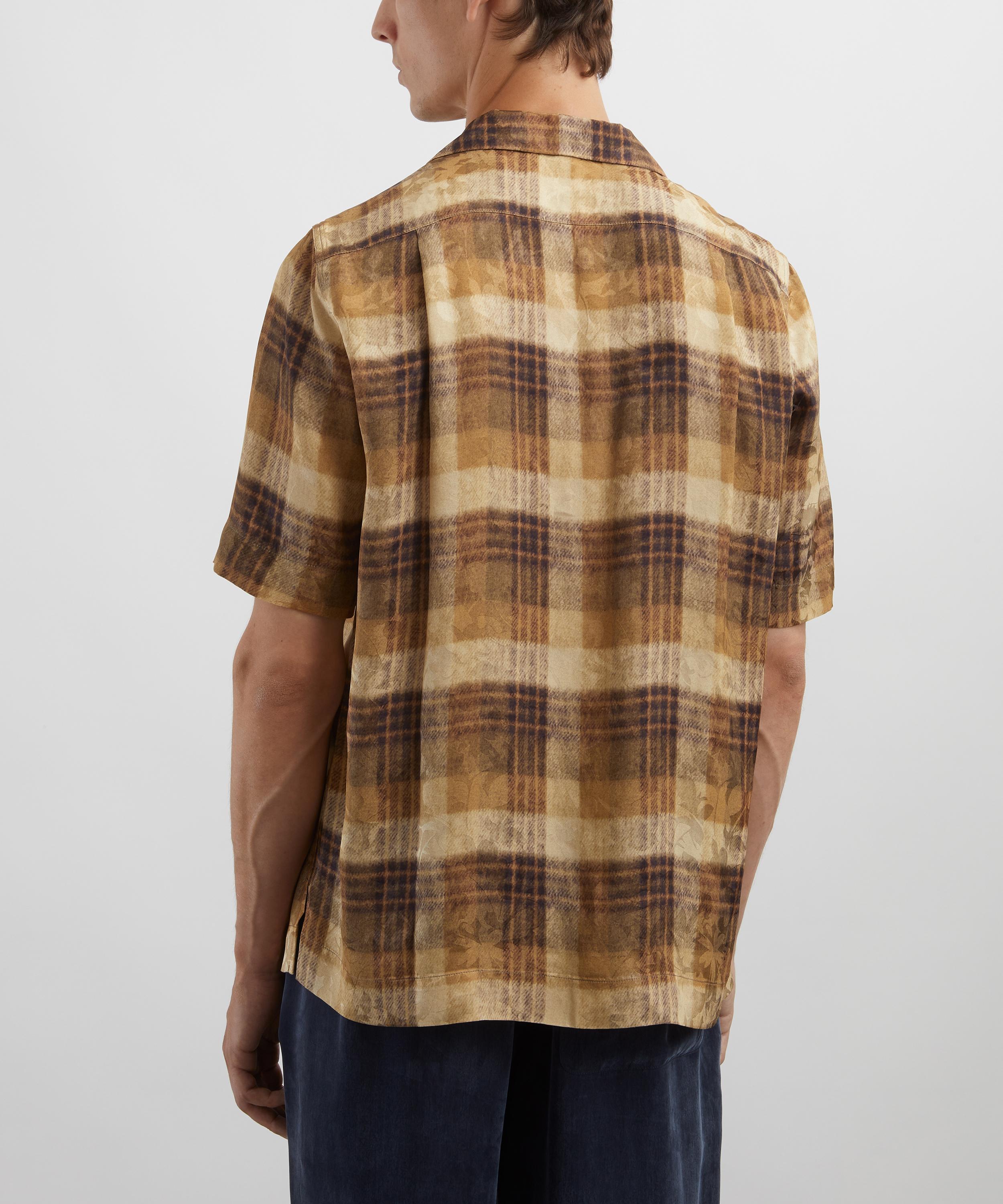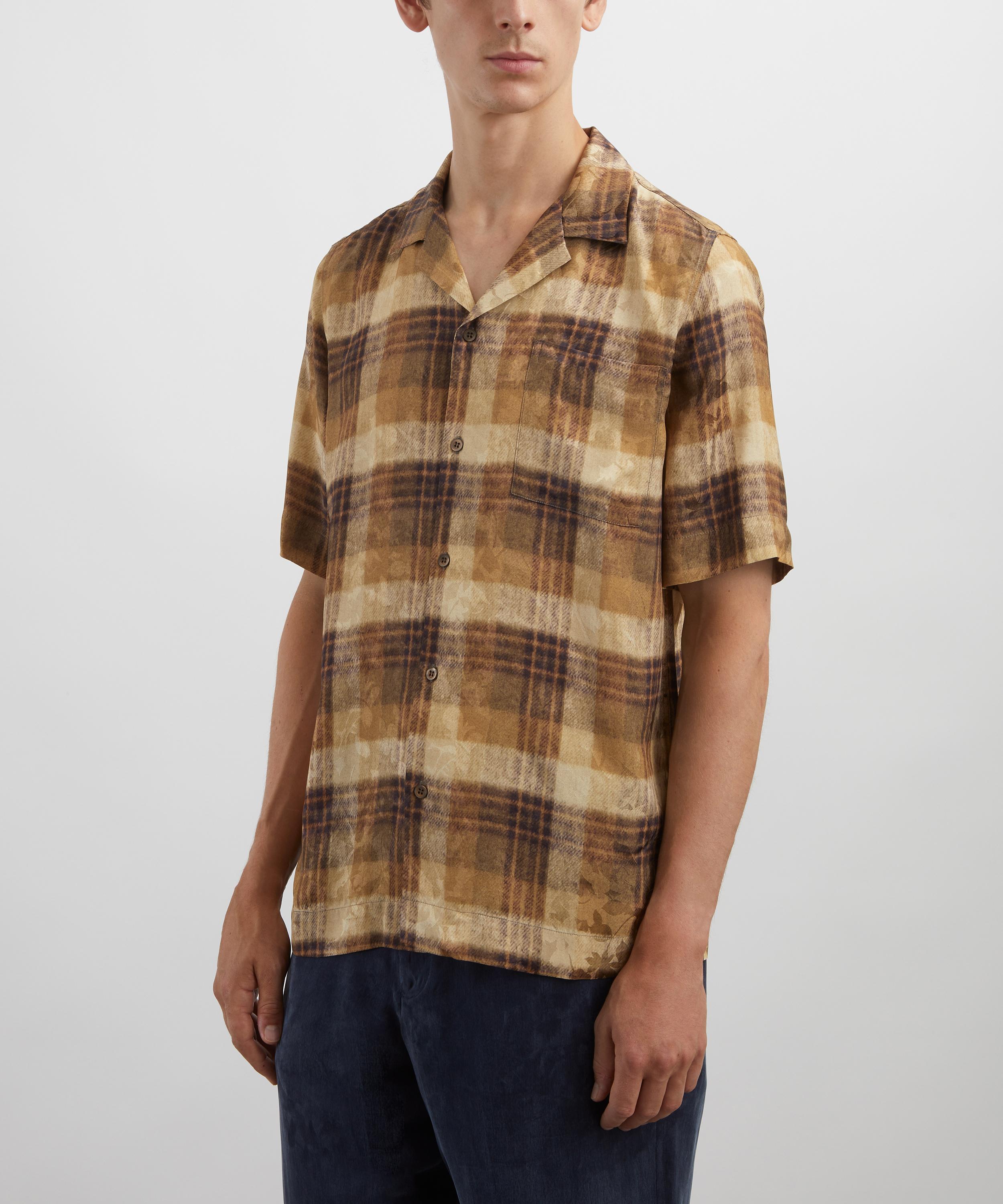 Crafted from lightweight viscose with a jacquard check print, this button-up shirt features a Hawaiian collar and short sleeves, offering a relaxed, laid-back look.
