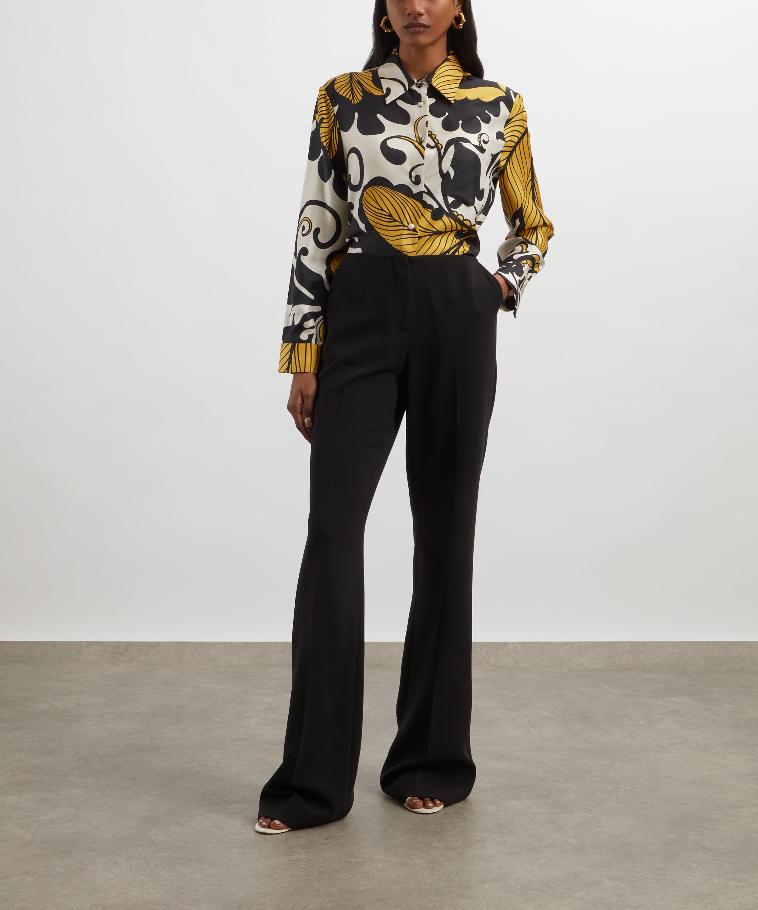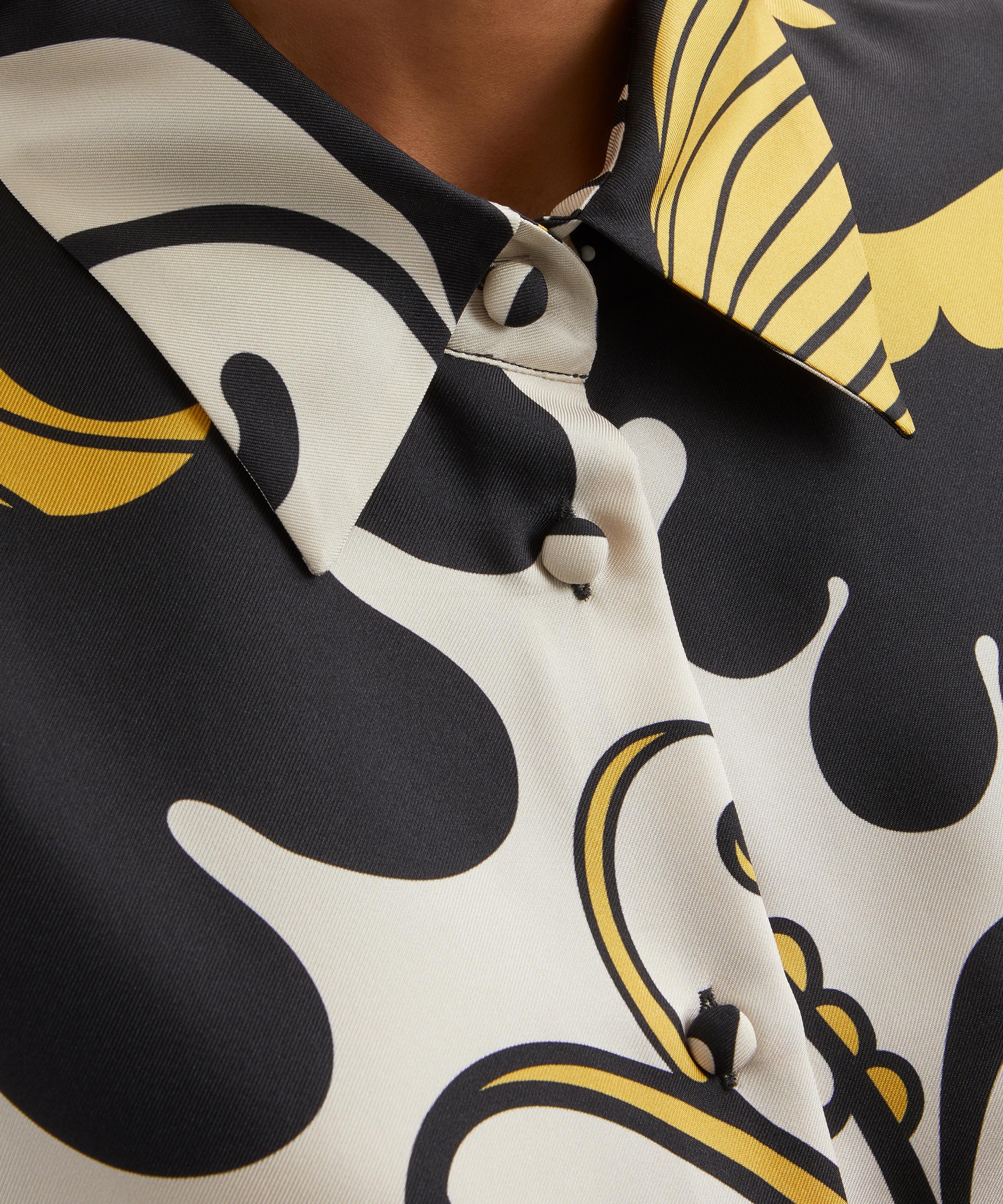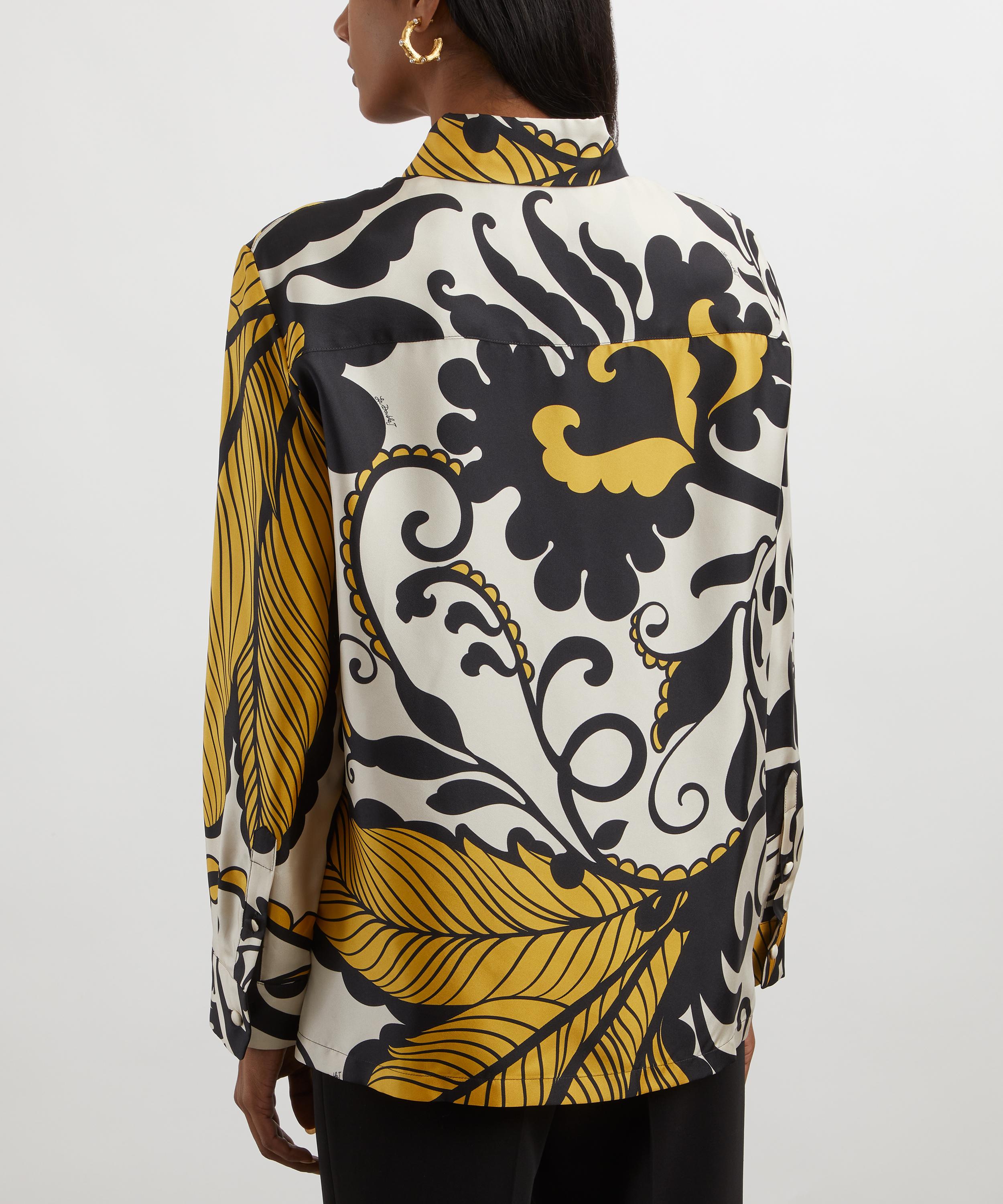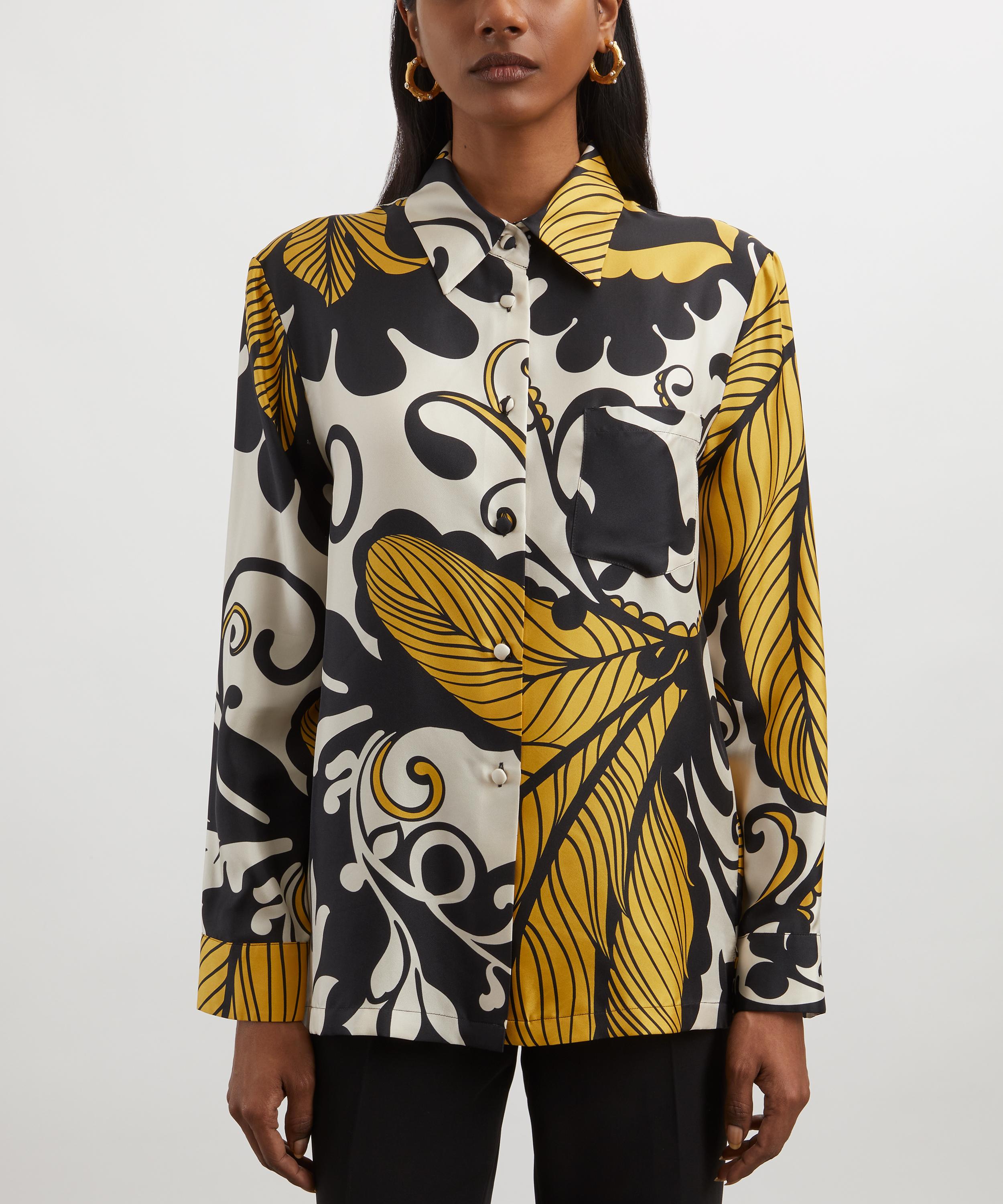 Crafted from fluid silk twill in an eye-catching all-over print, this elegant shirt boasts a relaxed, straight fit with slightly gathered long sleeves for a feminine touch, buttoned cuffs that hit at the wrist, and is complete with fabric-covered buttons.