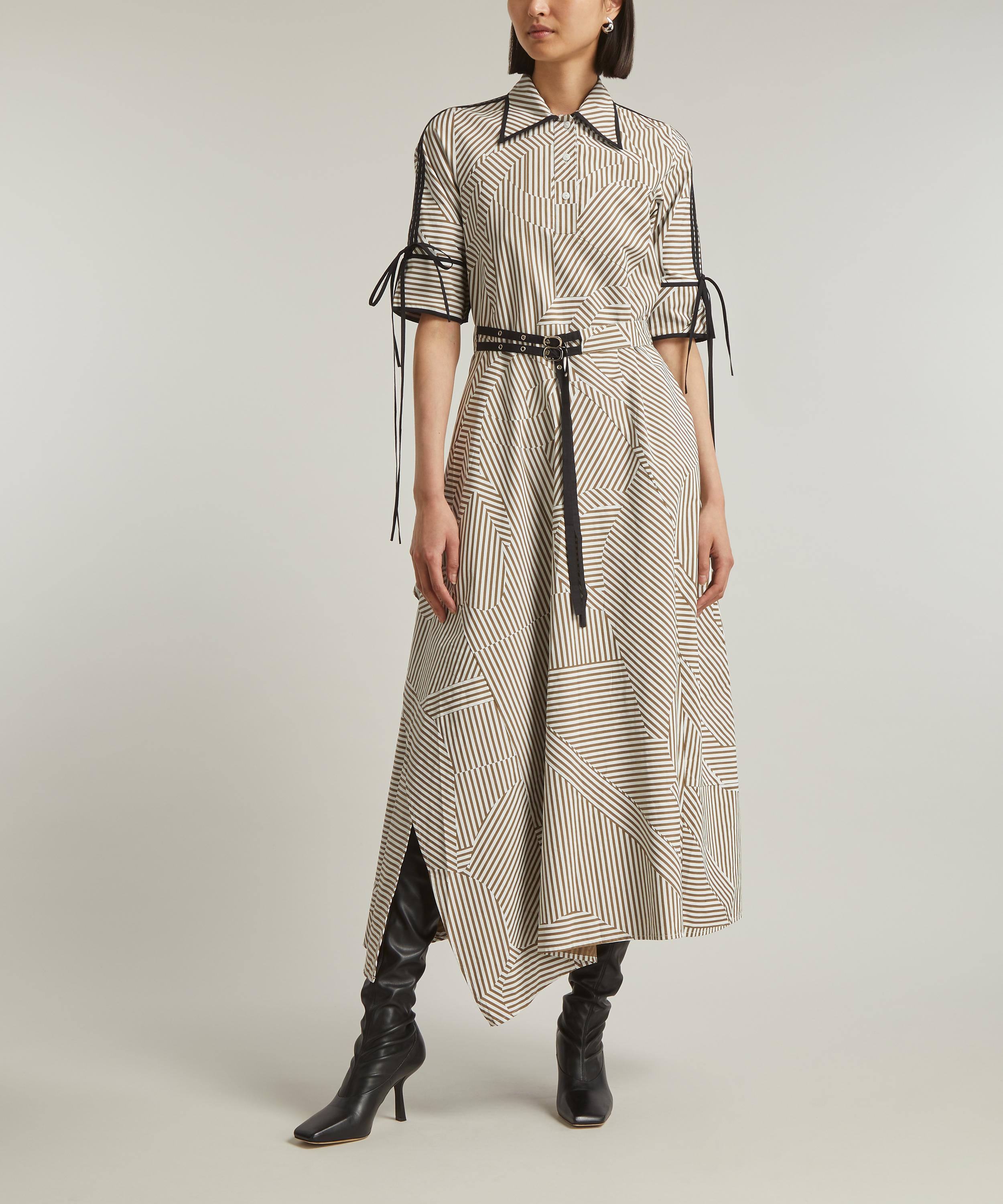 Crafted from cotton presenting an abstract striped pattern throughout, this sophisticated shirtdress is detailed with strings extending from the sleeves to the waist, creating a unique and eye-catching silhouette. A dynamic design with an asymmetric, A-line skirt, it’s cinched at the waist with a double belt.