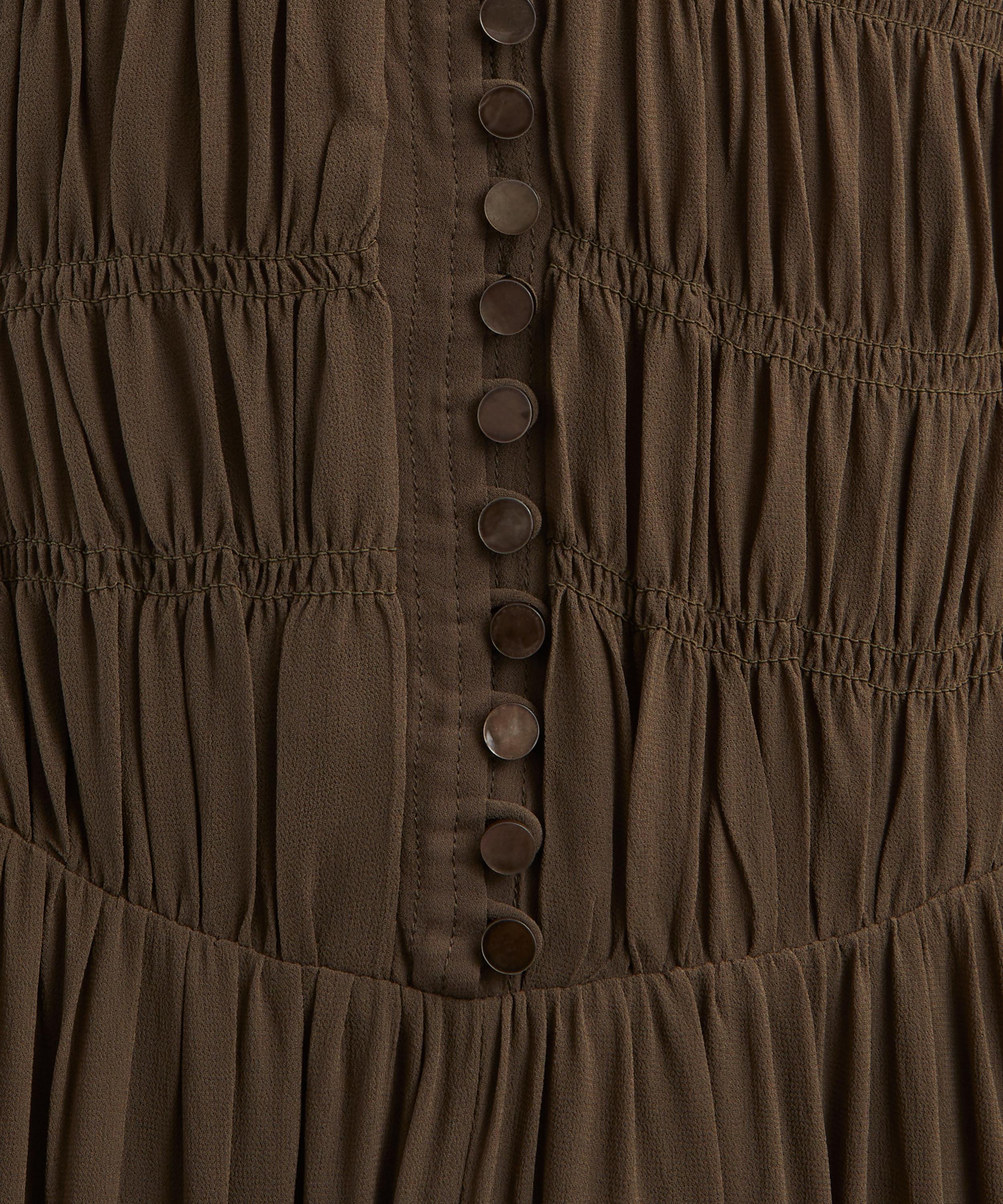 Crafted from airy georgette, the Brianne dress is cut for a relaxed fit, featuring a deep V-neckline, buttoned front, long gathered sleeves, and an adjustable drawstring waist with intricate gathering for a soft, flattering silhouette.