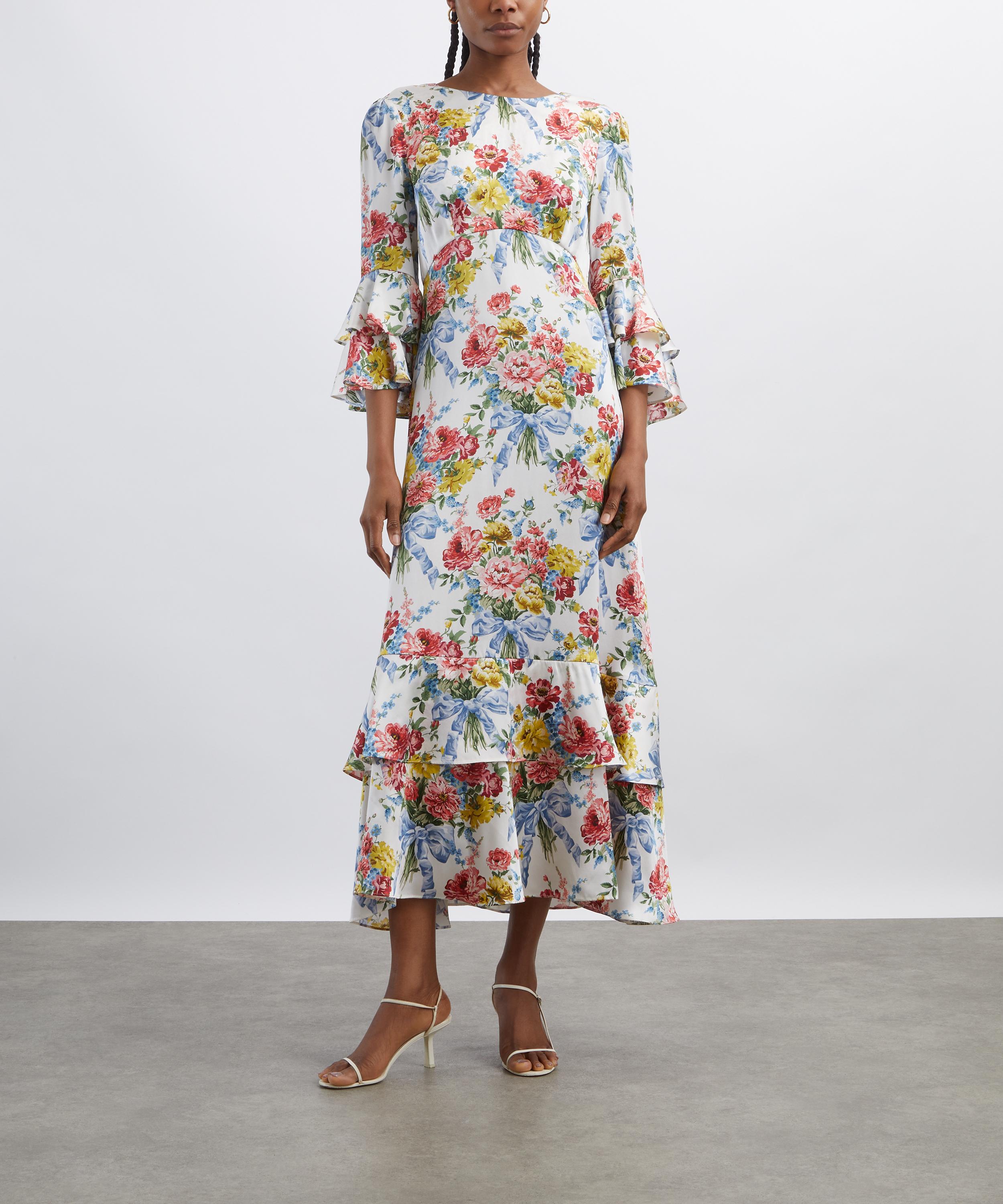 Celebrate the enduring elegance and allure of the ‘Ton with the Bow Bouquet Silk Gala Dress, featuring an exclusive print from the enchanting Liberty Fabrics & Bridgerton collection.