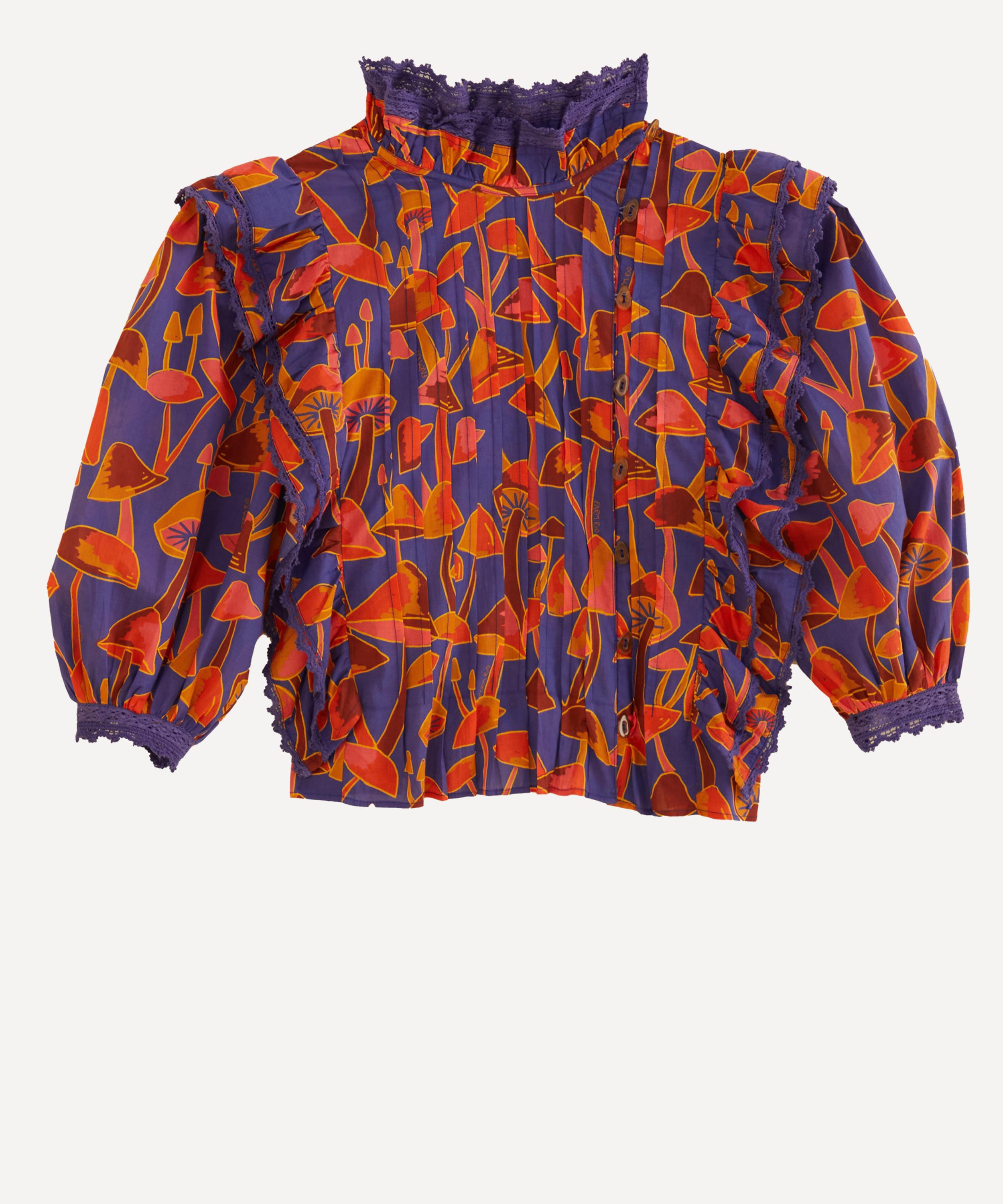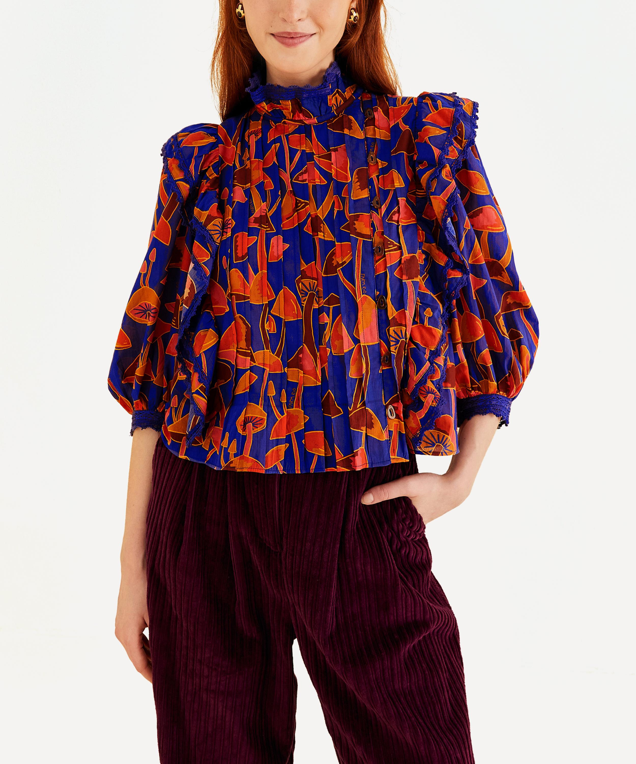 Adorned all-over in the bold Bright Blue Mushroom Sketch motif, this elevated take on the classic Edwardian-style blouse is detailed with intricate pintuck pleating detail across its front and features mid-length puff sleeves, complete with ruffles at the shoulders and neckline.
