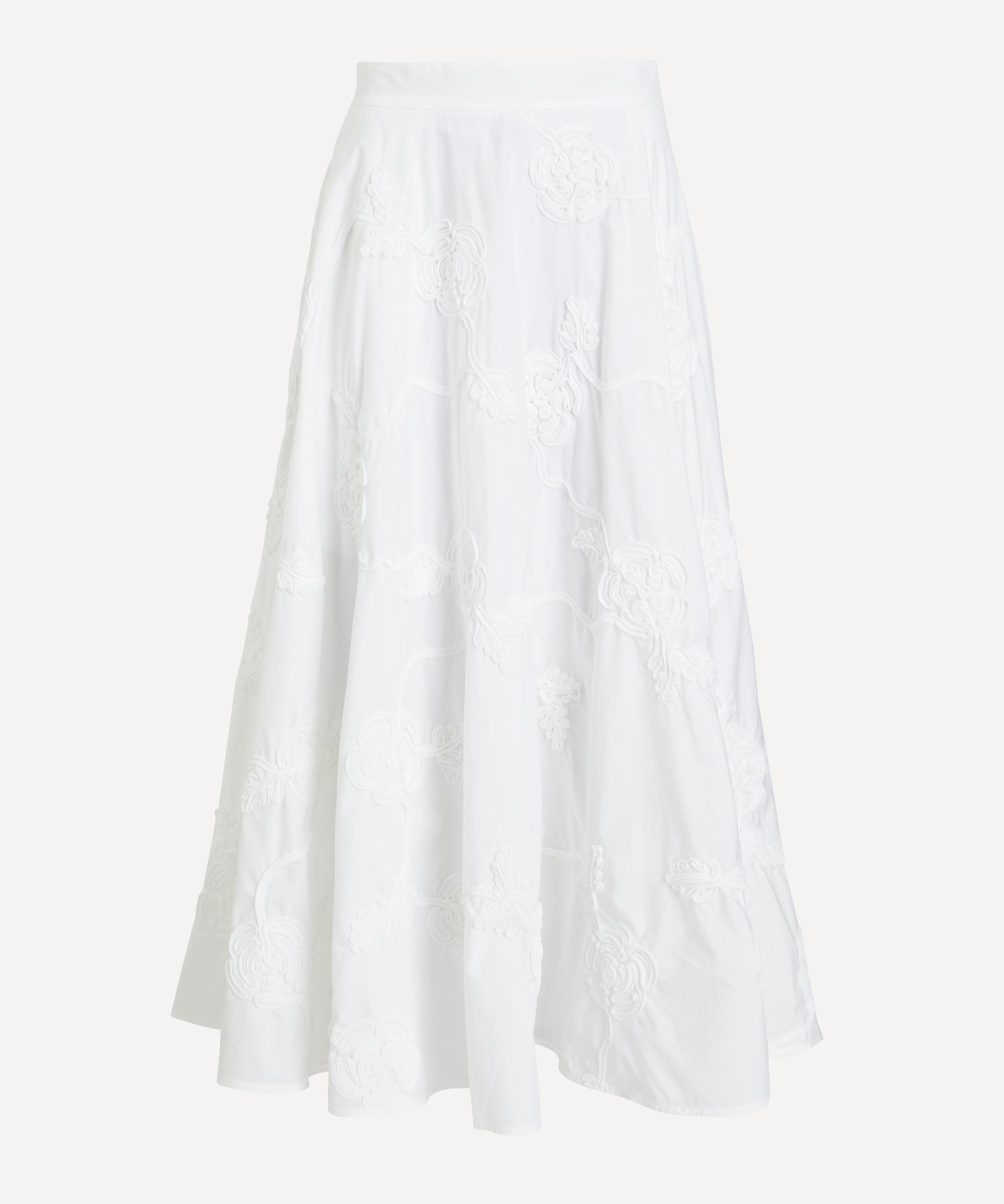 Adorned all-over with tonal floral embroidery, this cotton maxi skirt is designed with a high waist and a voluminous, flared silhouette the flows gracefully for an effortlessly elegant look.